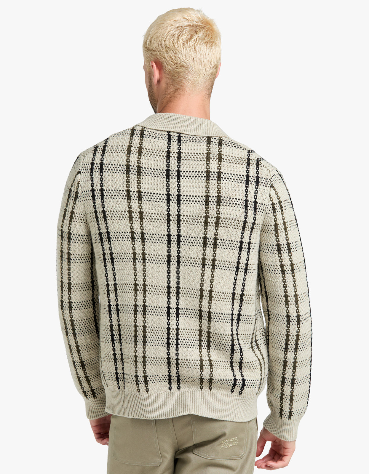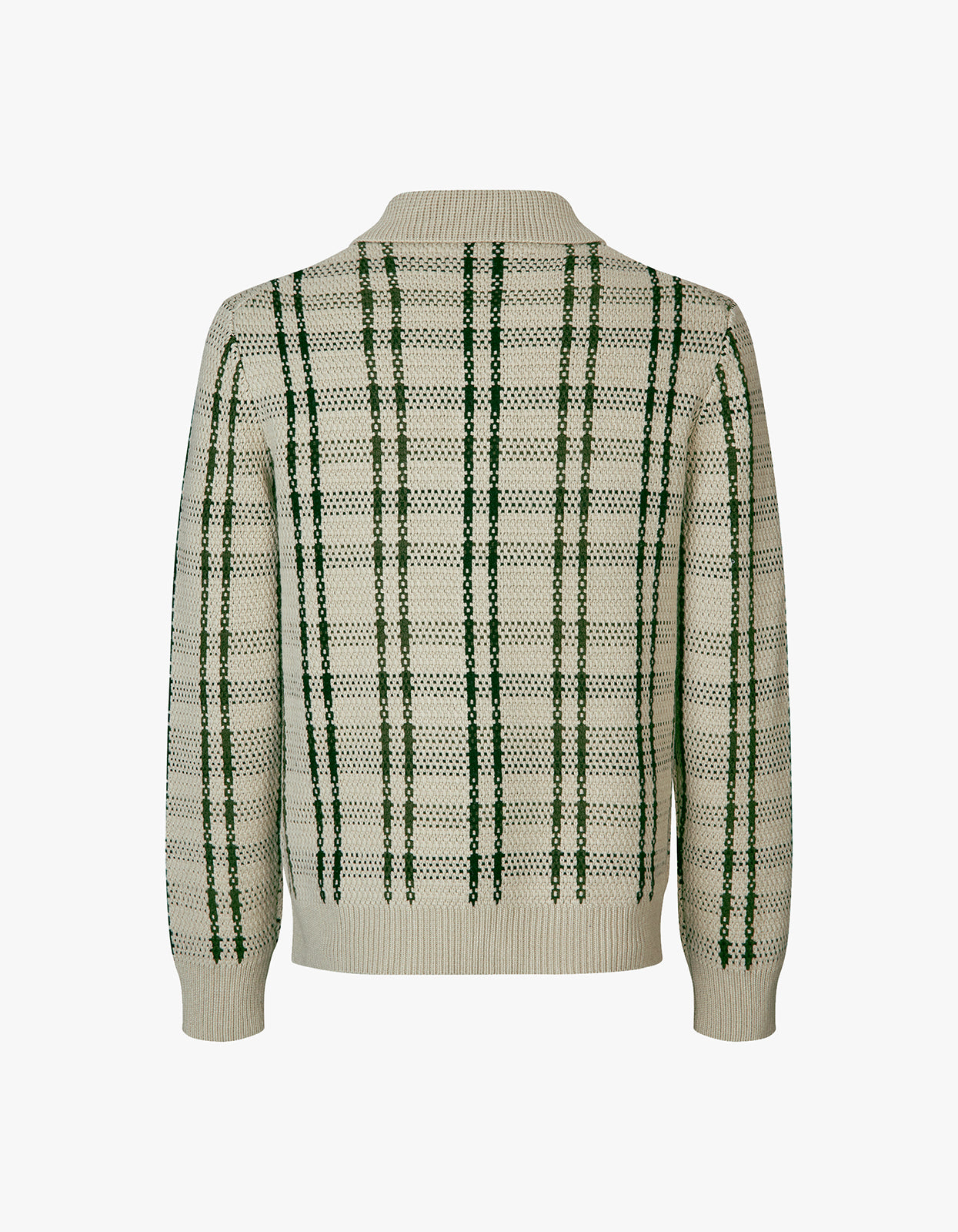 - Ribbed collar, cuffs, and hemline