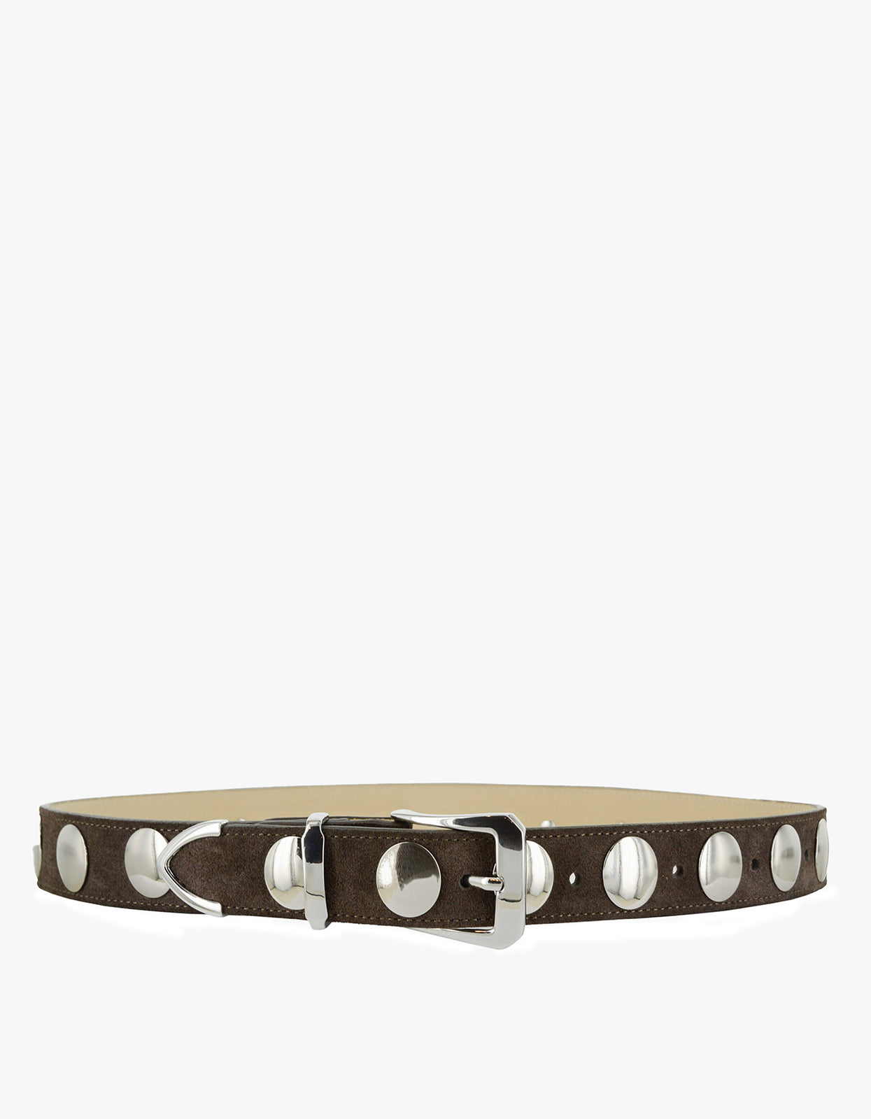 A sleek, one-size mushroom suede belt accented with polished silver hardware, offering a timeless 3 cm width and adjustable length for effortless, elevated styling.