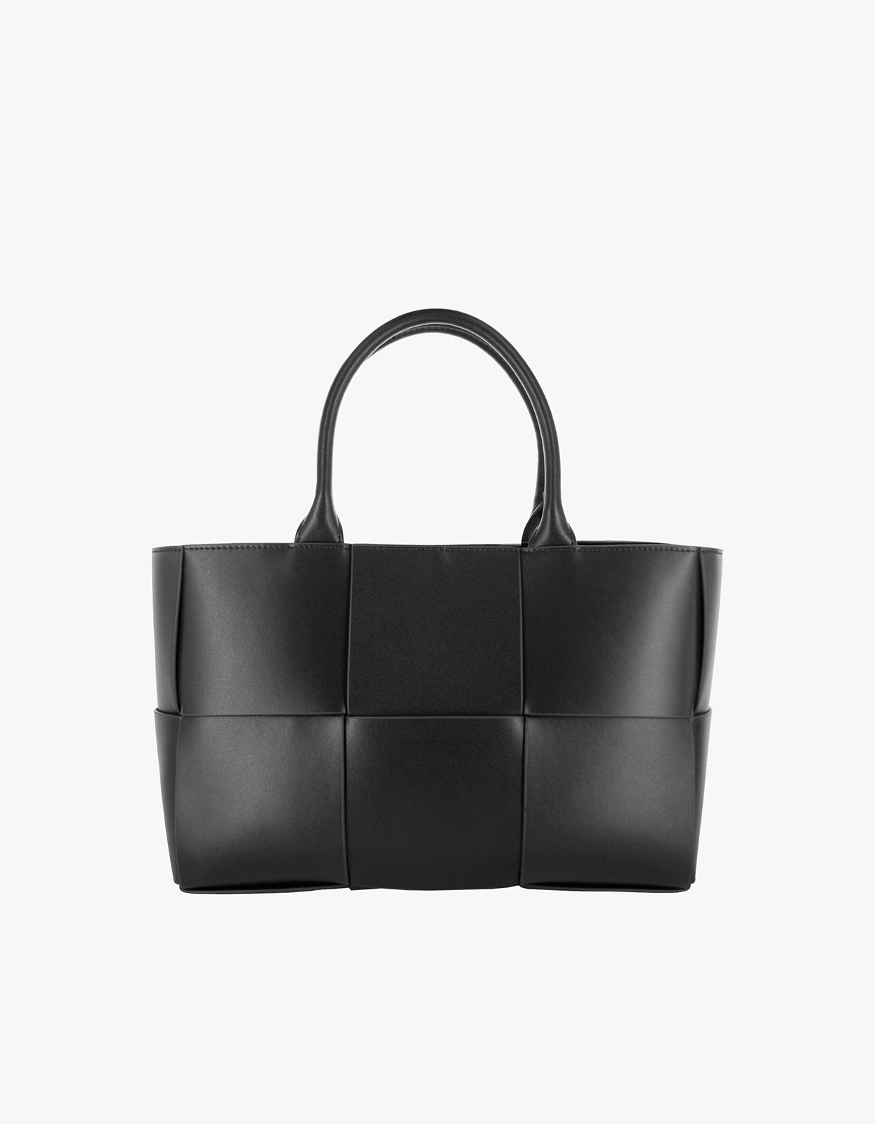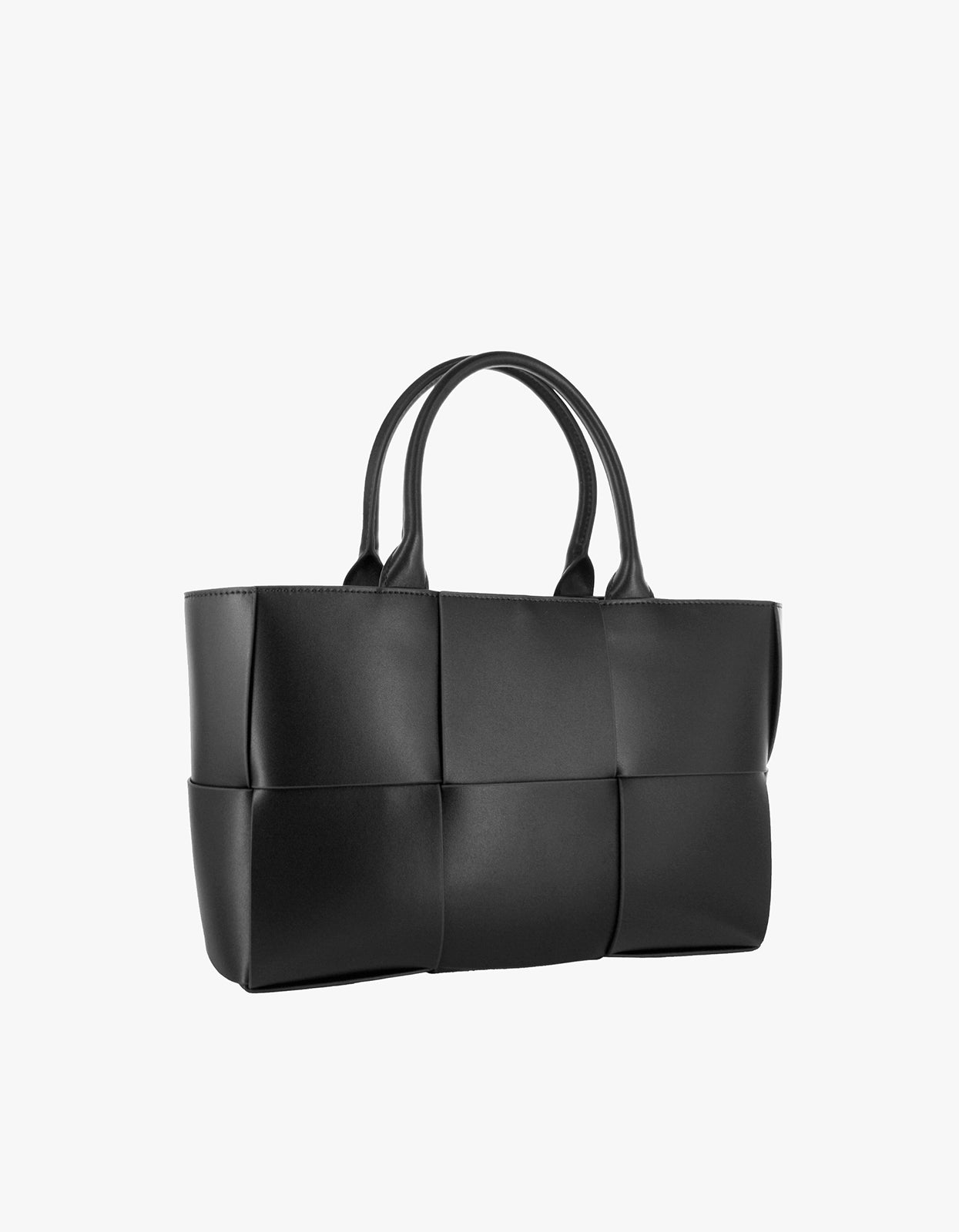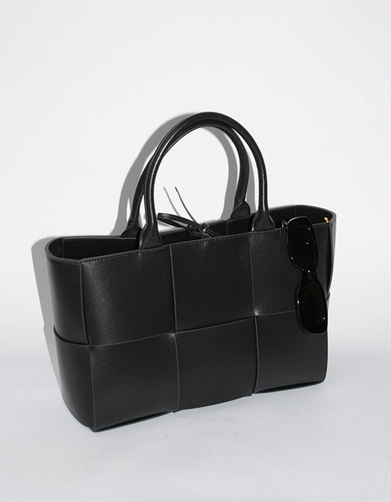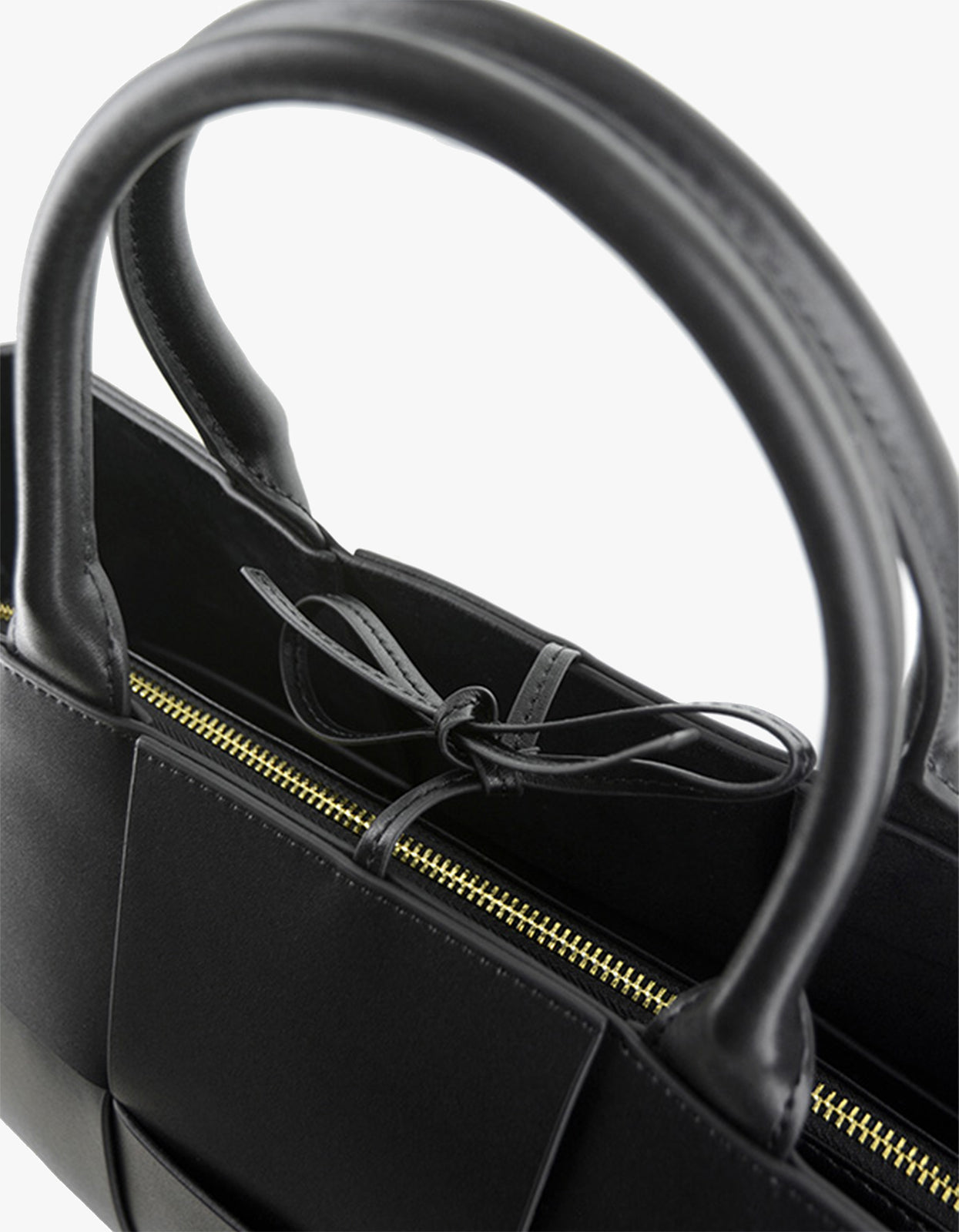 A structurally sleek ebony calf leather tote bag, featuring a tied closure, interior zipped pouch, and generous size; perfectly blending style and practicality.
