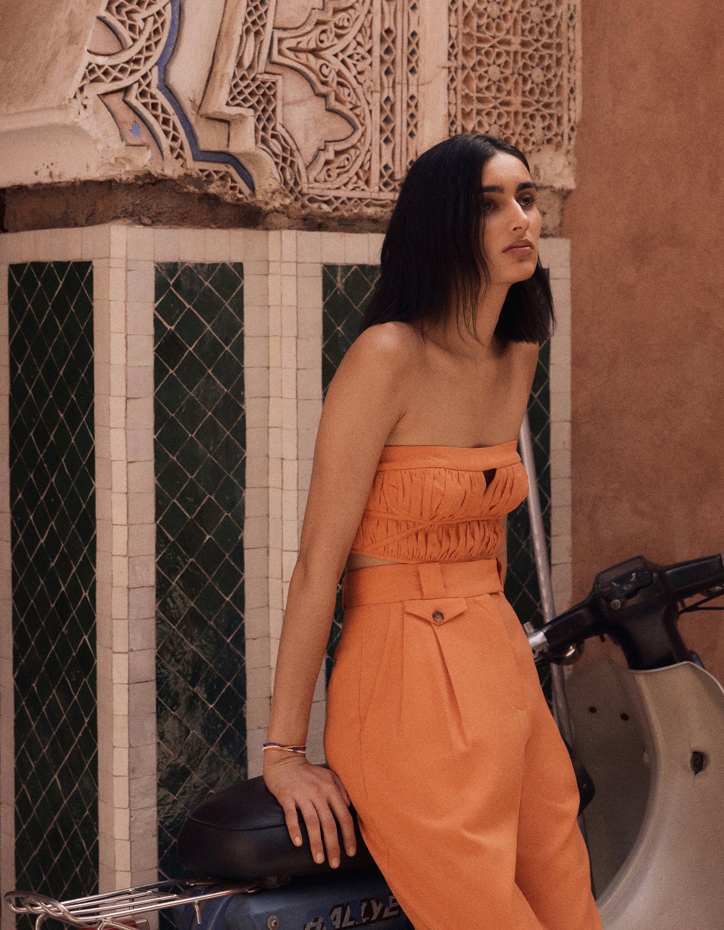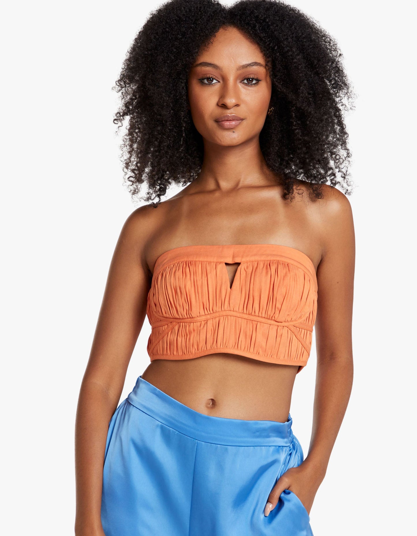 Add a little zest with the Sara Strapless Bustier via Shona Joy! A ruched bandeau that features cord detailing and a wee cut out moment in the front. The styling options are endless with this mango baby - From a denim mini to linen pants, be sure create looks upon looks this season.