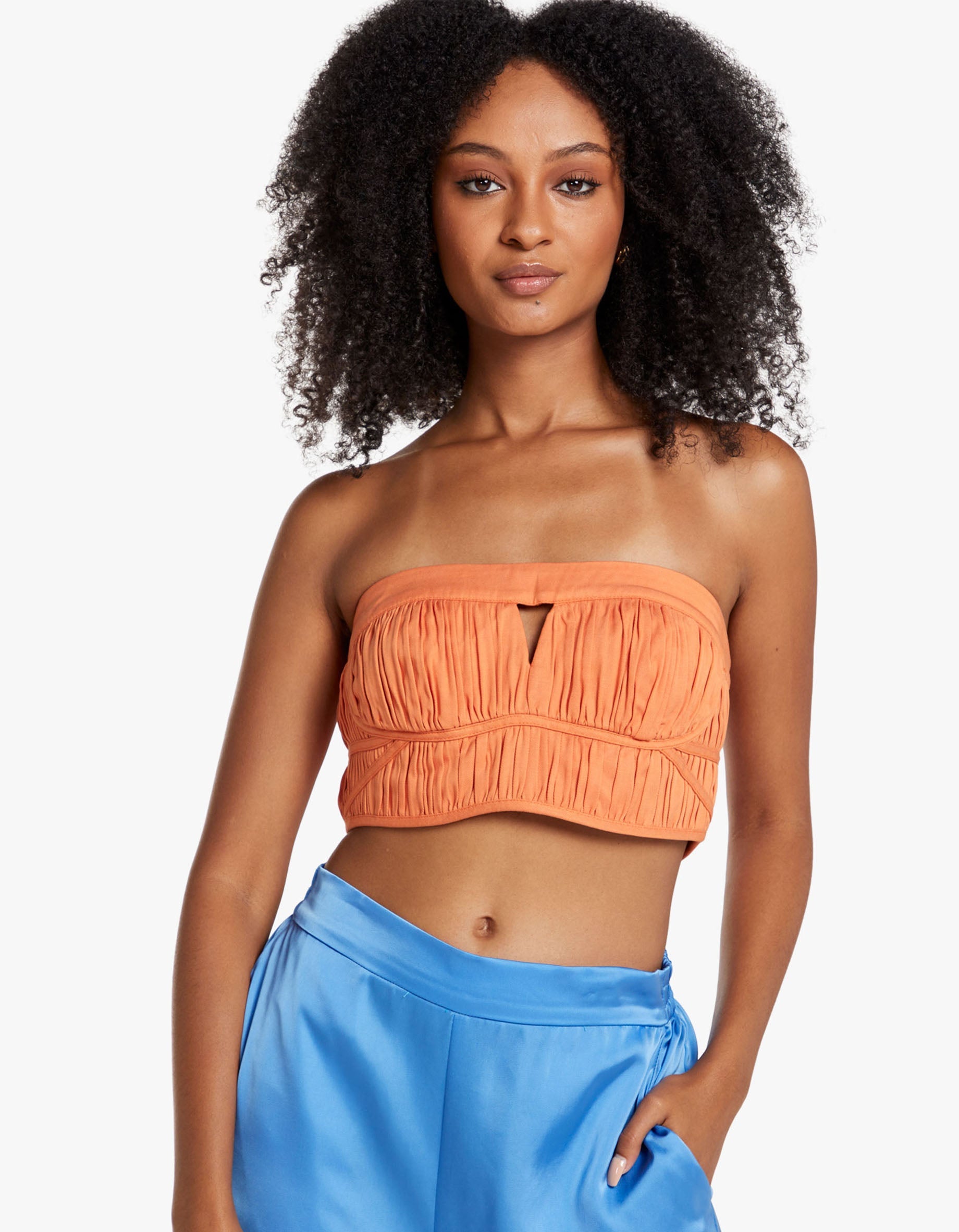 Strapless bustier Orange colourway Square neckline Ruched and corded bodice Cut out detailing at front bust Invisible zip closure at back Medium weight, non-stretchy woven Designed in Australia Style guide: Pair with boyfriend denim jeans and heels