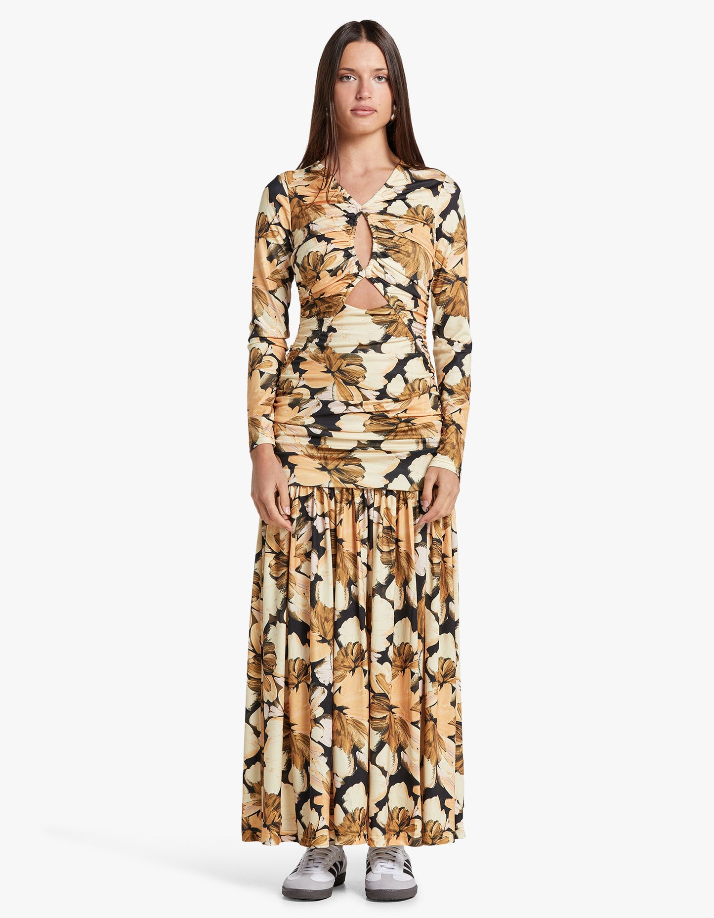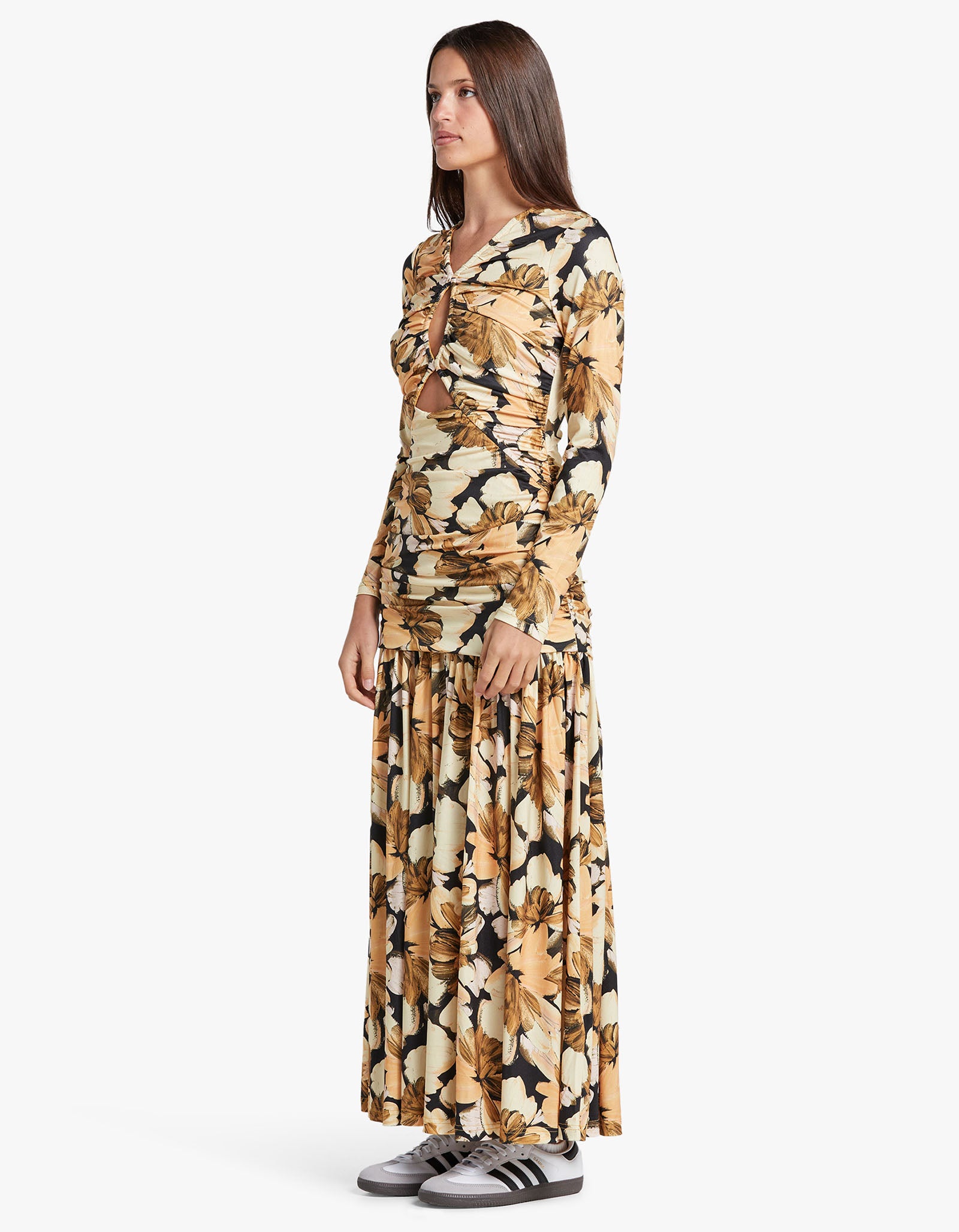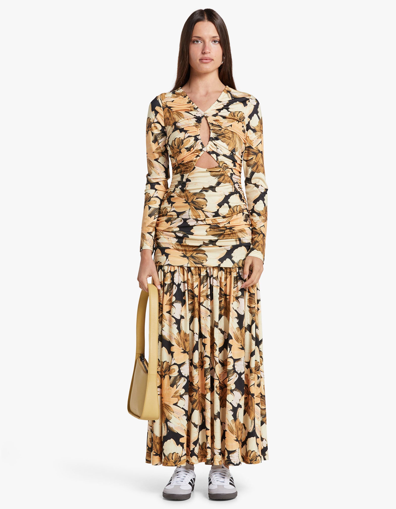 How beaut is this vintage floral print - This maxi number is a truly unique piece that will take you from a long ladies lunch to an autumn wedding. With a keyhole cut out design at the bodice, ruching at the body and a gathered a-line skirt from the hips down, complete the look with a pair of tan heels and dainty gold jewels for a stunning wee moment.