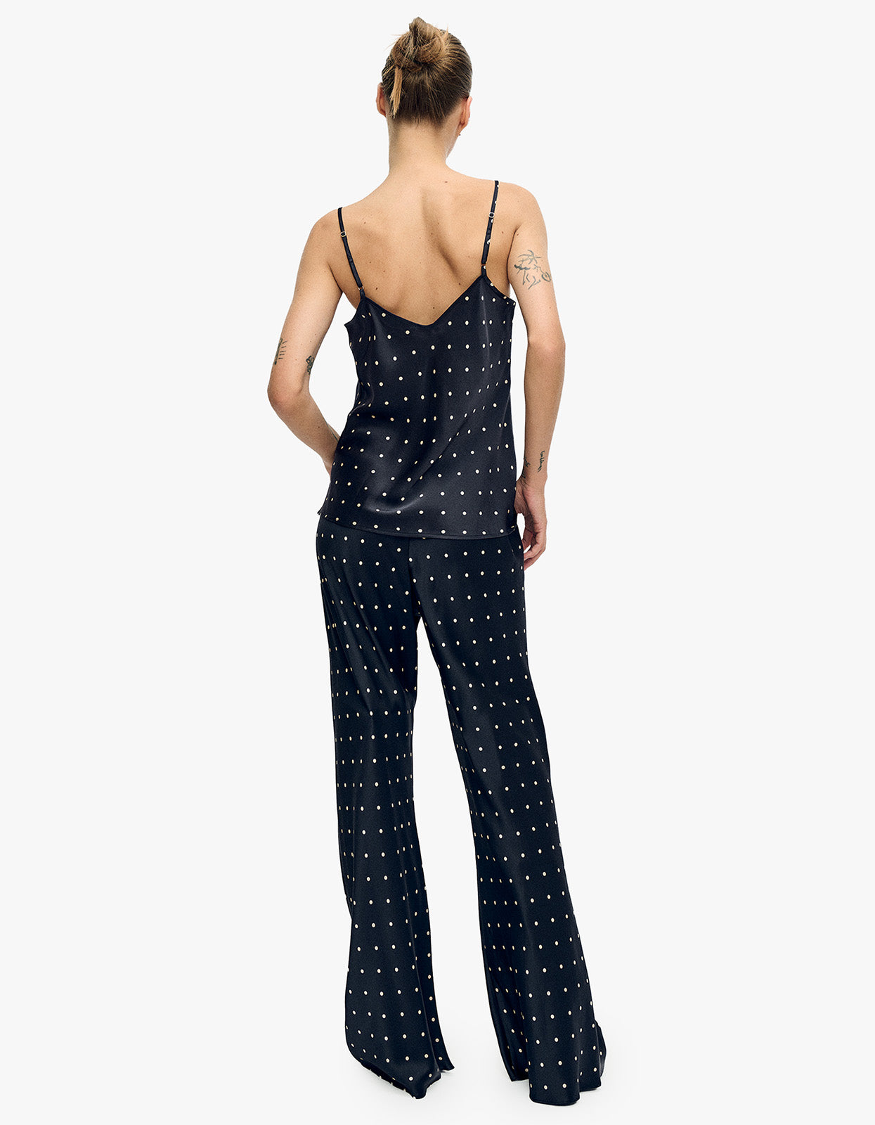 The Bias Cut Cami is crafted from 16MM silk satin for an incredibly soft, fluid feel against your skin. Cut on the bias for a flattering drape, this cami features a feminine V-neckline and adjustable straps with signature metal hardware for a customized fit. The small polka dot print adds a playful touch to this timeless design, while internal French seams ensure a refined, quality finish. Perfect for layering or wearing solo, it's the versatile piece your wardrobe has been waiting for.