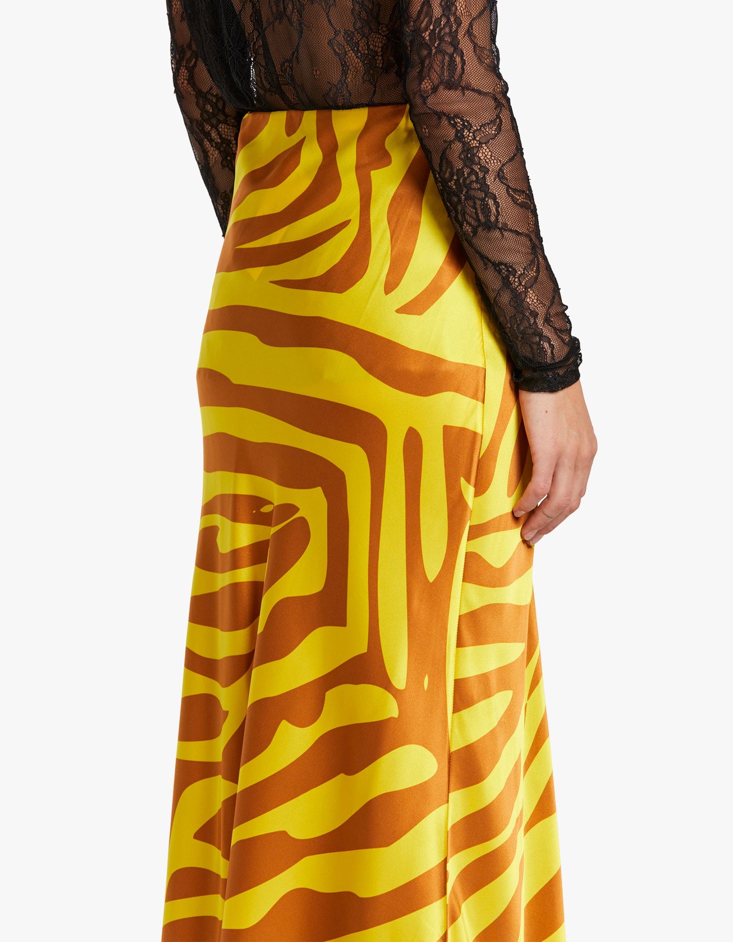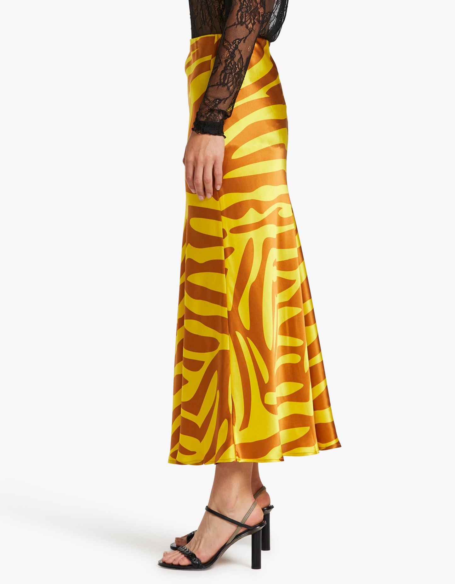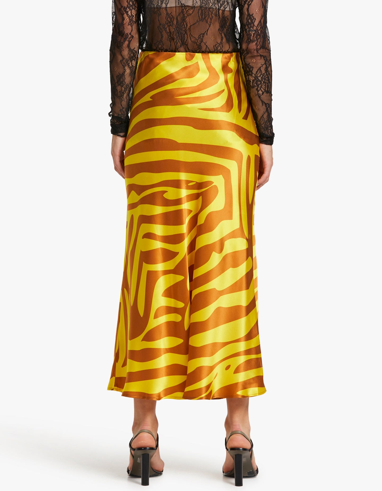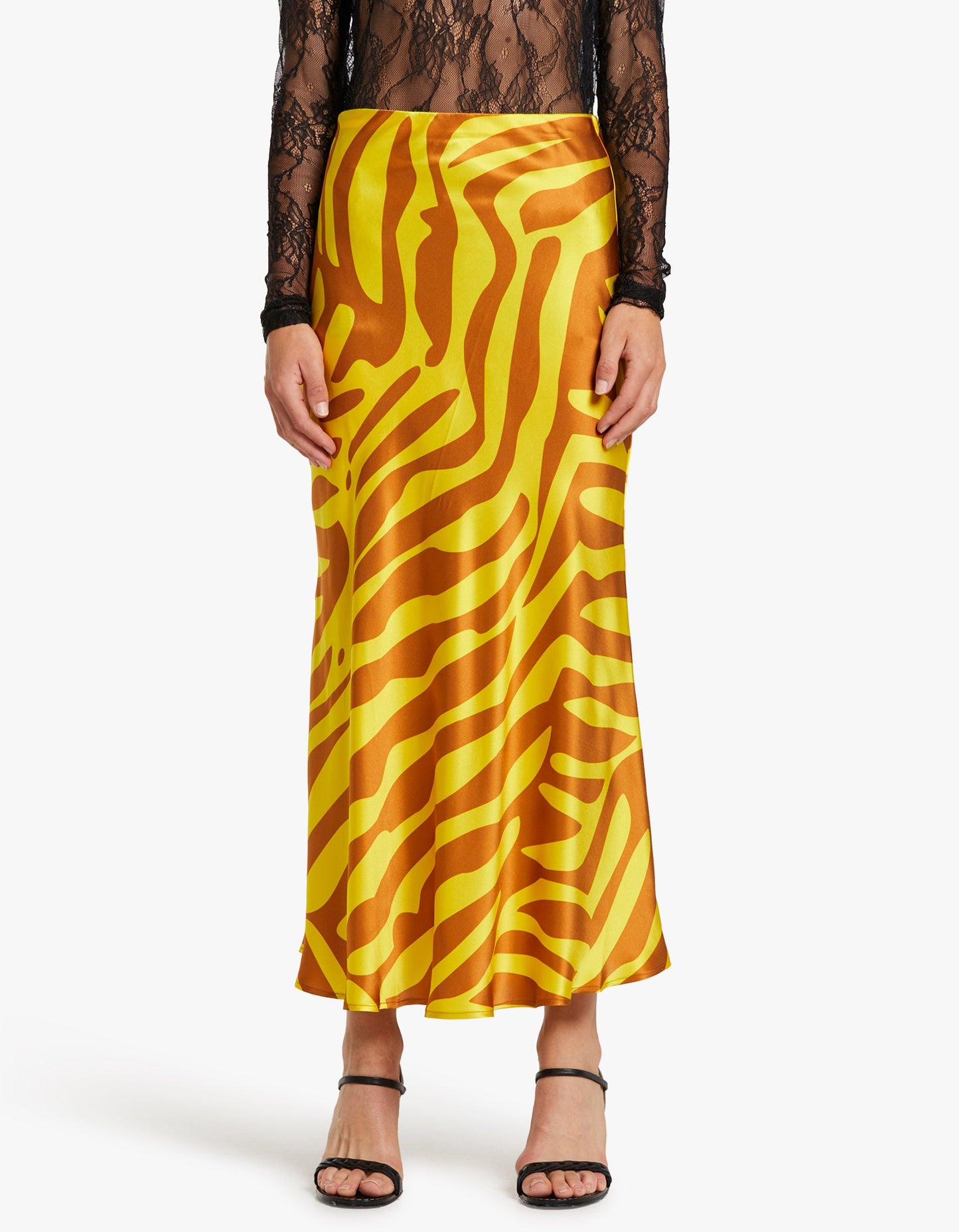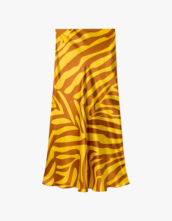 Midi skirt Bold, elegant, timeless Multi colourway Yellow and orange tiger print High rise Elasticated waist Bias cut Regular fit 100% Silk Designed between Australia and Canada Creative Direction by Katie Kolodinski Style guide: So easy with a white tee and sneakers for an outfit that will turn heads.