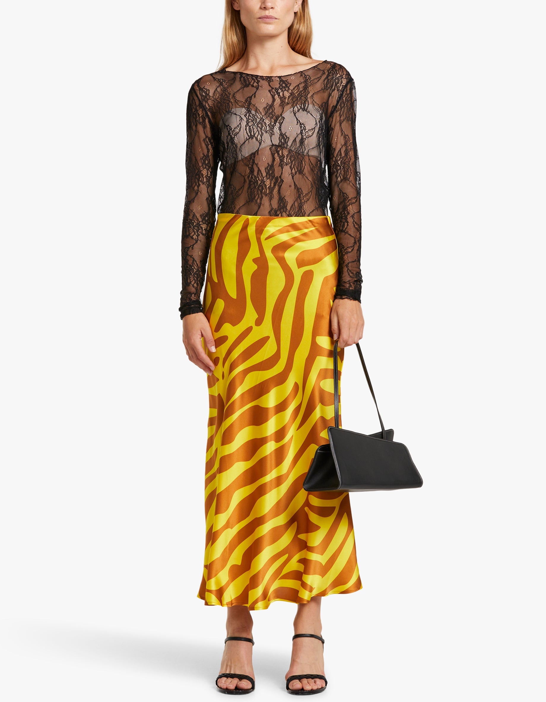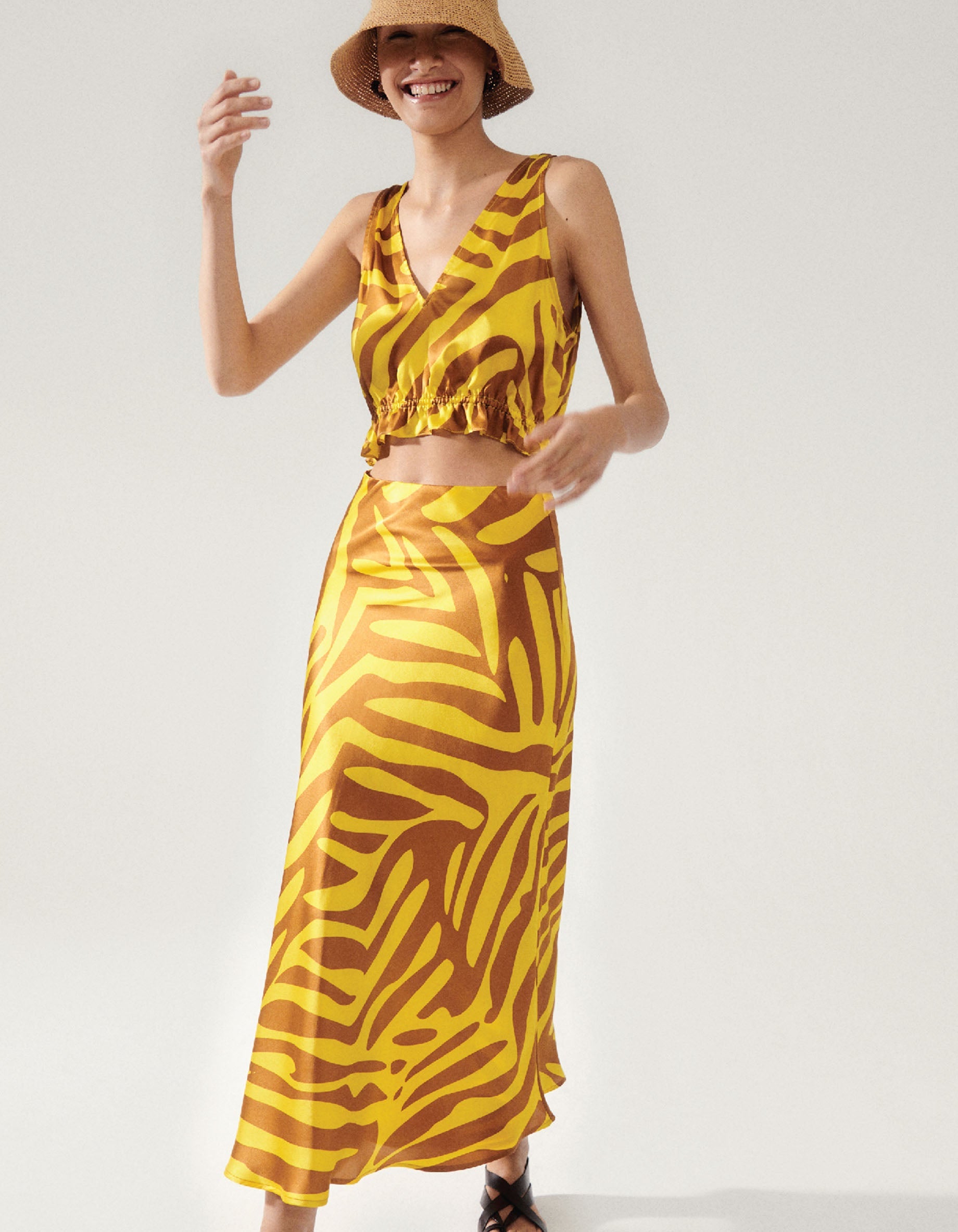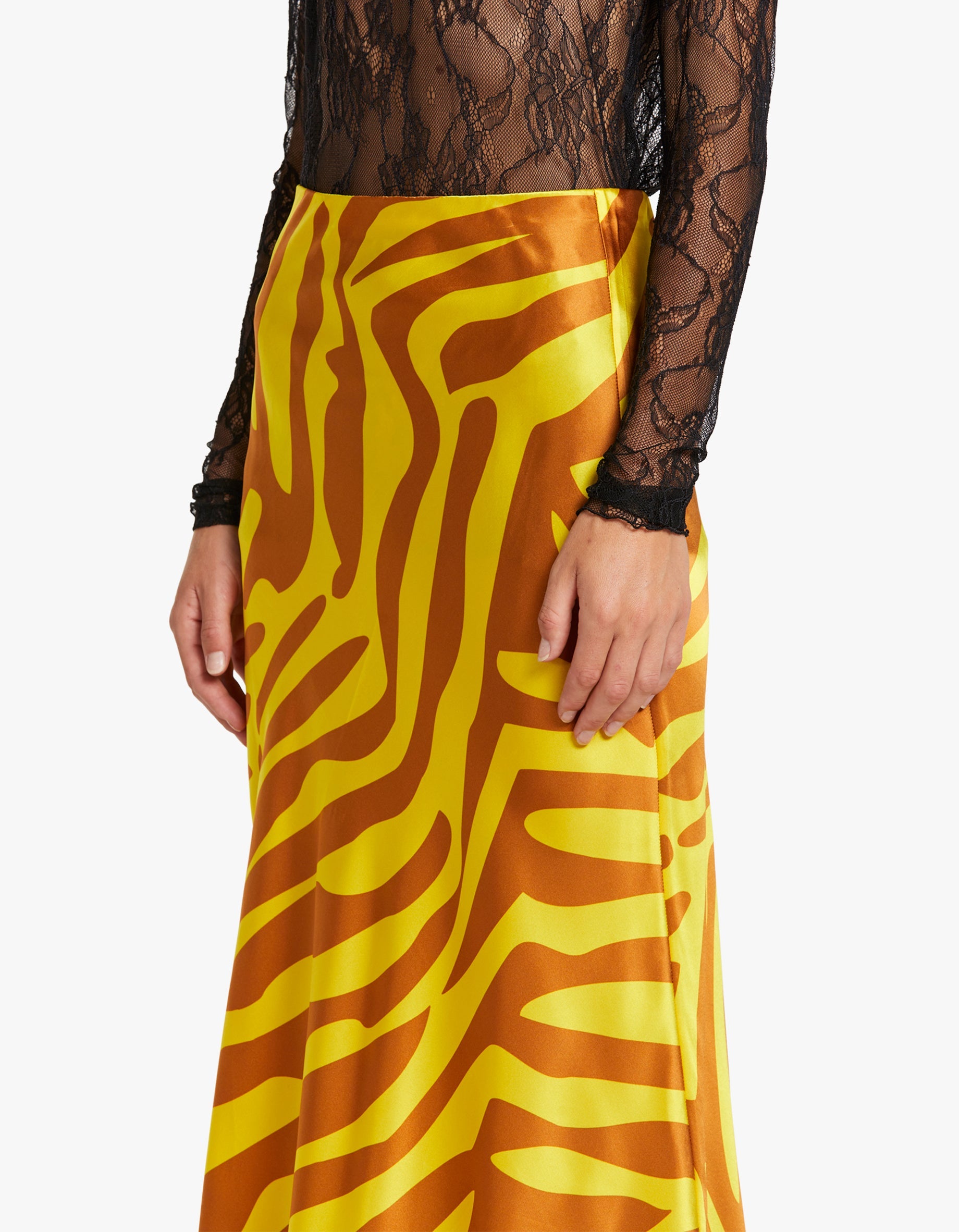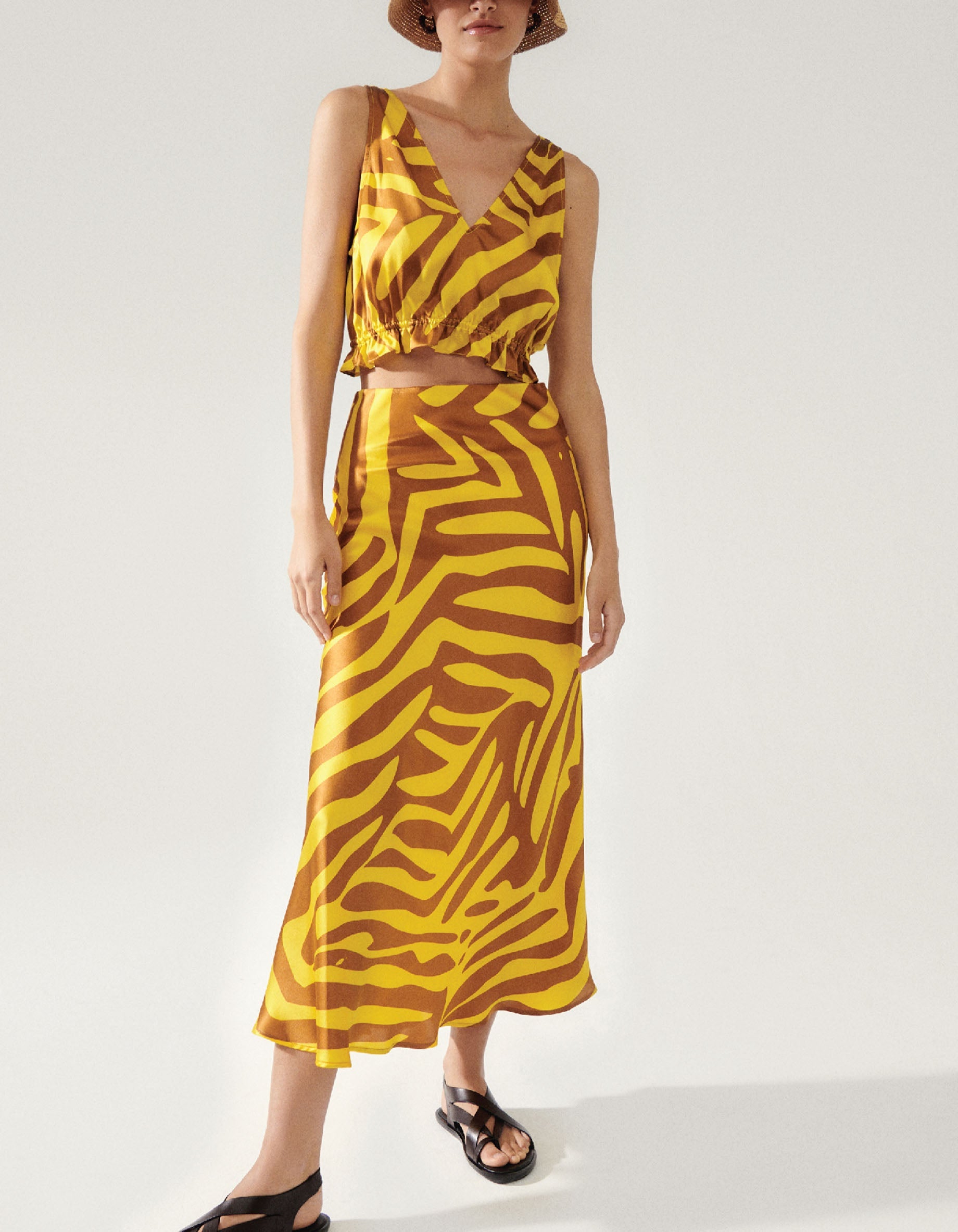 Midi skirt Bold, elegant, timeless Multi colourway Yellow and orange tiger print High rise Elasticated waist Bias cut Regular fit 100% Silk Designed between Australia and Canada Creative Direction by Katie Kolodinski Style guide: So easy with a white tee and sneakers for an outfit that will turn heads.