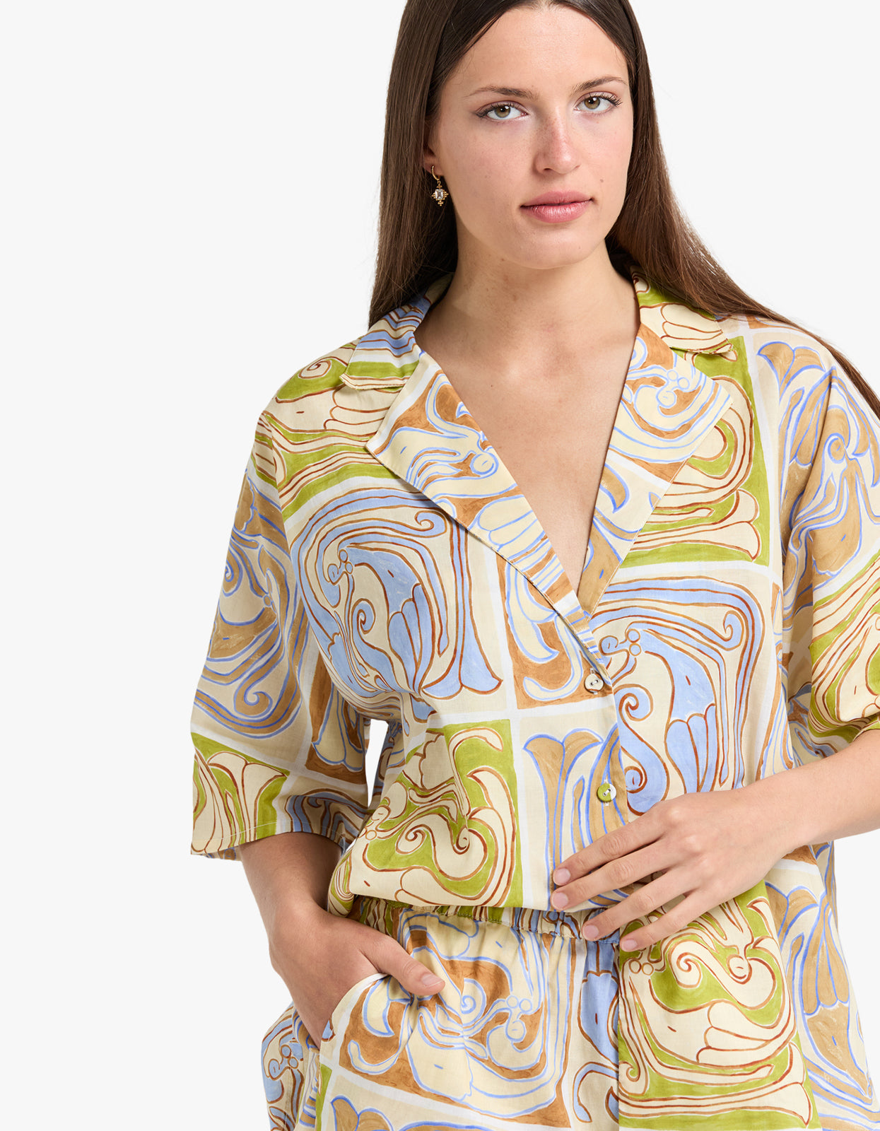 This versatile set can be worn together or separately, offering a relaxed and loose fit. The 'Siren' artwork, inspired by the mysterious creatures of the ocean, is featured in a multi-toned patchwork of pastel hues for a truly elegant and exclusive look.