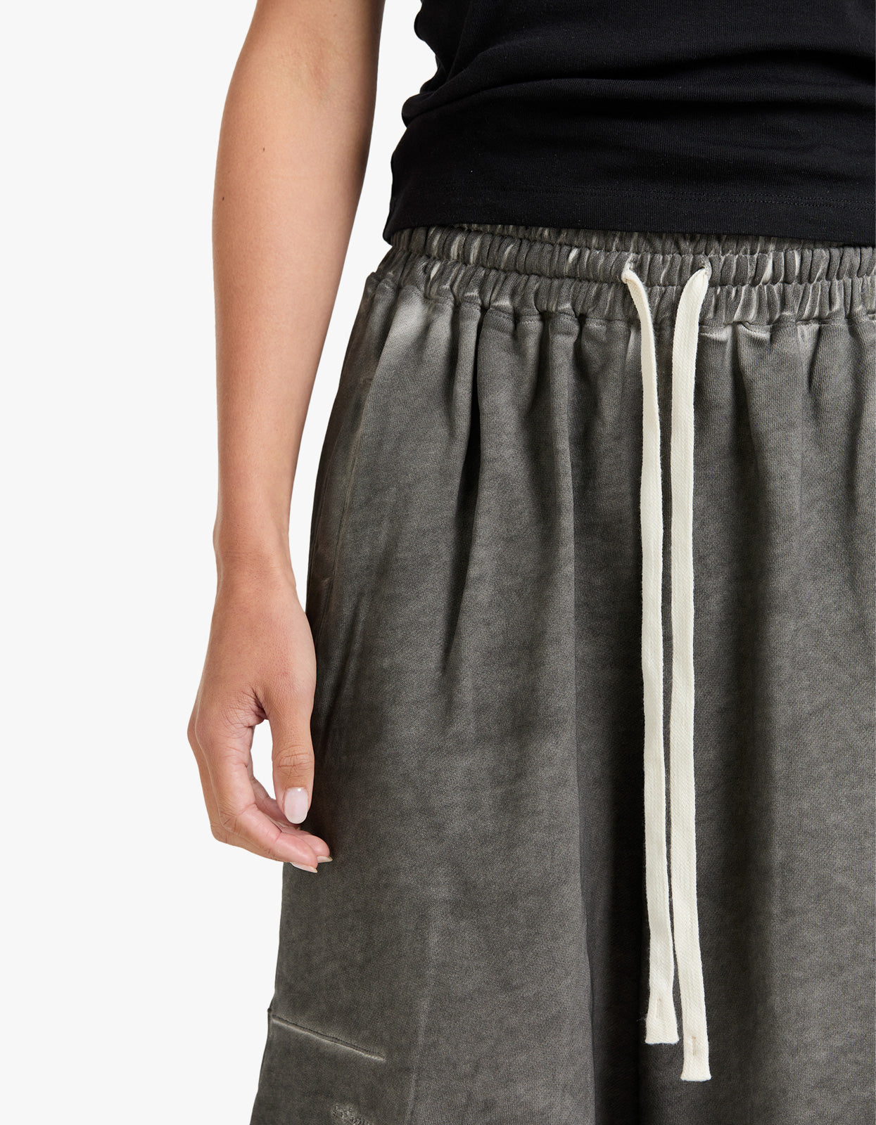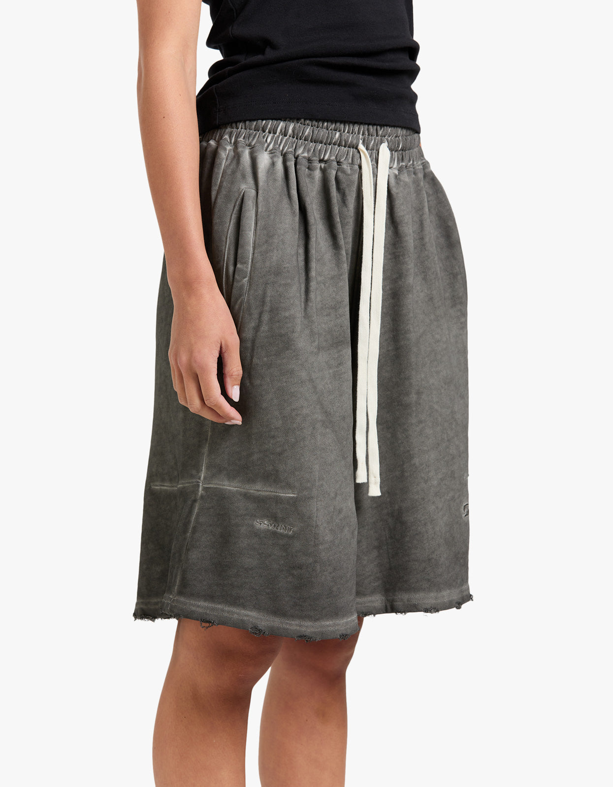 The extended length and raw distressed hem create an intentional, refined aesthetic, while the adjustable drawstring waist and functional side pockets ensure practical everyday wear. Crafted for movement and relaxation, these versatile shorts transition seamlessly from home to casual outings, offering the perfect balance of laid-back elegance and wearability.