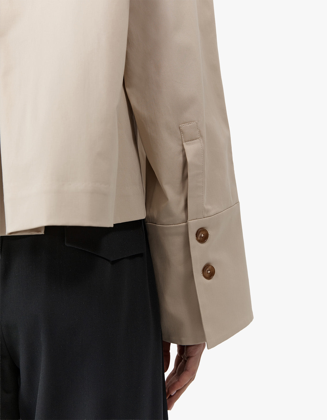 Designed with a collared neckline and subtle tab detail, this cropped jacket features concealed front buttons for a clean, uninterrupted line. Raglan sleeves and elongated buttoned cuffs soften the tailored shape, while a center-back box pleat adds movement and ease. With front welt pockets and an unlined construction, this versatile layer is perfect for effortless styling over everything from dresses to denim.