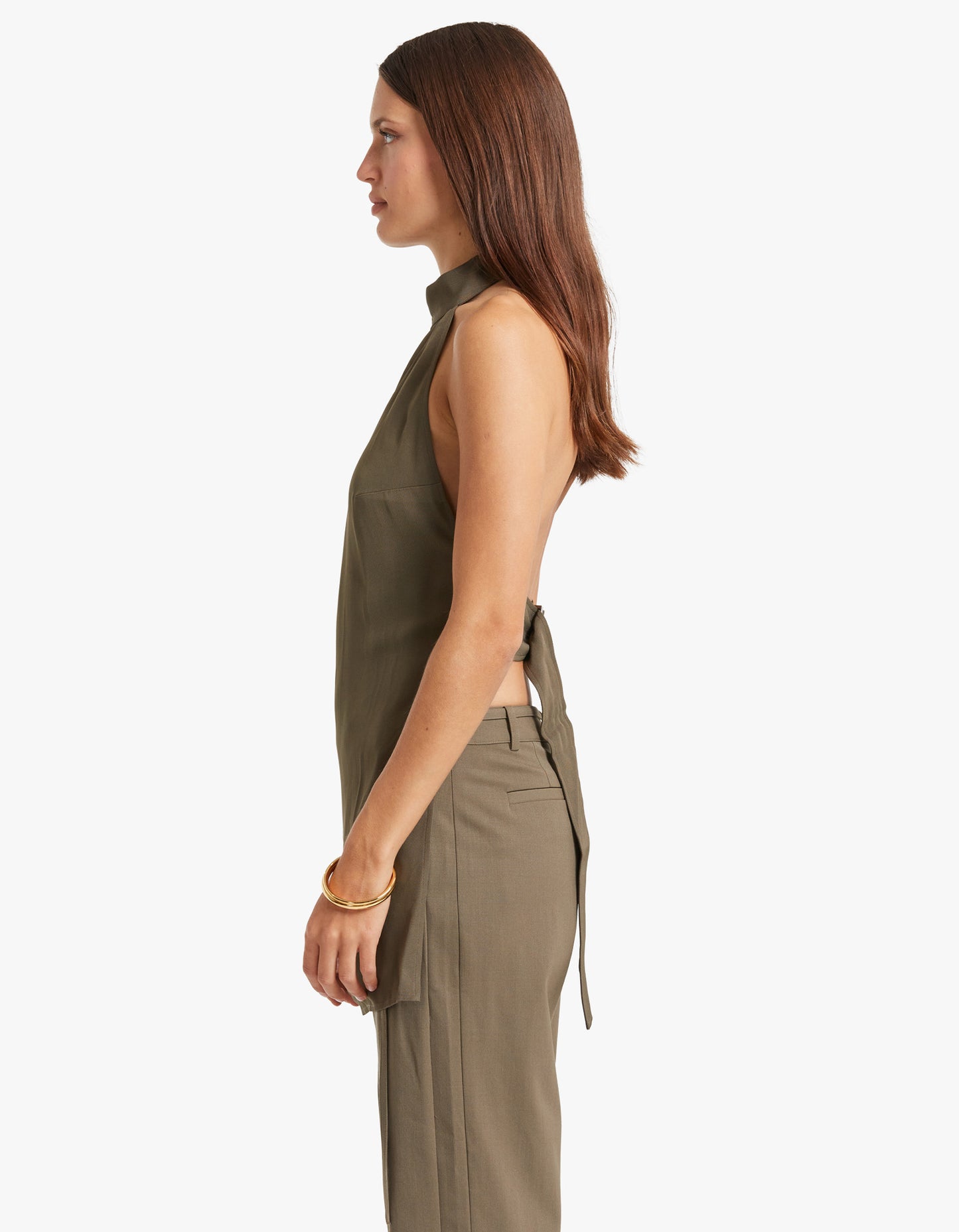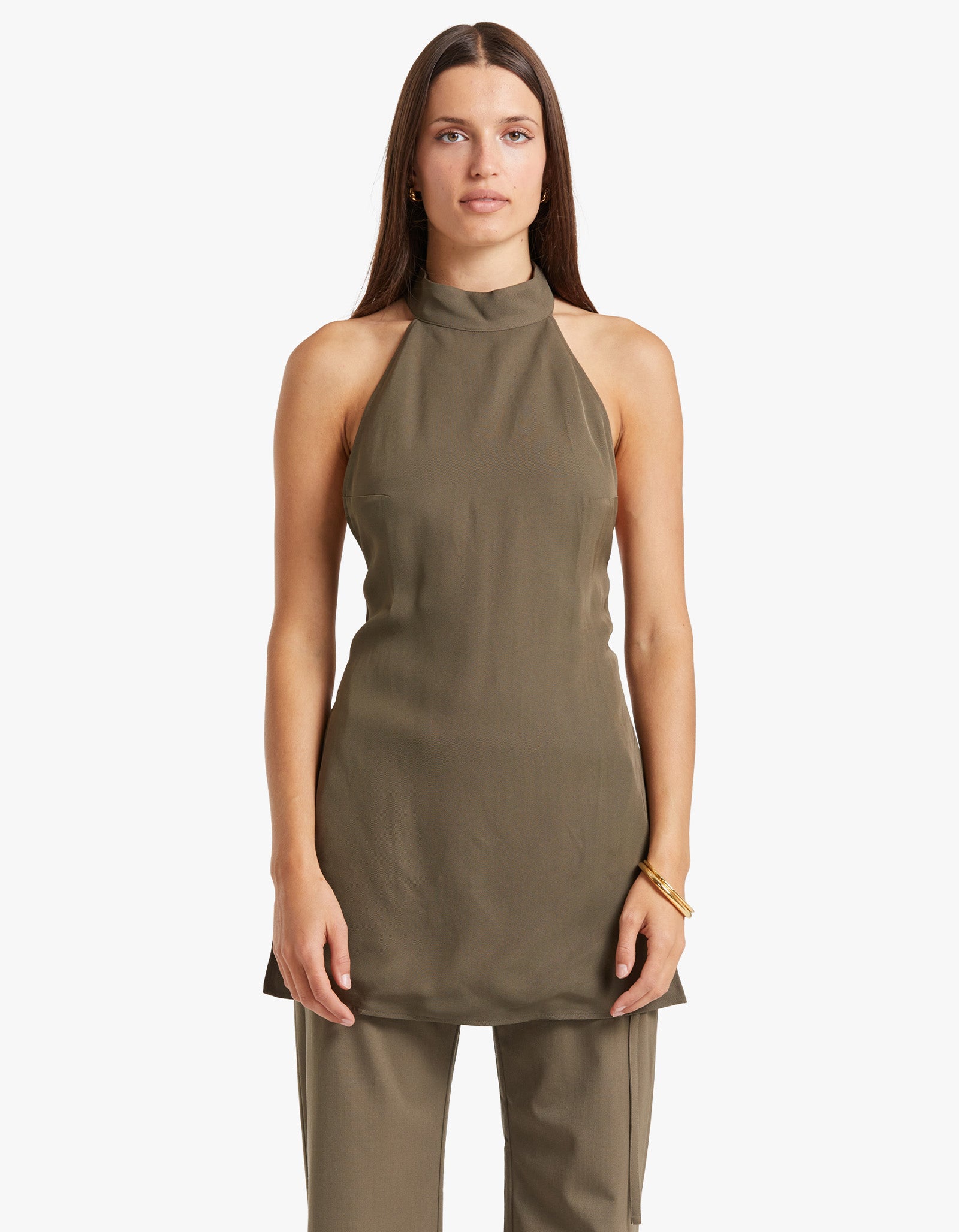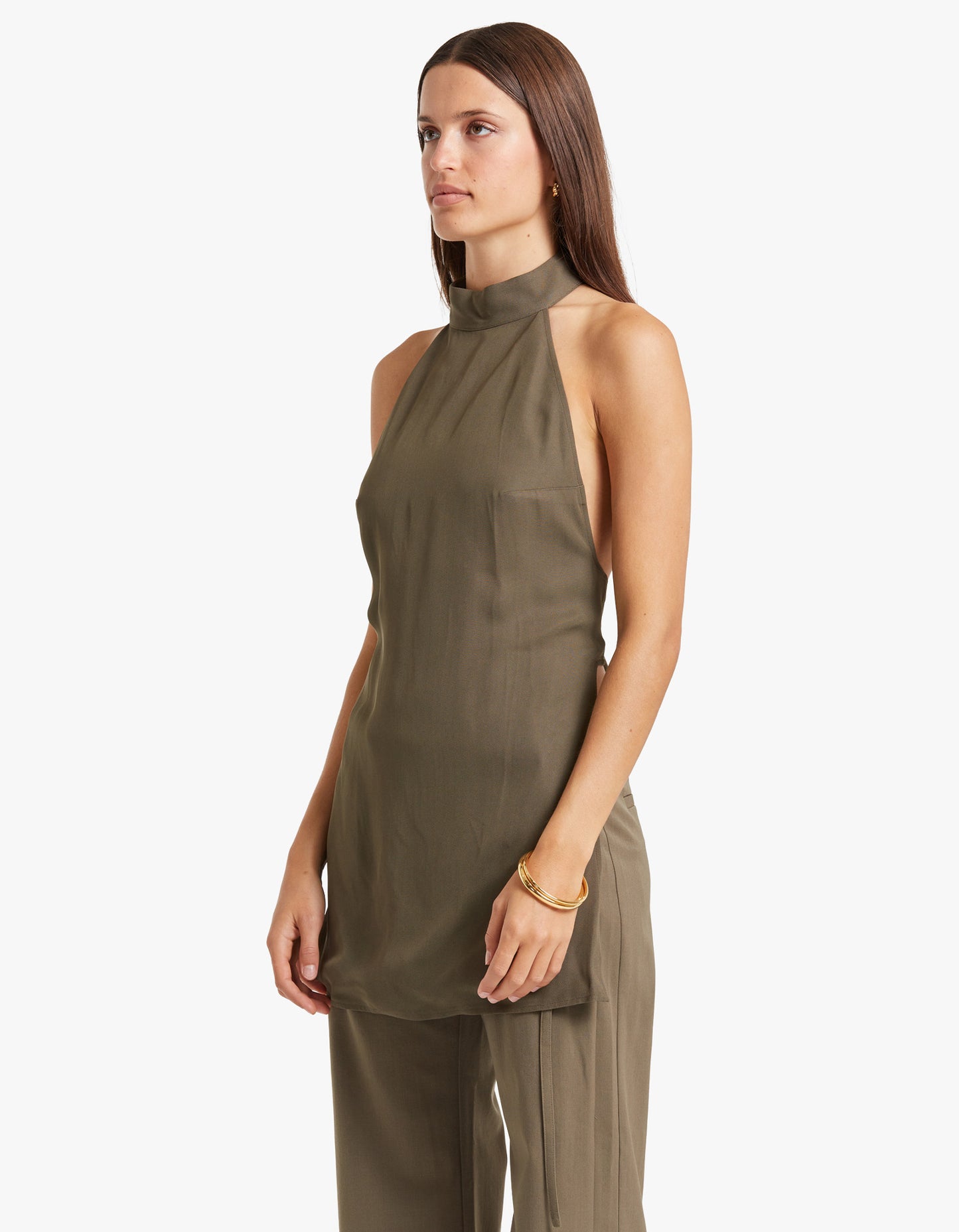 Elegant and understated - The High Neck Tunic via St. Agni features a stand collar, backless design, and adjustable D-ring waist strap detailing at back. Designed to transition seamlessly from day to night, this piece boasts an interplay between luxurious fabrication and bare skin.