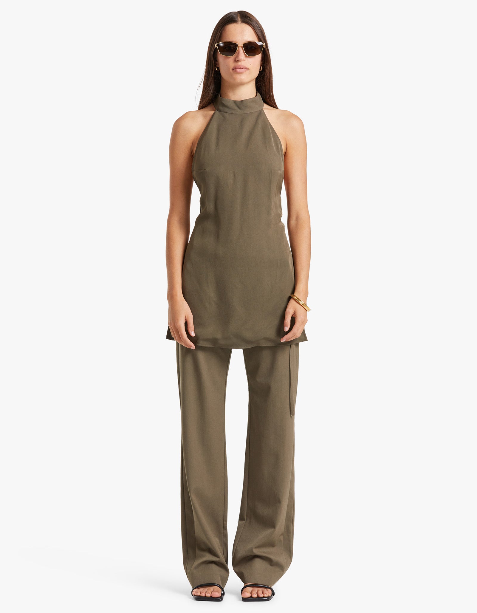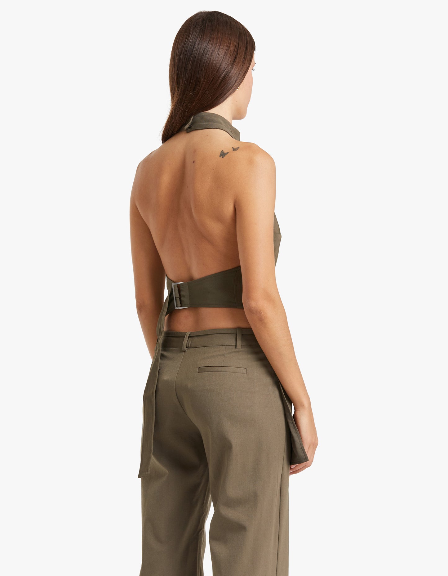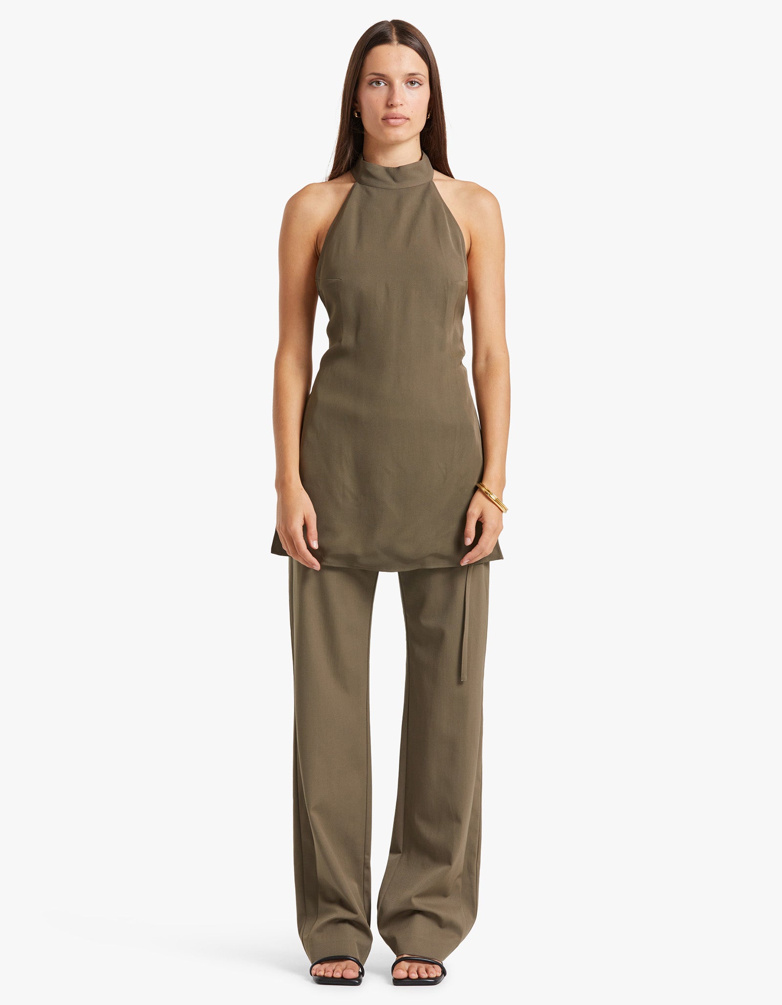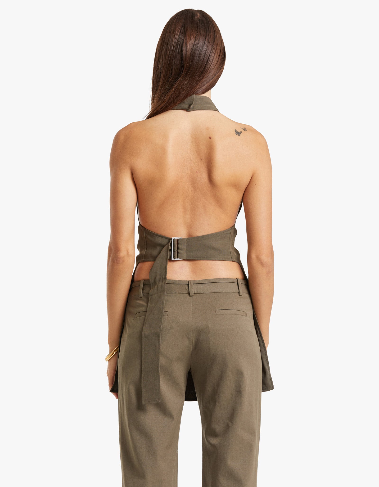 Elegant and understated - The High Neck Tunic via St. Agni features a stand collar, backless design, and adjustable D-ring waist strap detailing at back. Designed to transition seamlessly from day to night, this piece boasts an interplay between luxurious fabrication and bare skin.