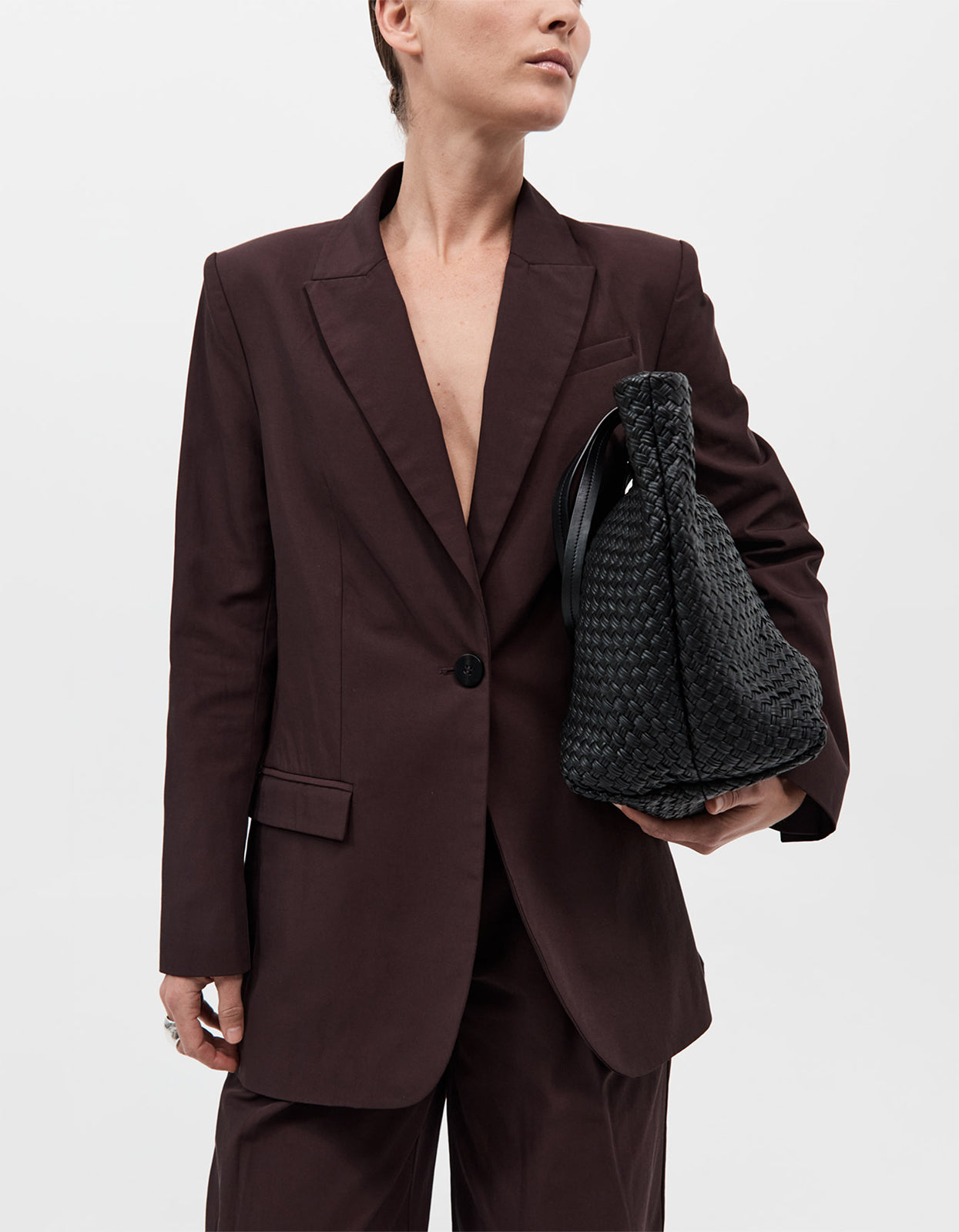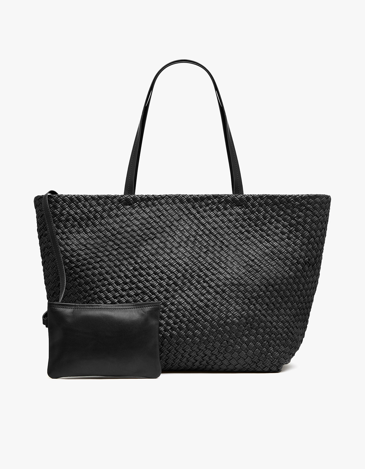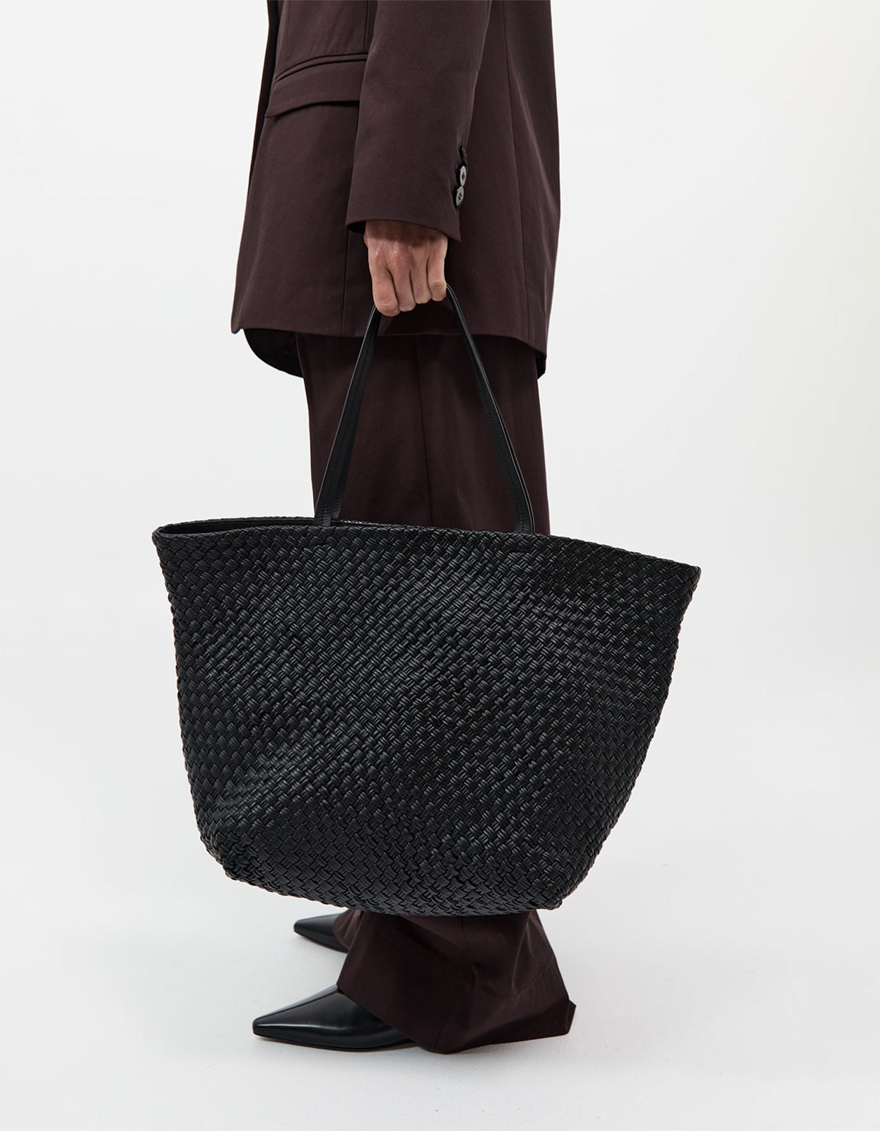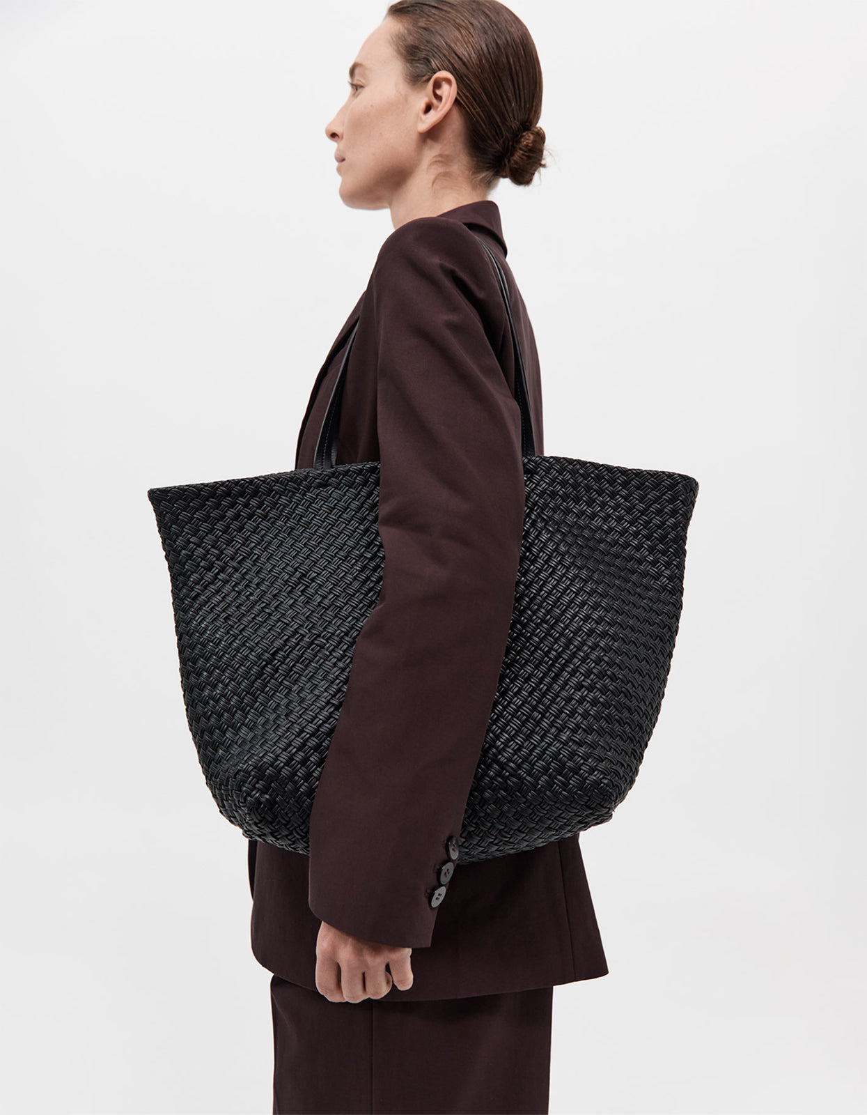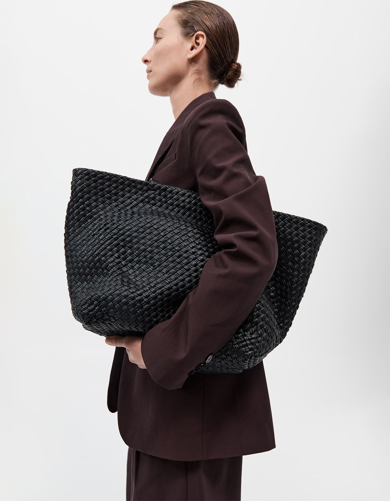 Experience luxury with our Large Woven Trapeze Bag in a classic black from St Agni.