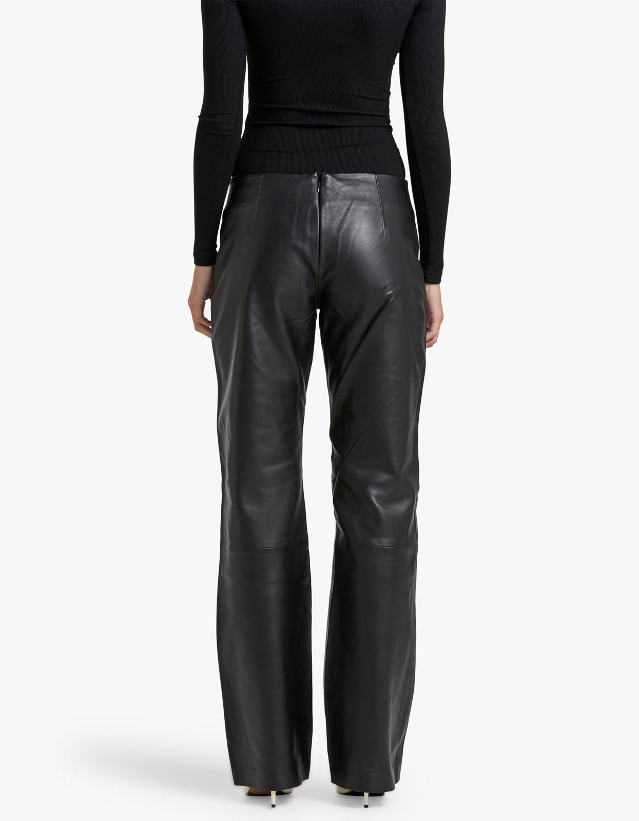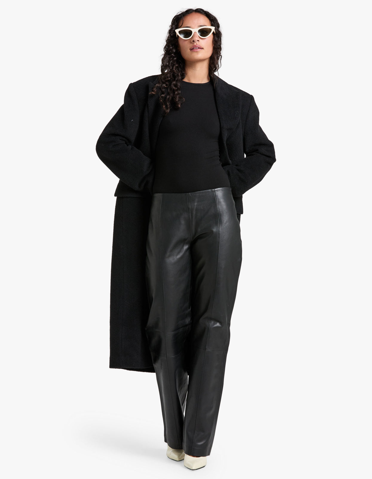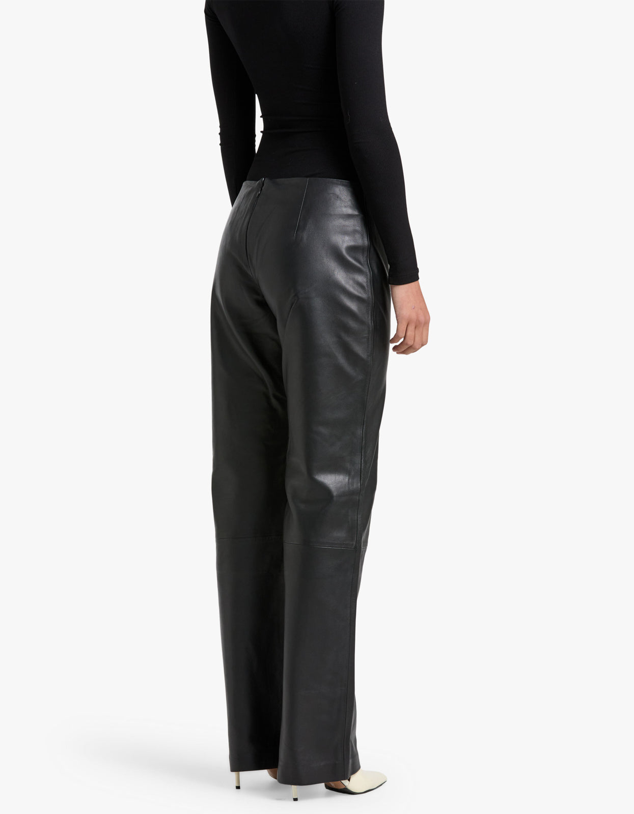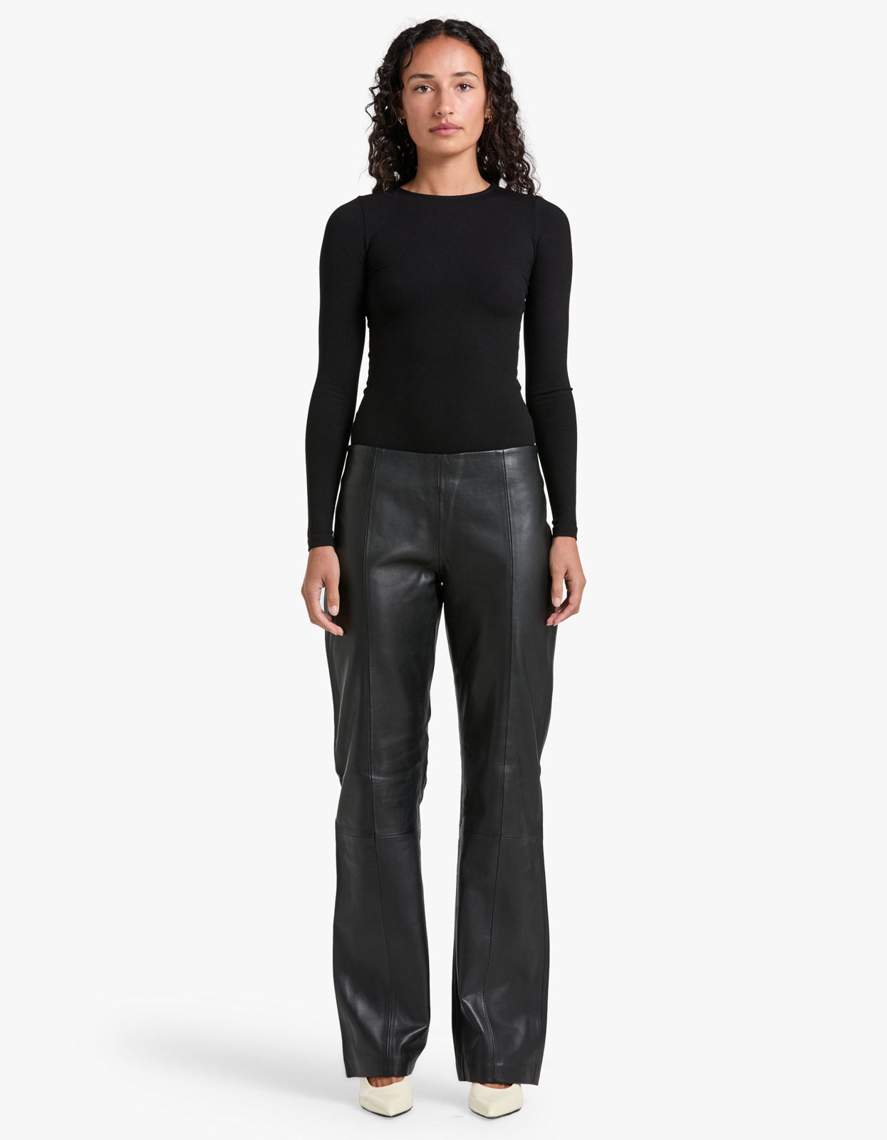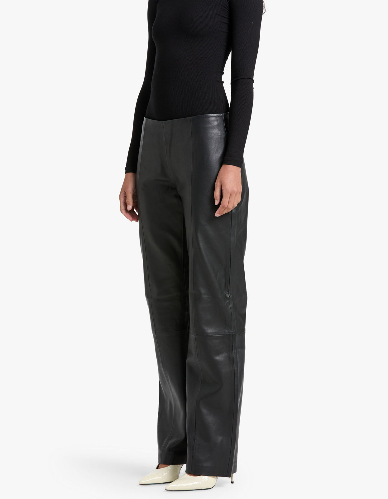 These black leather pants from St Angi offer a sleek and trendy look with their straight leg and fitted silhouette.