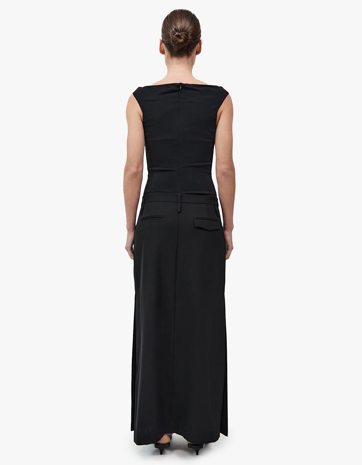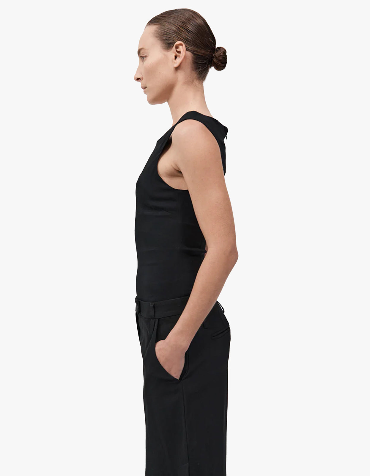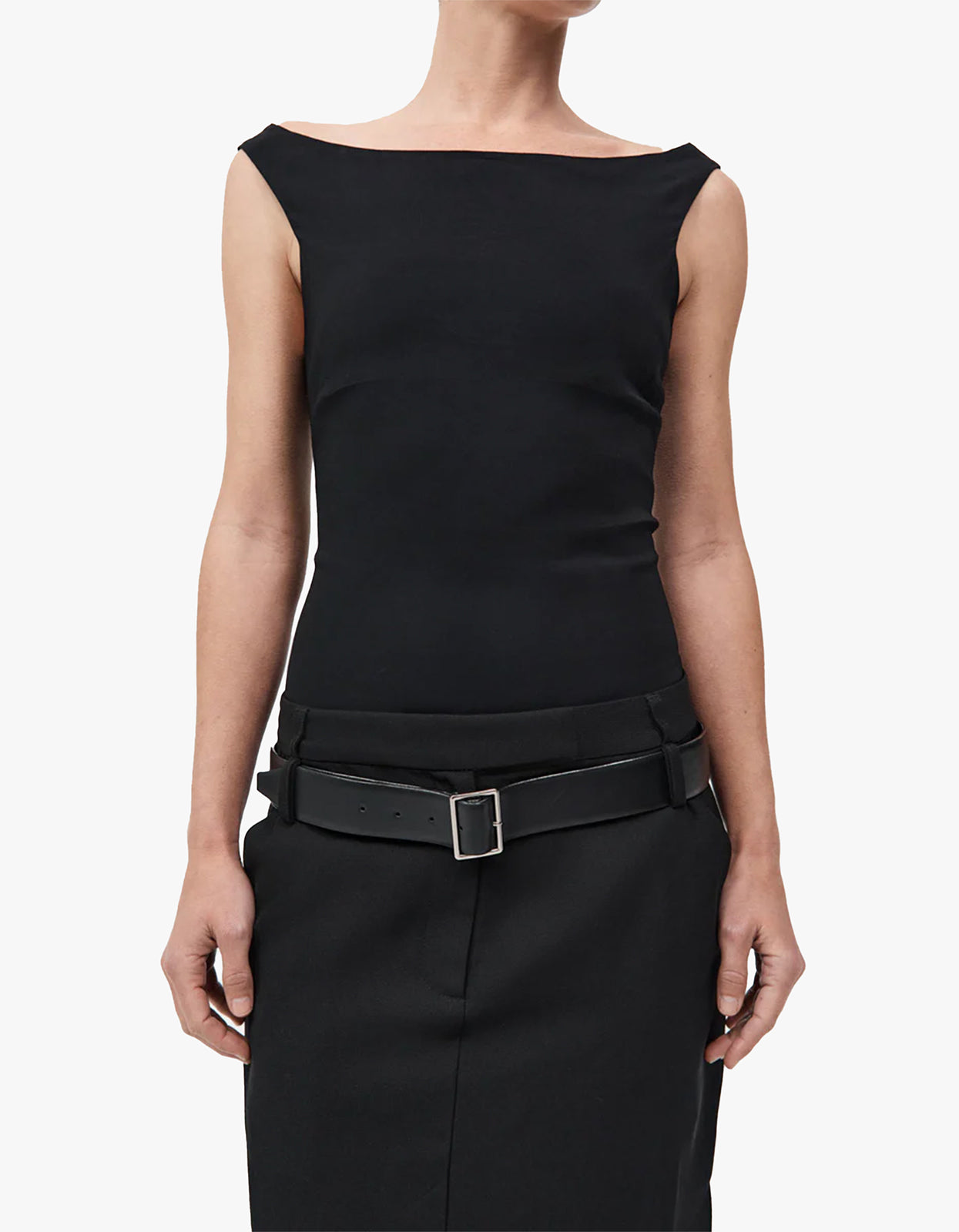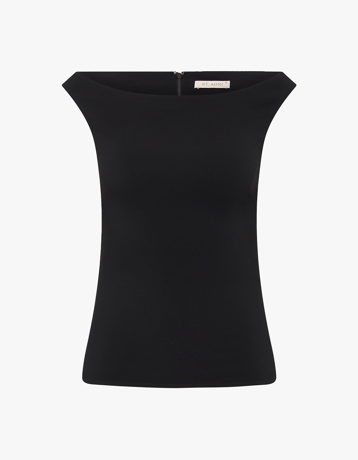 Featuring a sleek boat neckline and sleeveless design, this top drapes beautifully in a luxurious black colourway. Elevate your look with this classic and versatile piece.