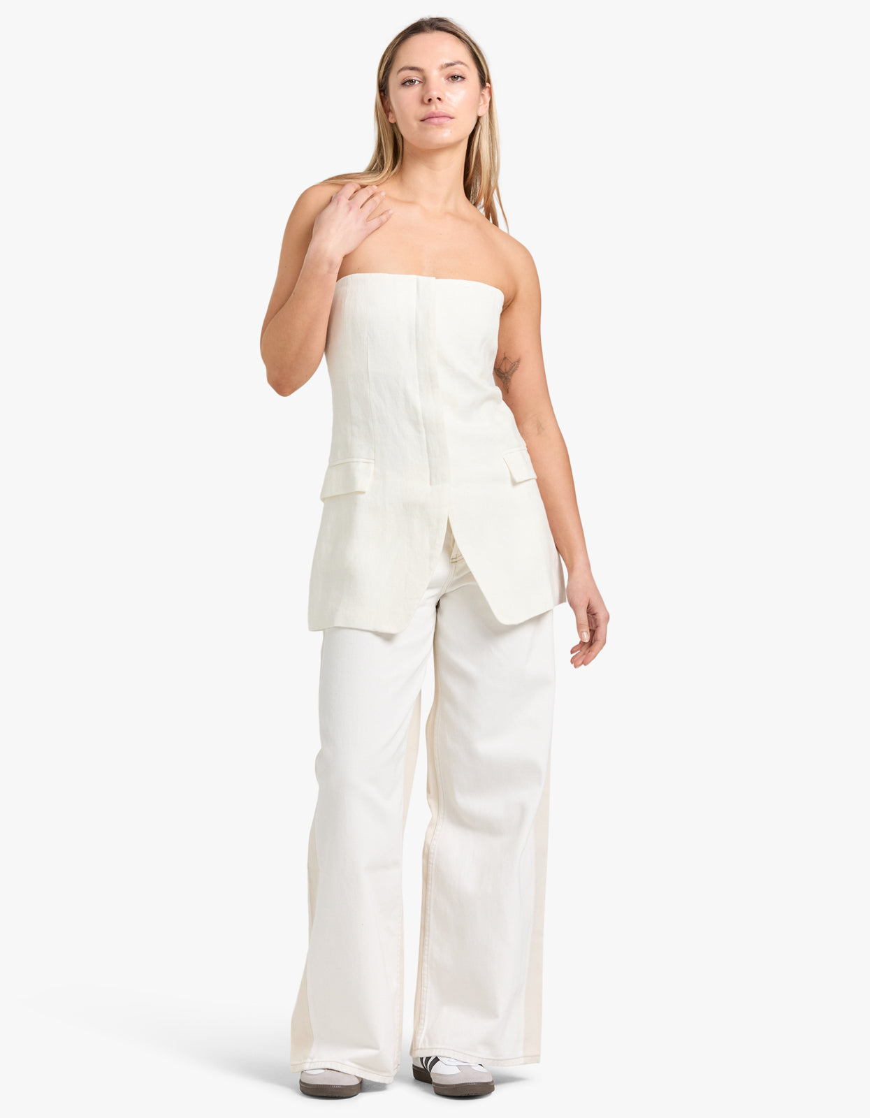 Elevate your look with the St. Agni Tailored Strapless Top in Ivory, epitomising refined elegance and sophisticated allure.