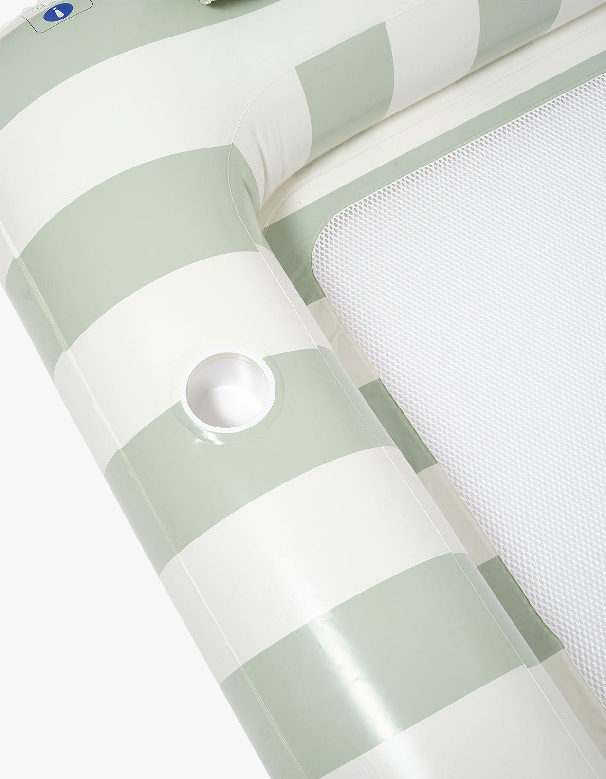 This stylish and oversized float is the epitome of relaxation, perfect for poolside lounging or seaside escapes. Featuring a mesh interior and inflatable tube exterior, it comfortably fits two for a luxurious and refreshing dip. Its warm olive and cream maxi stripe print adds a touch of elegance and charm.