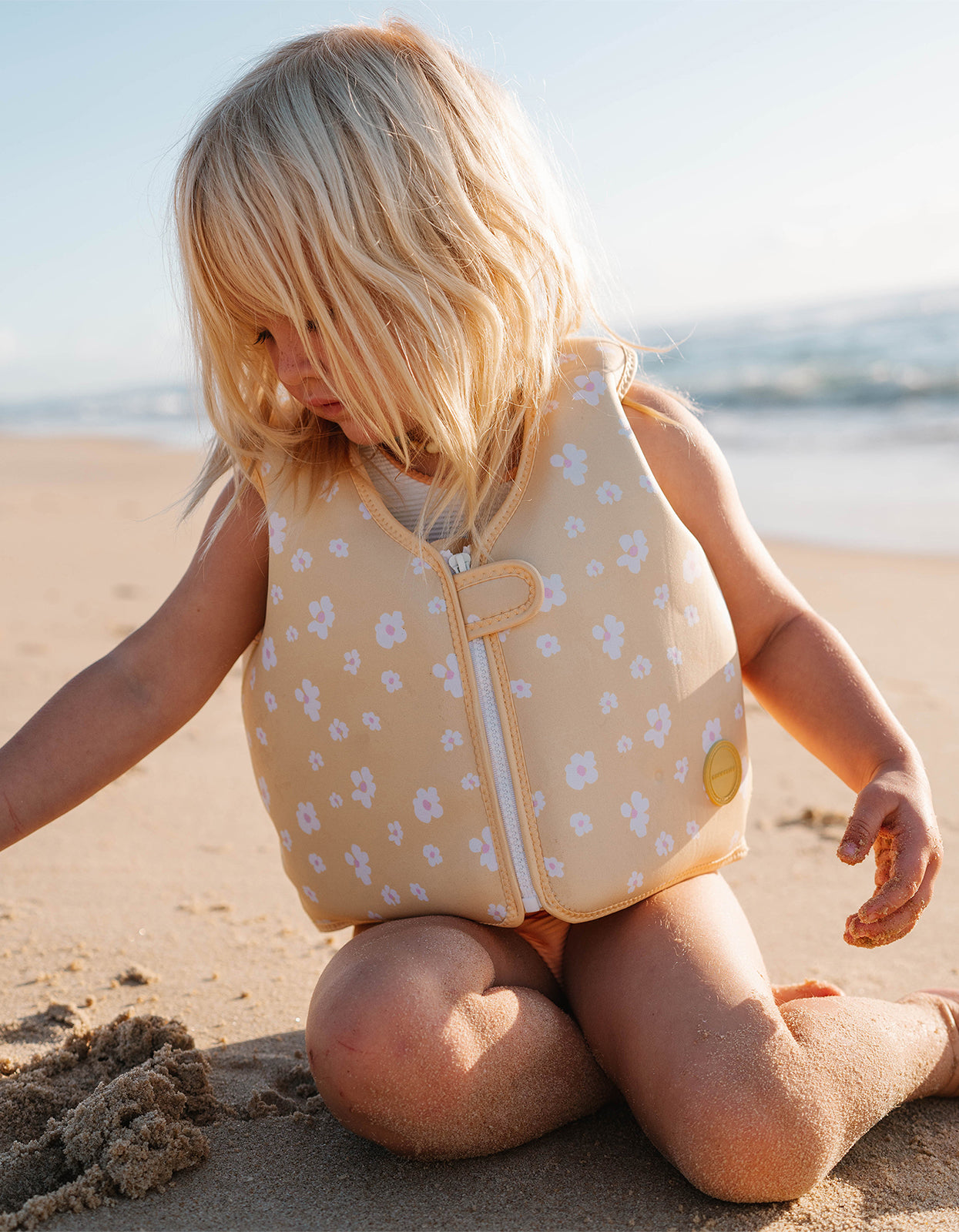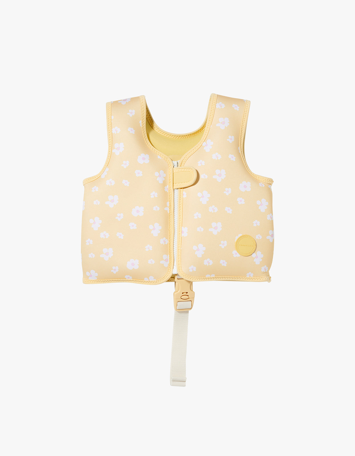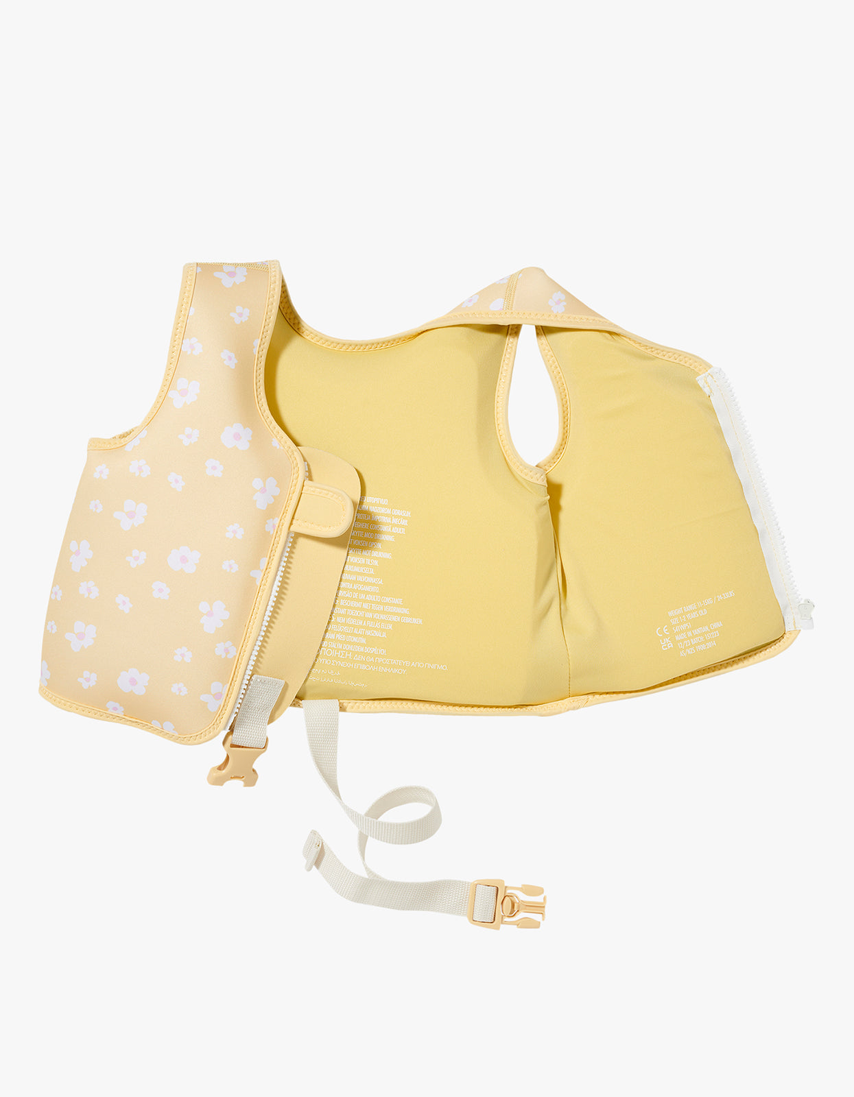 Boost your child's swim confidence with this practical and comfortable vest, made from durable neoprene for buoyancy and warmth. Simply zip up the front and secure the safety strap for a snug fit. With a cute summertime flower print and golden colorway, this vest is sure to turn heads and make a splash. For children aged 1-2 years old.