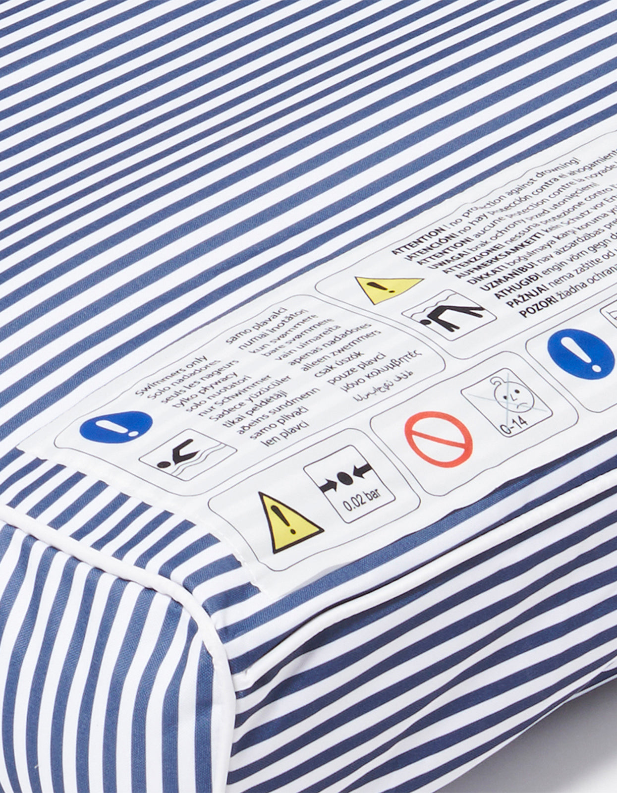 This oversized float boasts head and shoulder support, side handles, and room for two, providing effortless comfort while you soak up the sun. Soak up the simple pleasures and drift off into a daydream with its vintage stripe print and nautical color scheme.
