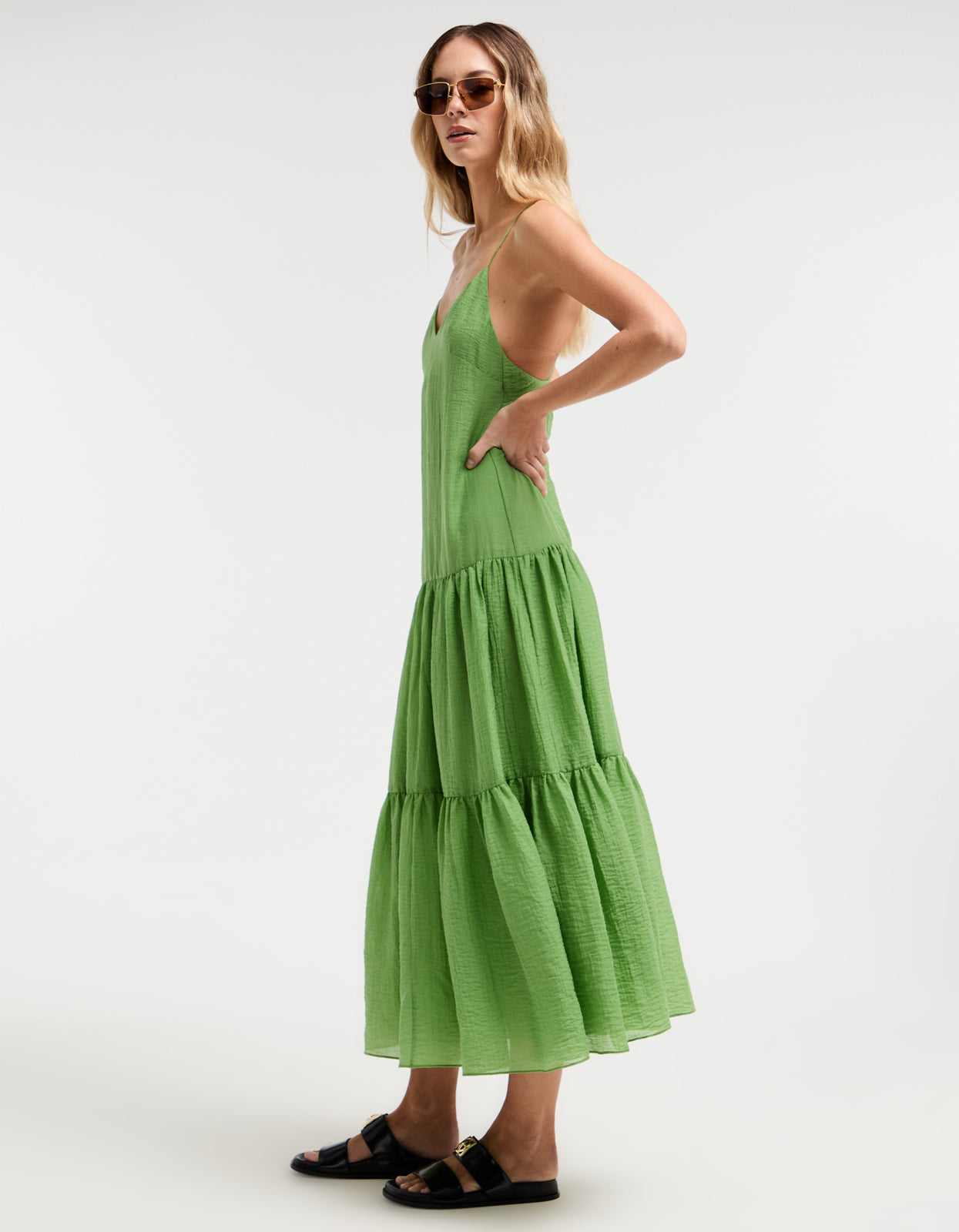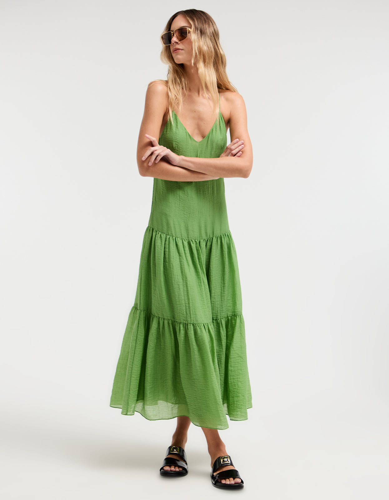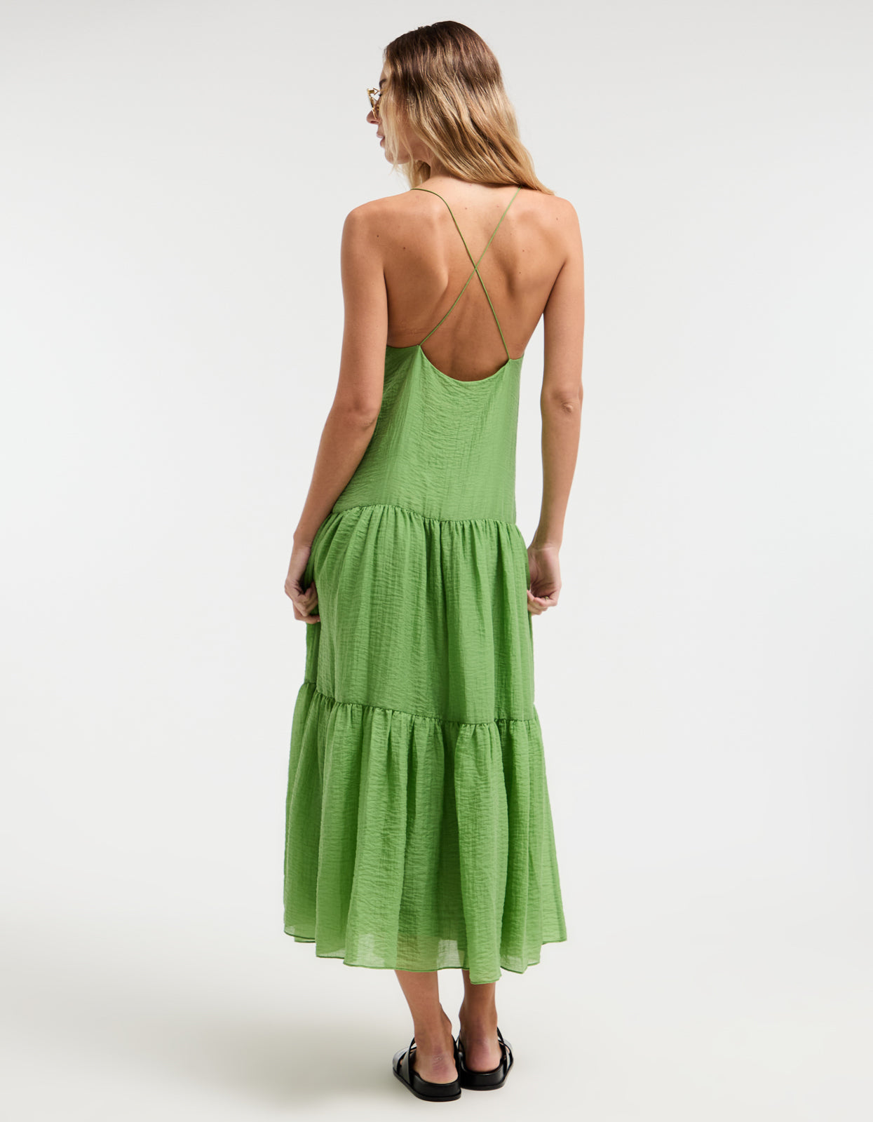 With its vibrant green colorway, delicate spaghetti straps that cross at the back, and a flattering V neckline, this midi dress is the epitome of summer elegance. Fully lined with an invisible zip at the side, it also features a tiered skirt for an effortless and flattering silhouette.Ā