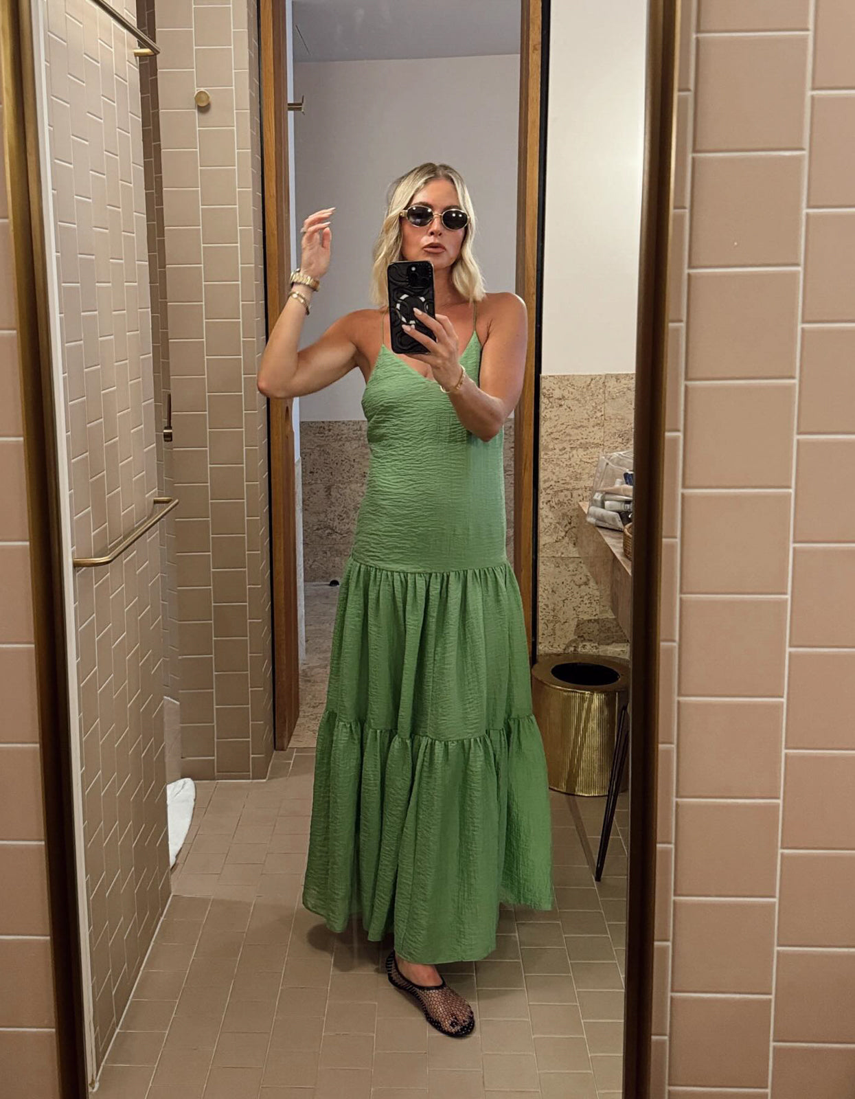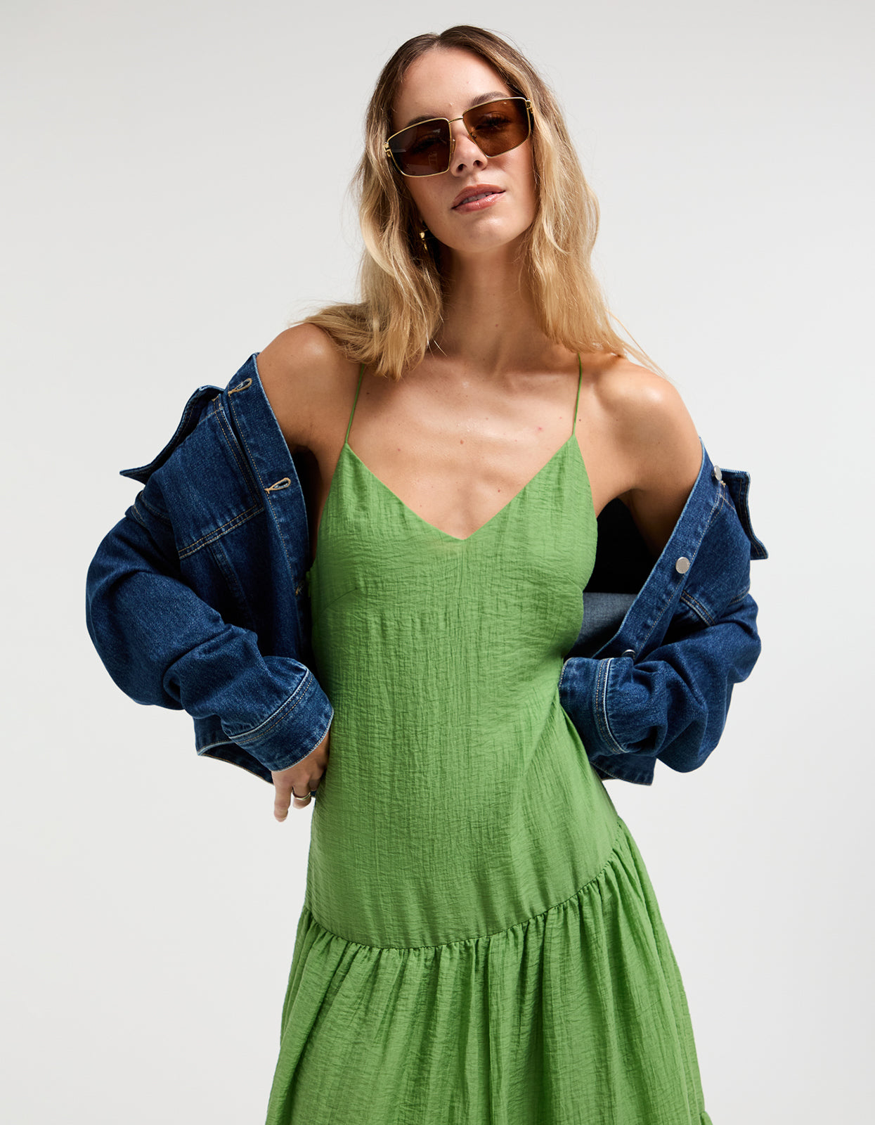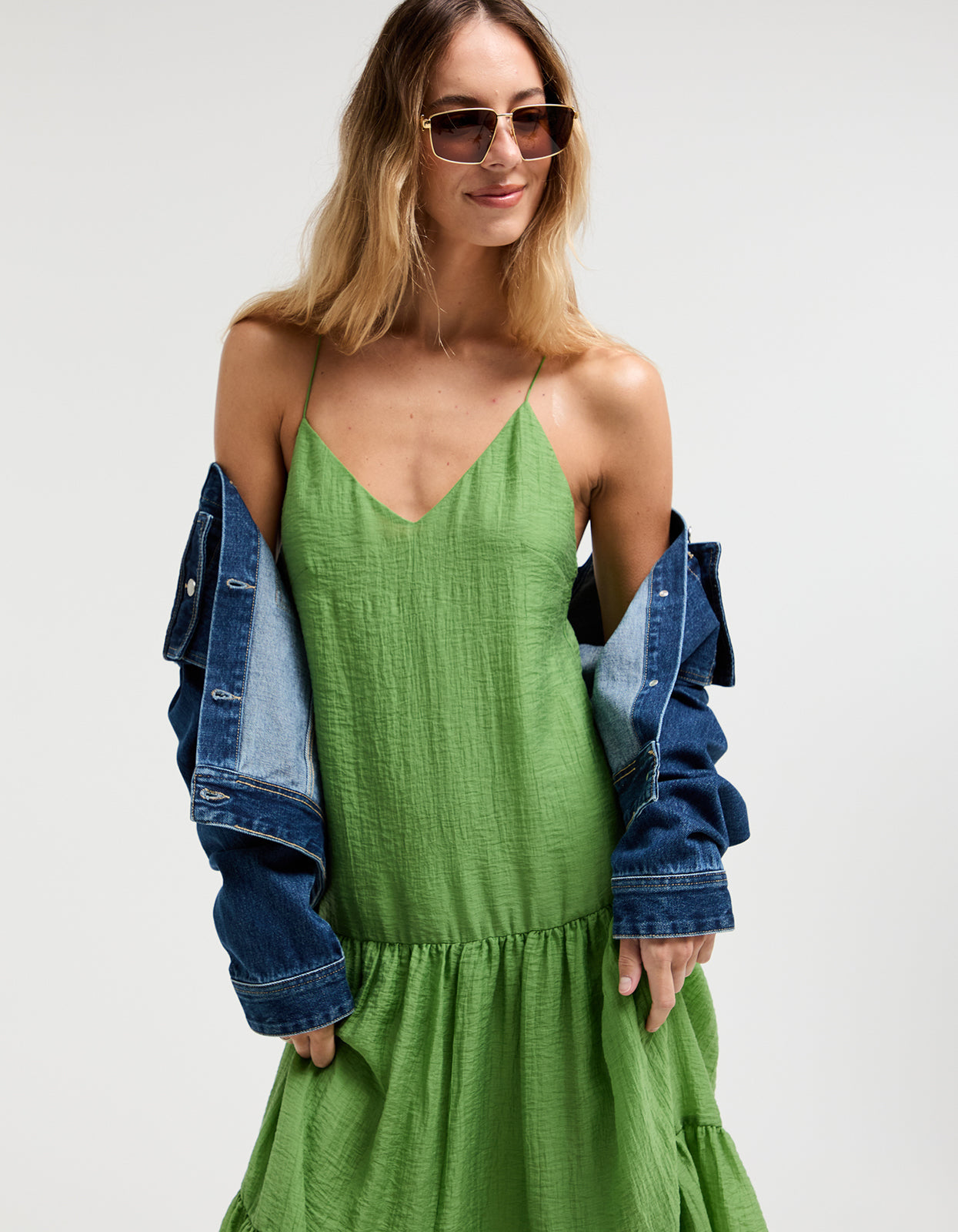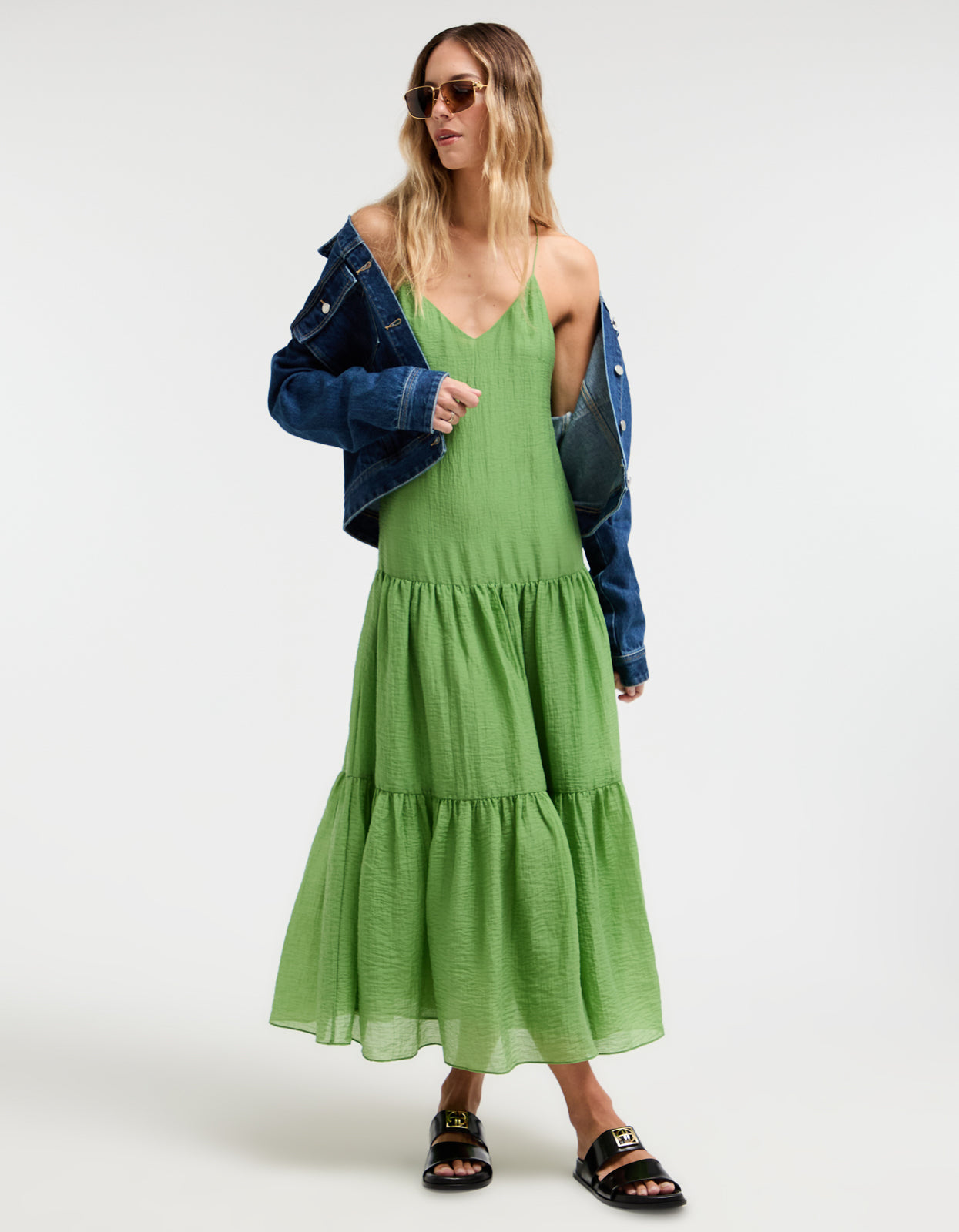 With its vibrant green colorway, delicate spaghetti straps that cross at the back, and a flattering V neckline, this midi dress is the epitome of summer elegance. Fully lined with an invisible zip at the side, it also features a tiered skirt for an effortless and flattering silhouette.Ā