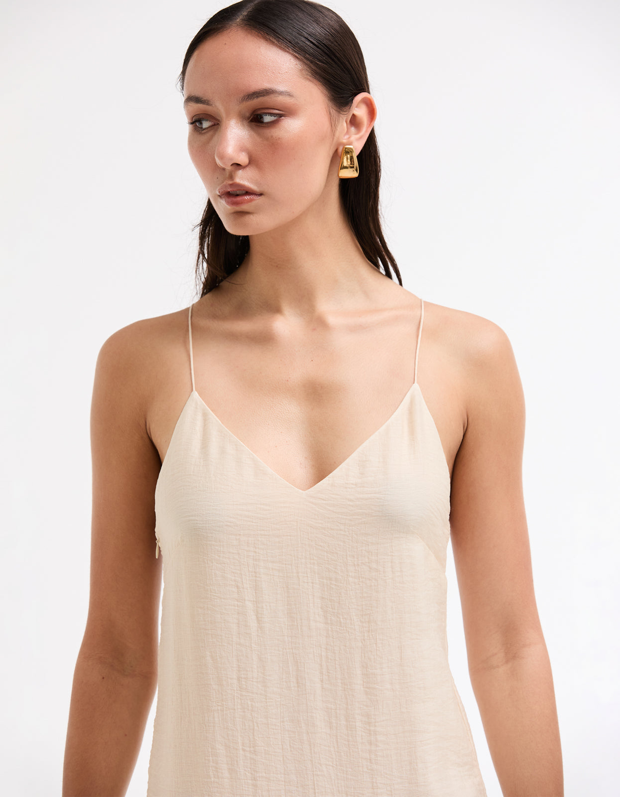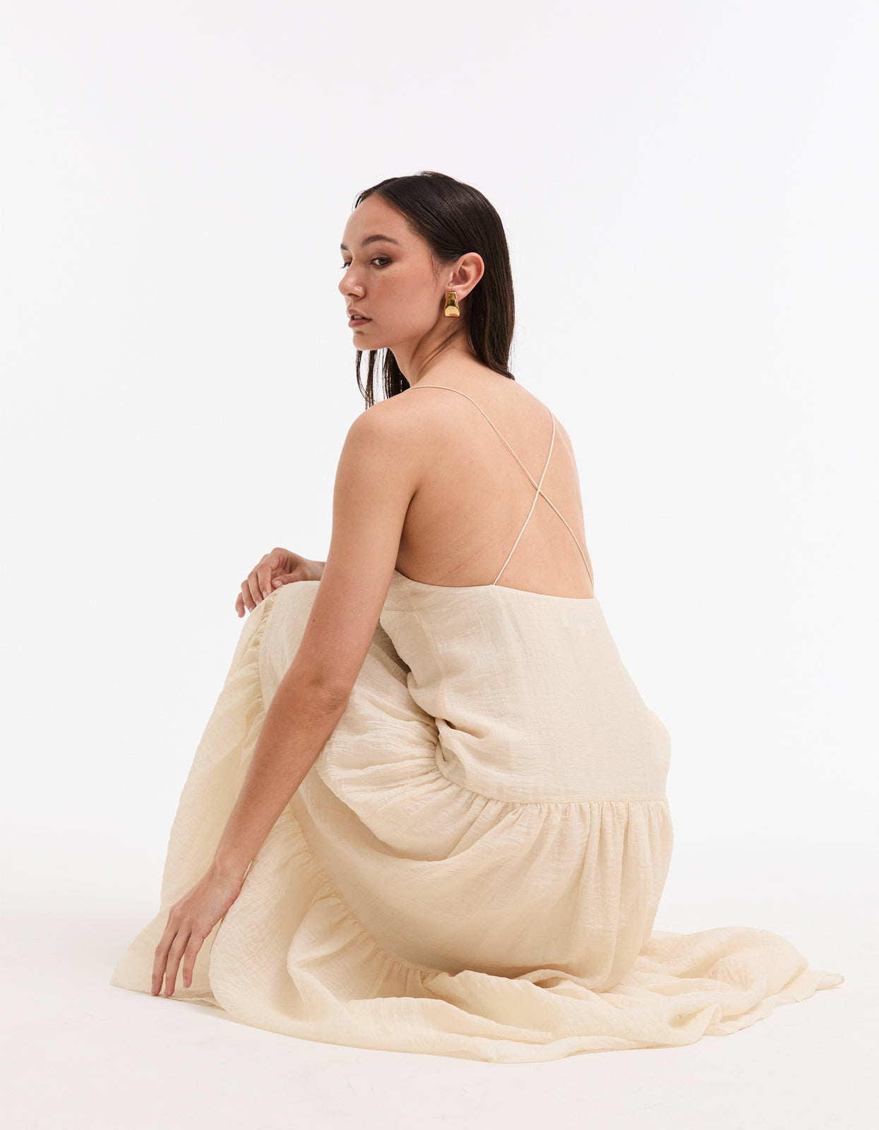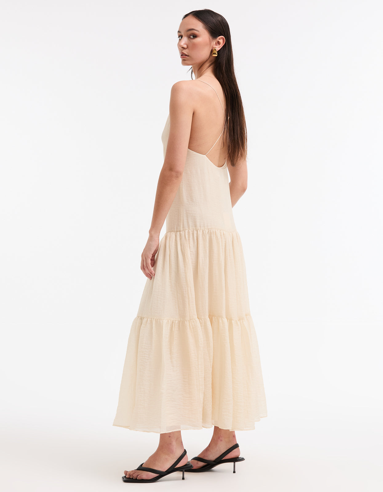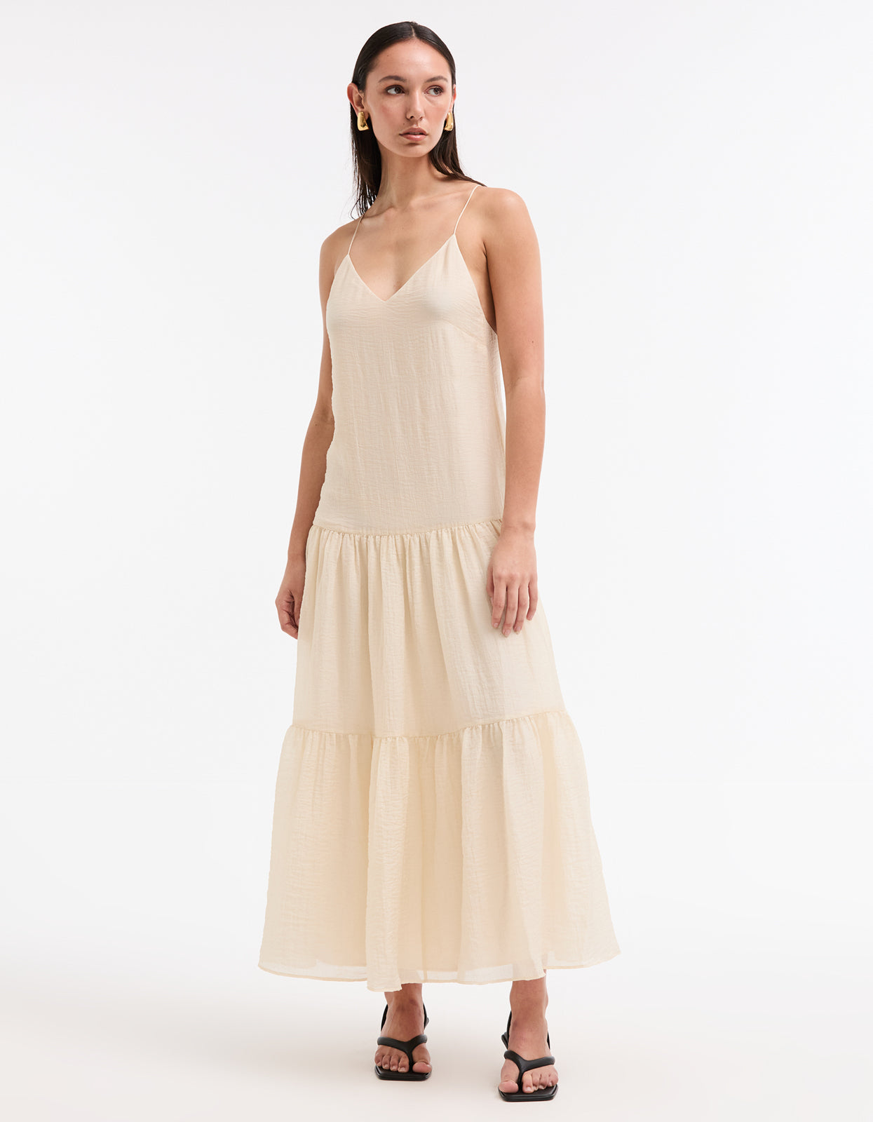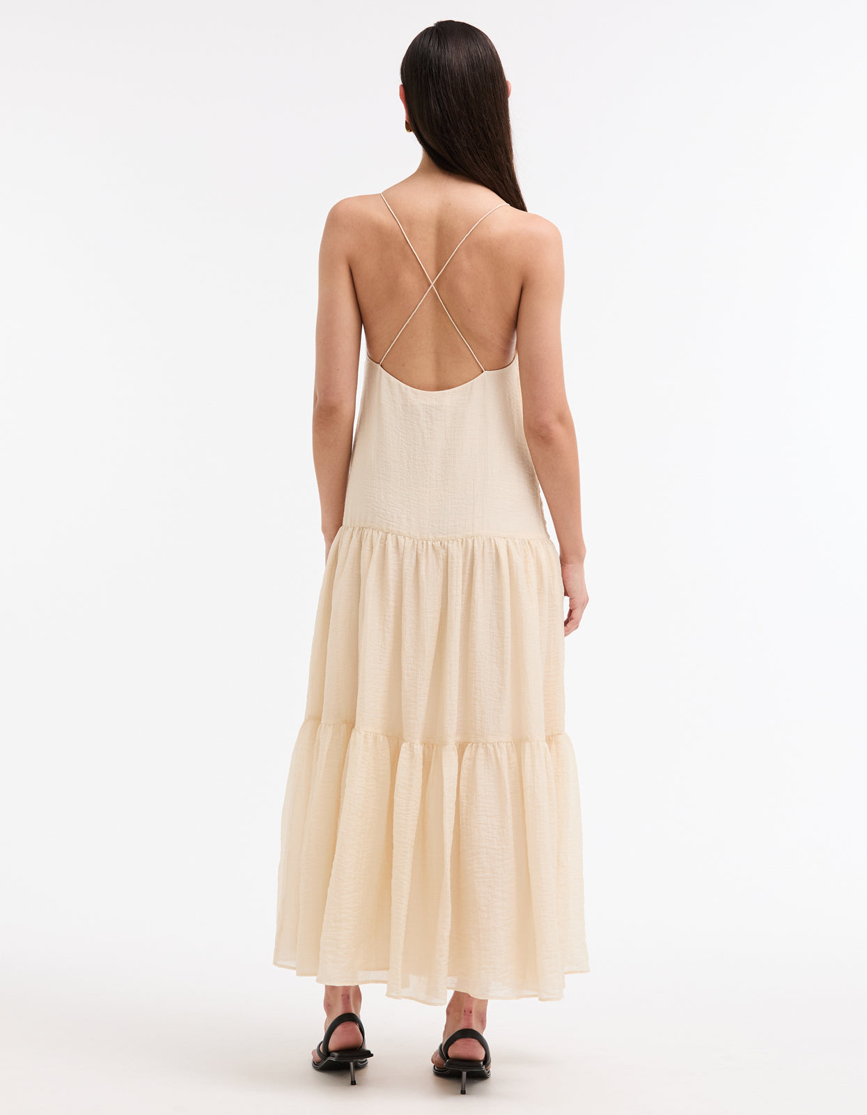 With its soft cream colorway, delicate spaghetti straps that cross at the back, and a flattering V neckline, this midi dress is the epitome of summer elegance. Fully lined with an invisible zip at the side, it also features a tiered skirt for an effortless and flattering silhouette.