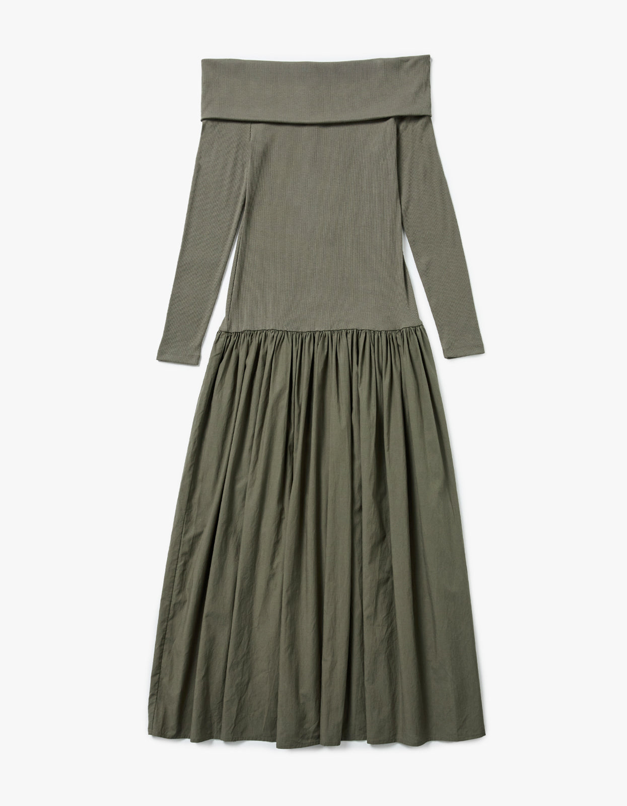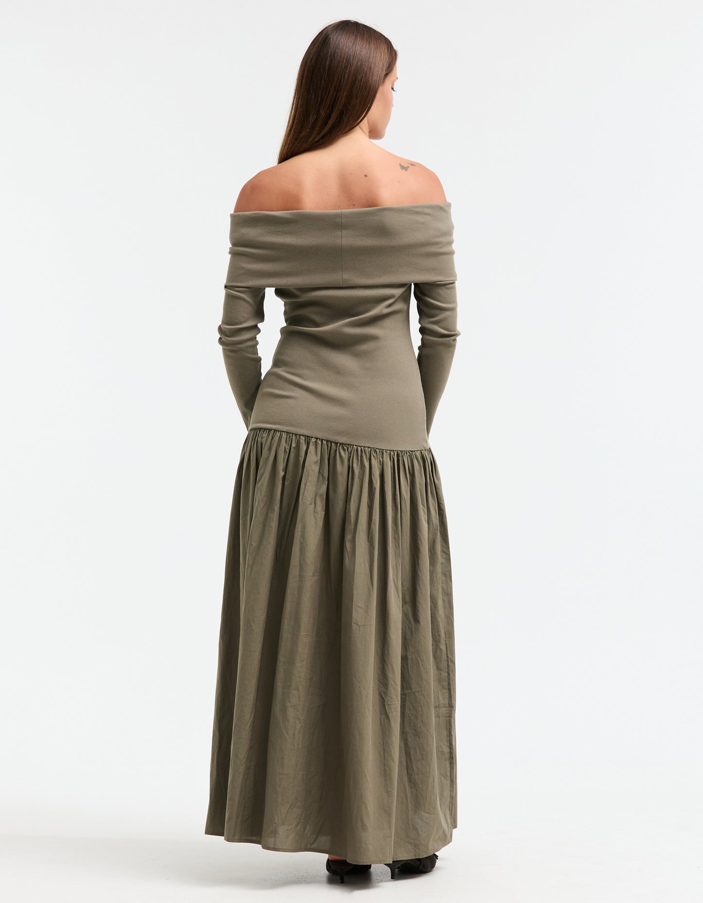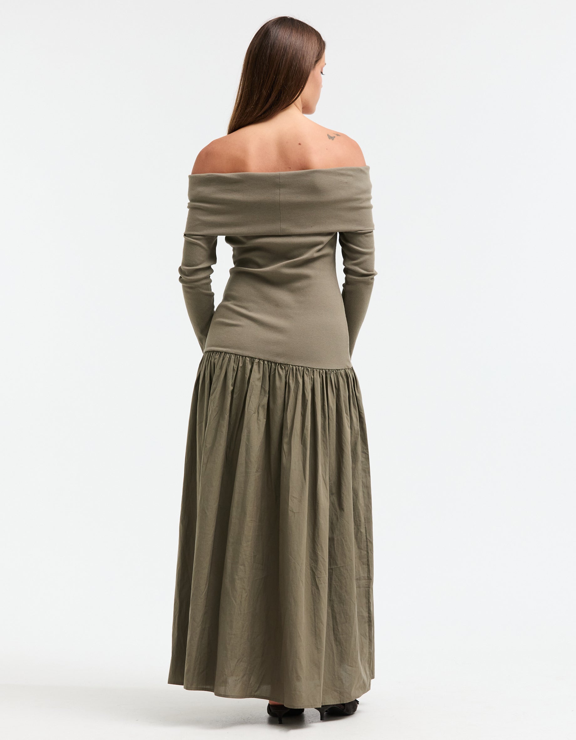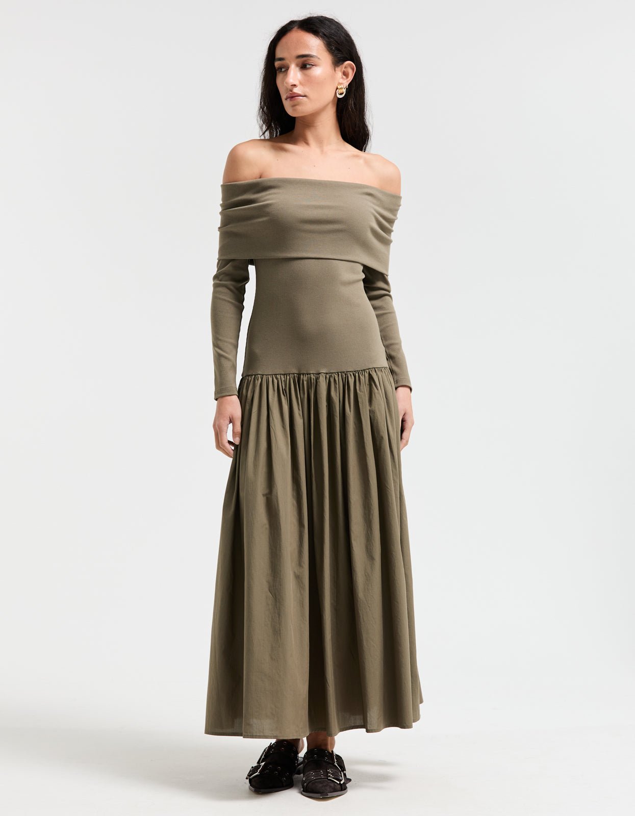 The Superette Bianca dress boasts a drop waist design and a flattering off the shoulder style, while the khaki colourway and ribbed cotton upper exude elegance. The gathered maxi skirt offers both comfort and style, complemented by the long sleeves for a perfect finishing touch. Elevate your wardrobe with this sophisticated and exclusive piece.