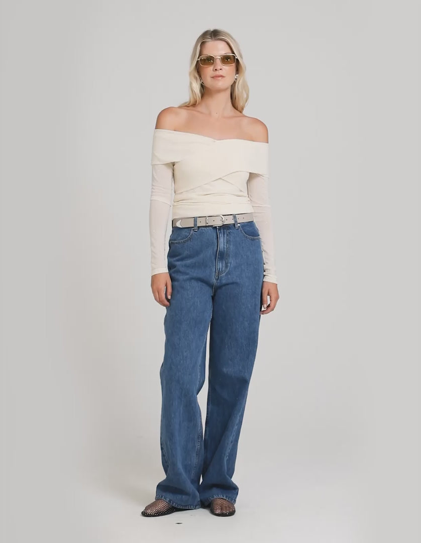 The stunning ivory hue and diamante embellishments make this top a chic and stylish choice. Designed with an off-shoulder cut, mesh fabric, and a straight silhouette, it creates a refined, flattering look.