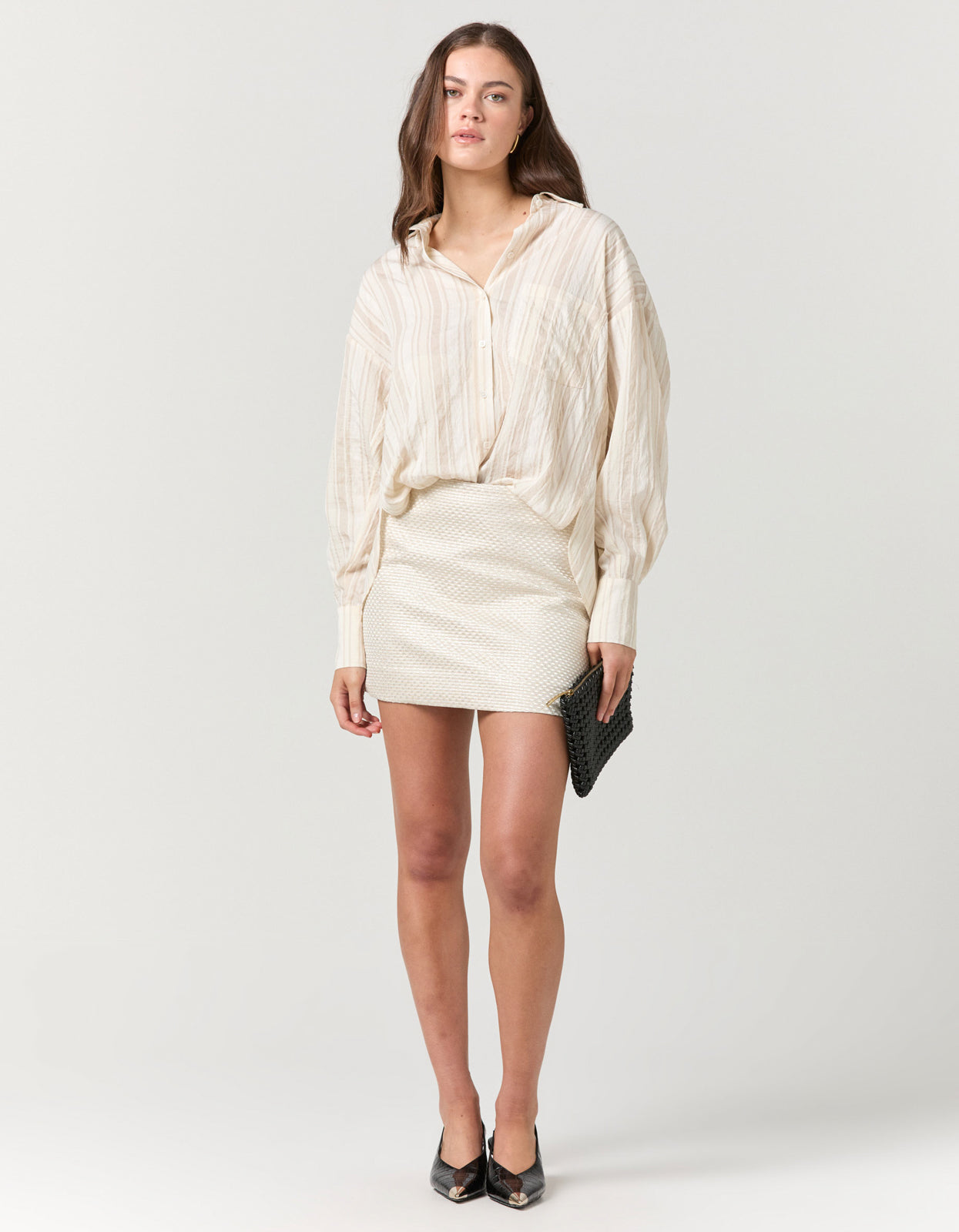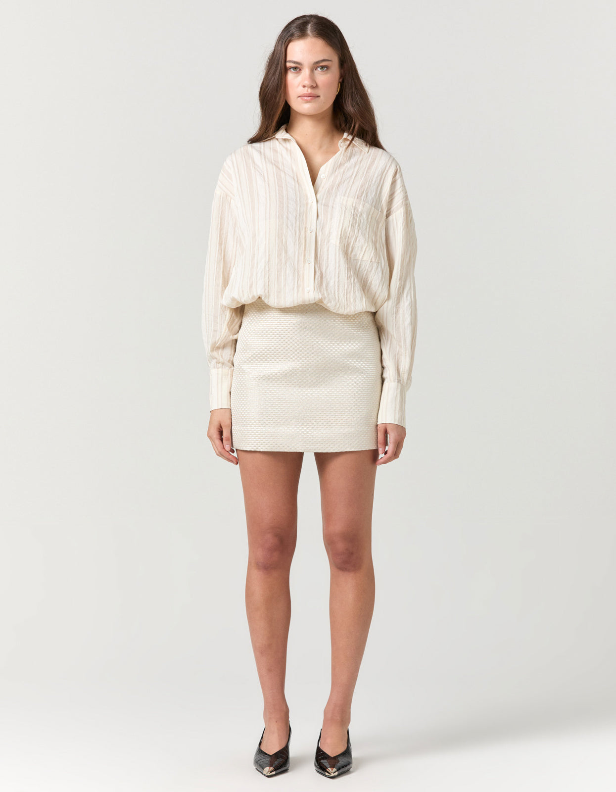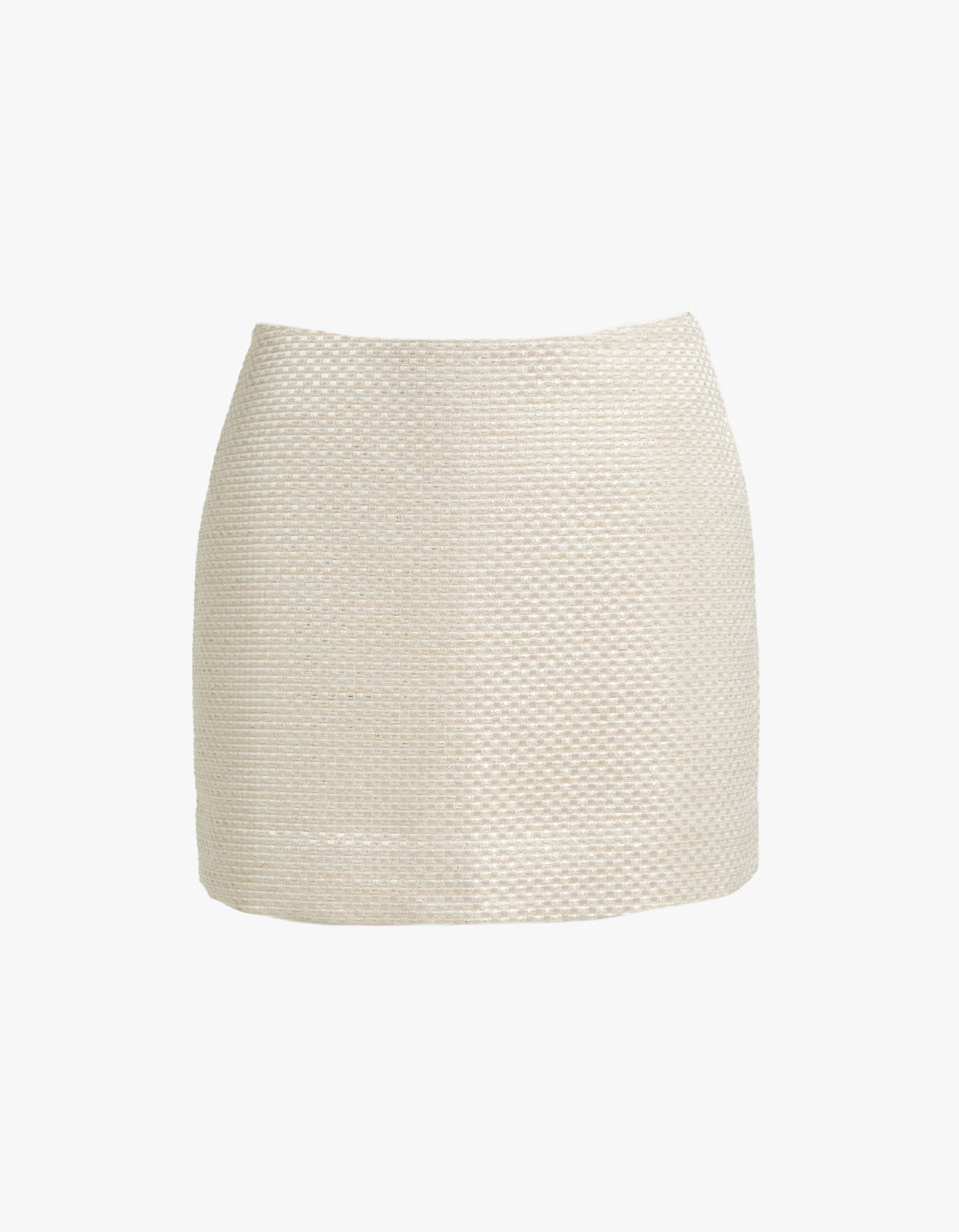 Made with a luxurious textured fabric, this Superette piece will elevate your style. This champagne check pattern has touches of gold metallic thread throughout it, which adds a touch of glamour and shimmer to your look. Perfect for any occasion, dress it up or down for versatile wear.