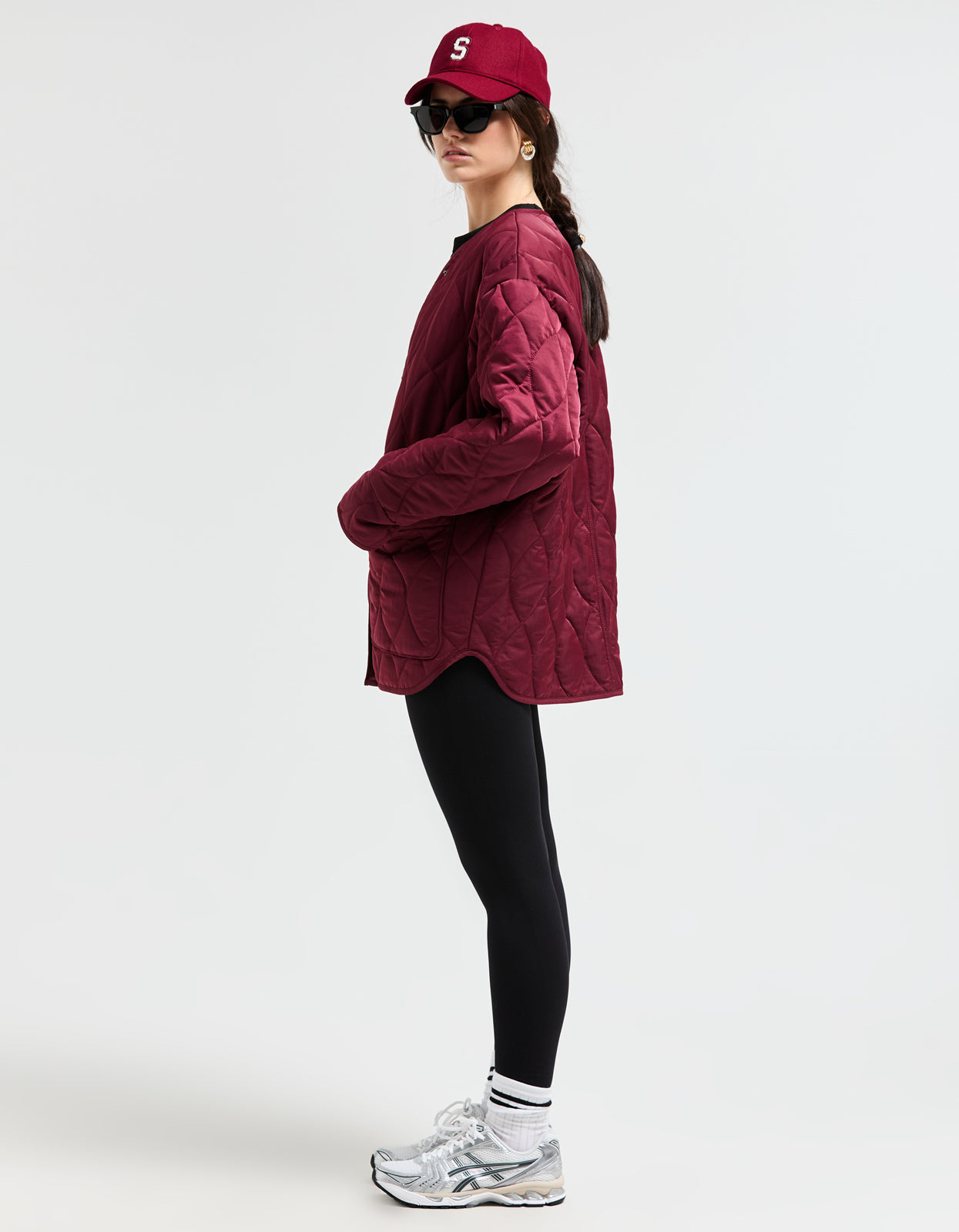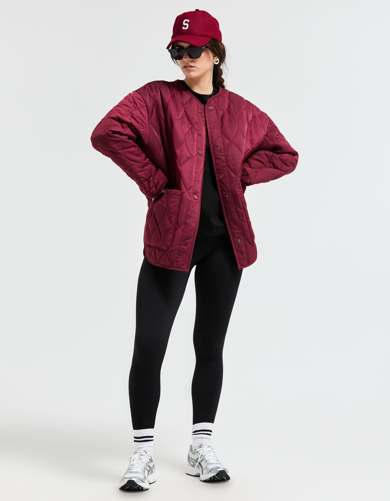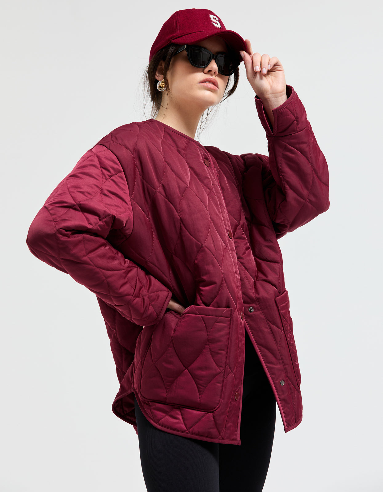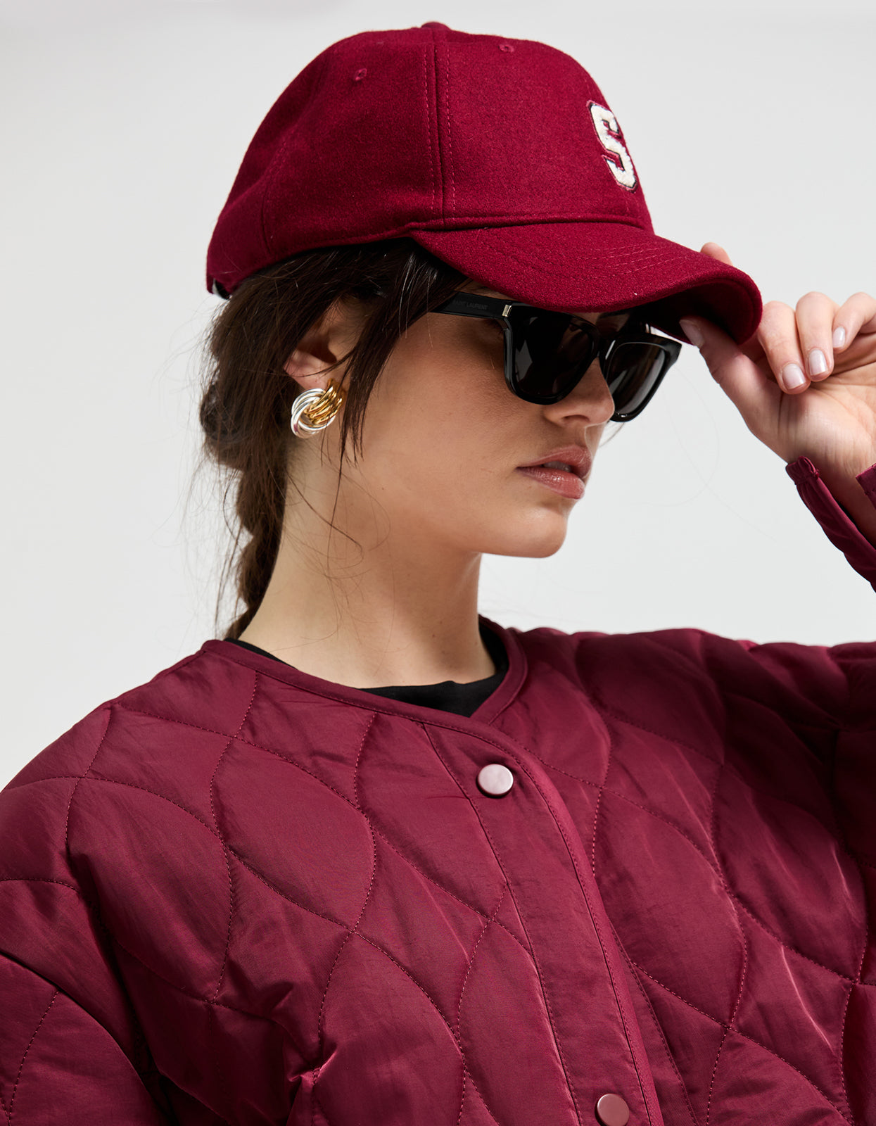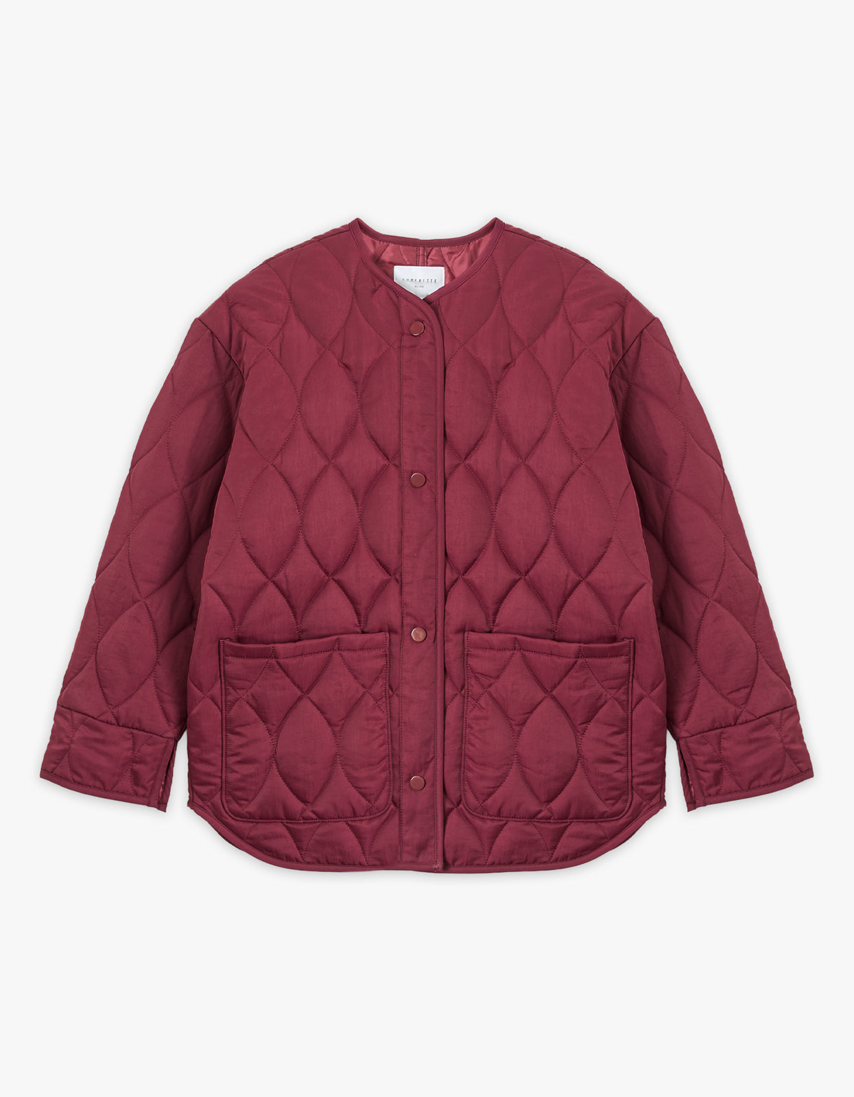 - Tonal burgundy snap closure down front
