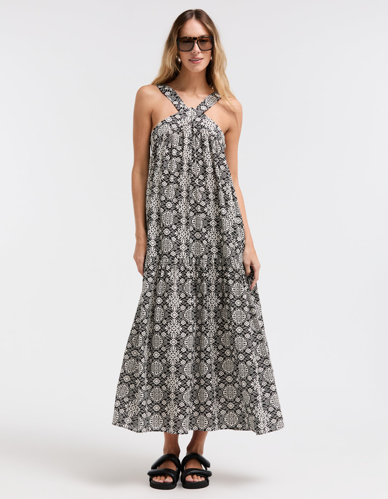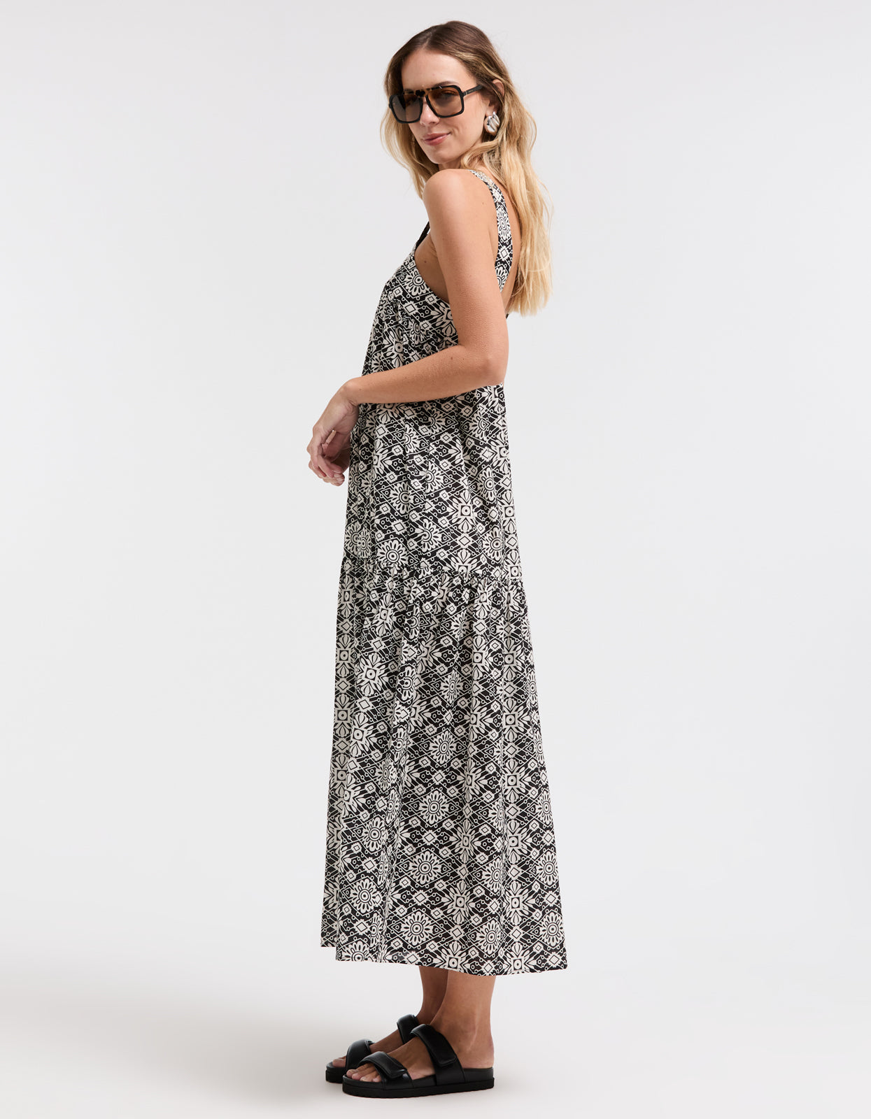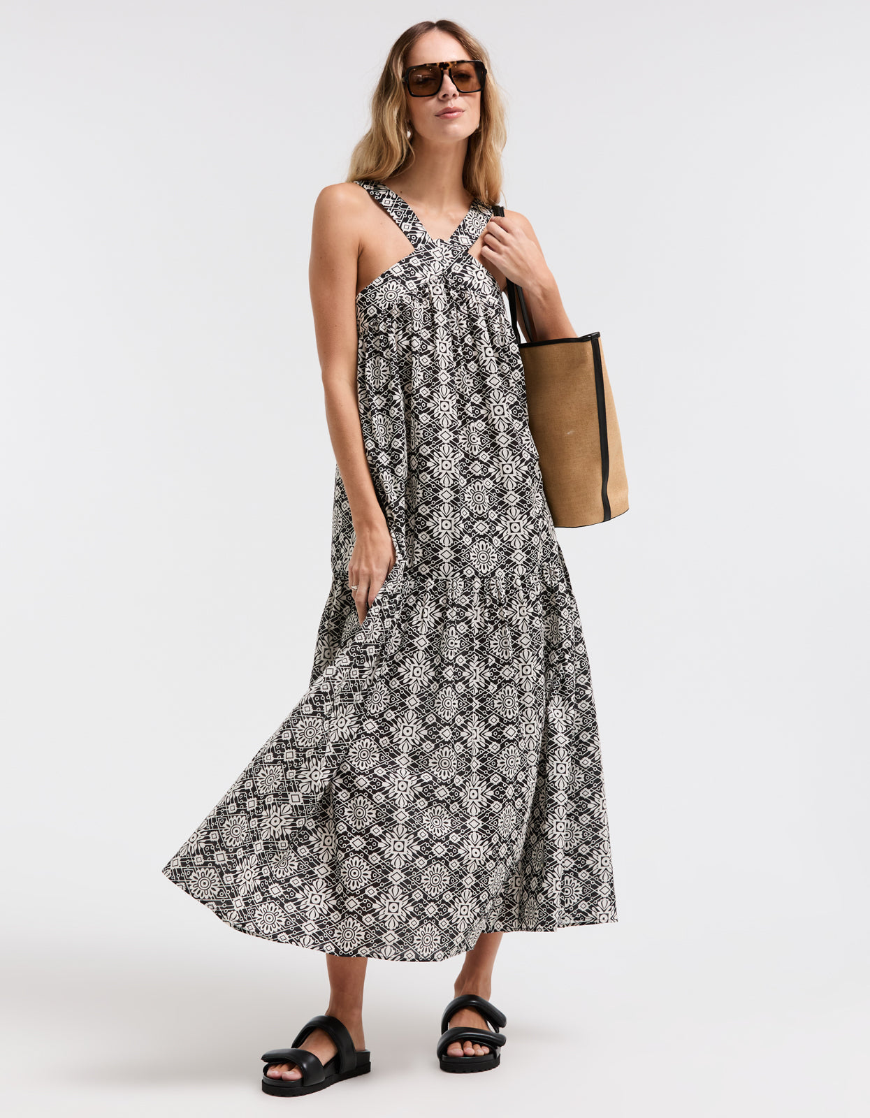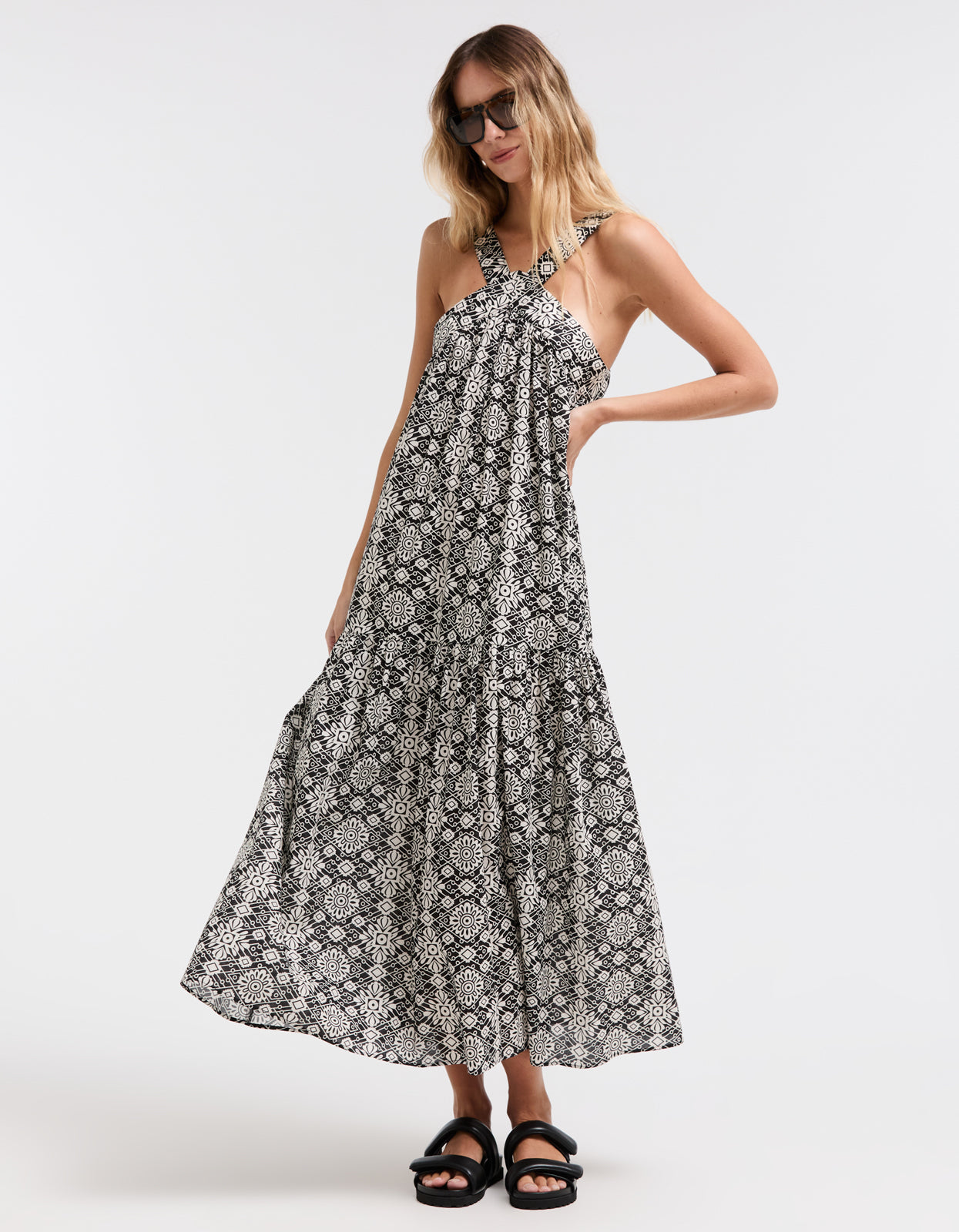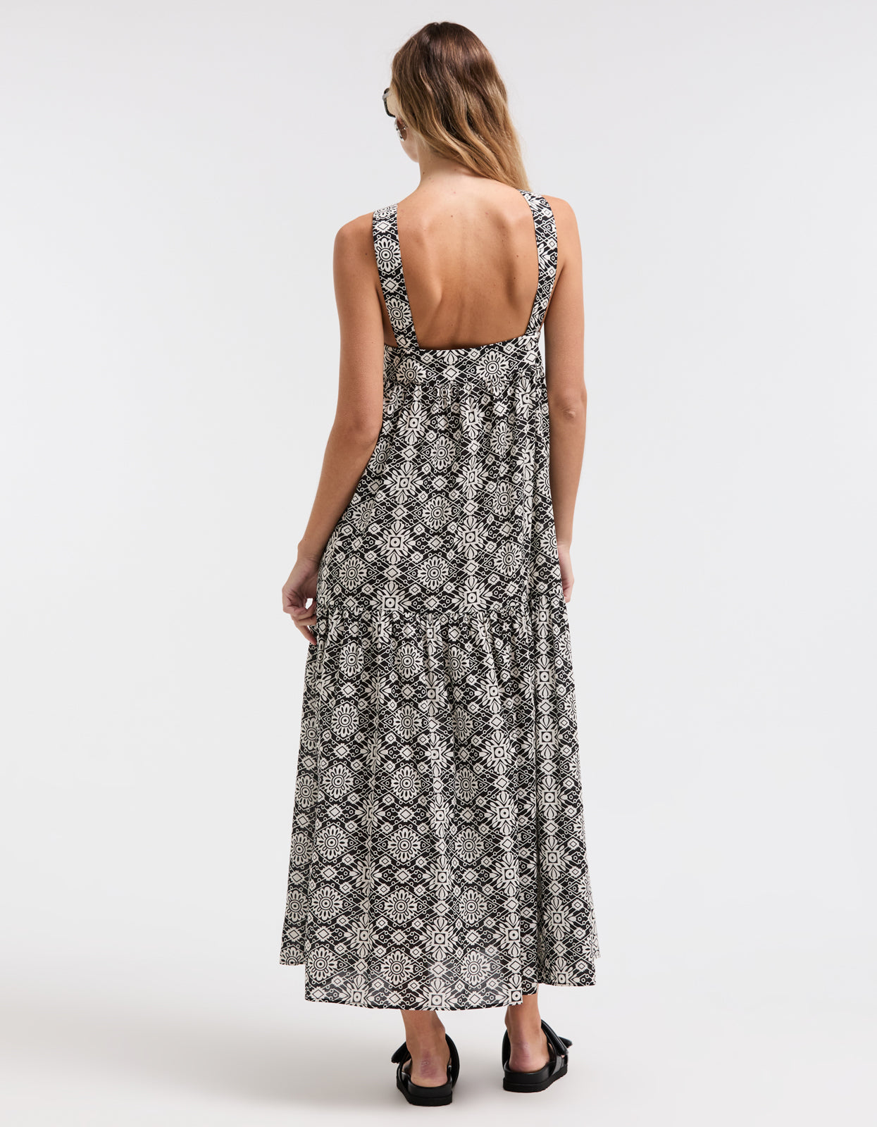 Elevate your summer wardrobe with the Hannah Dress from Superette, featuring a stunning black and white Aztec floral print.