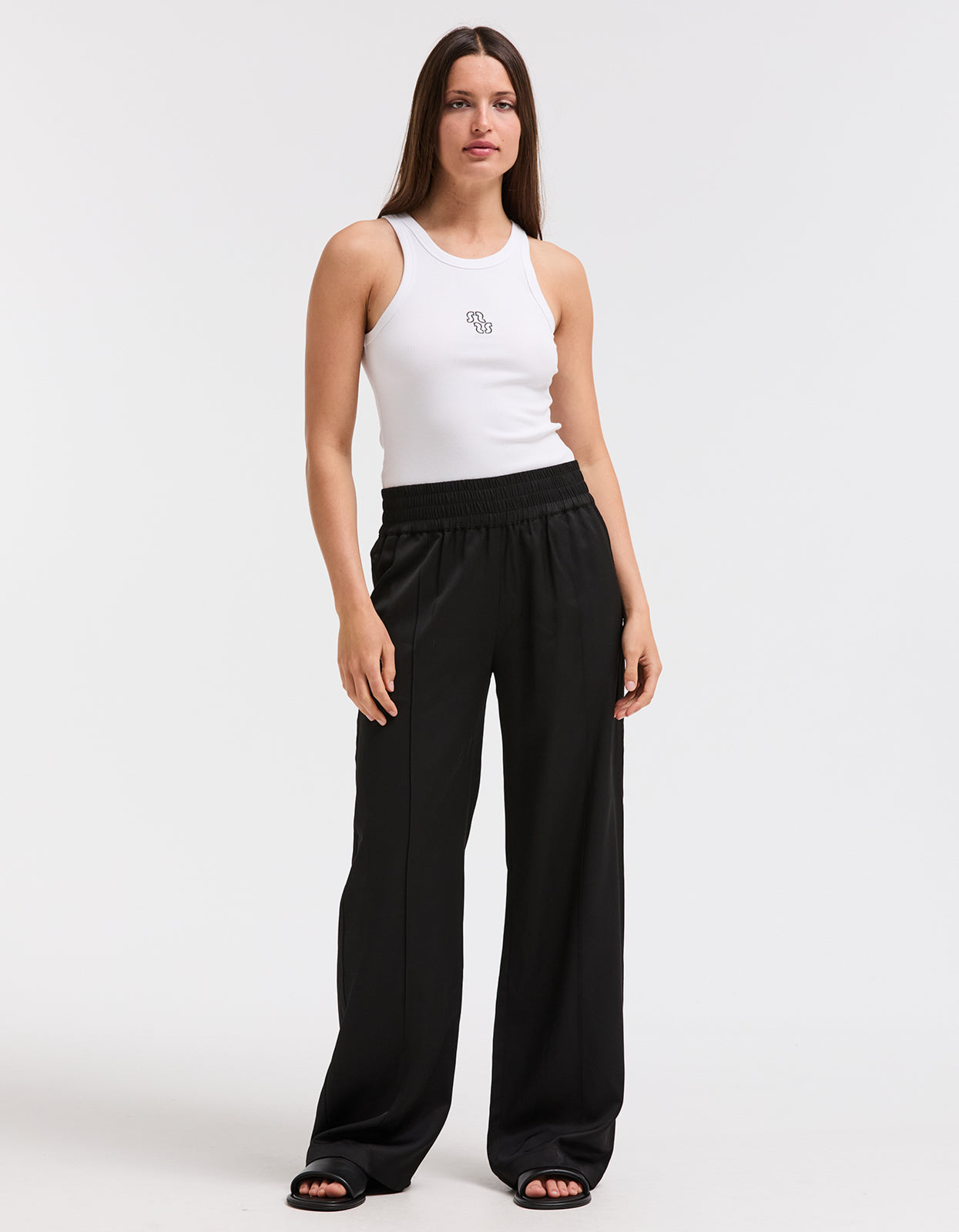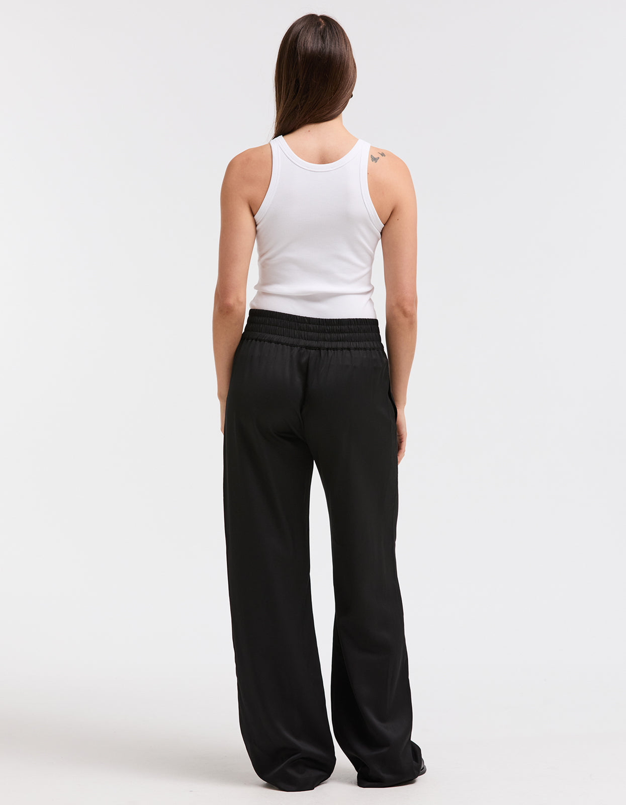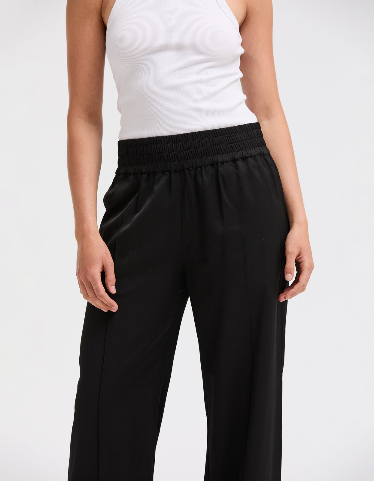 The Hawks Pant via Superette is here - Sure to be a sweet new addition to your summer attire, this pull-on style pant features a shirred elasticated waistband with seam detailing down the legs - From the office to arvo drinks, you can never go wrong with a chic black pant.