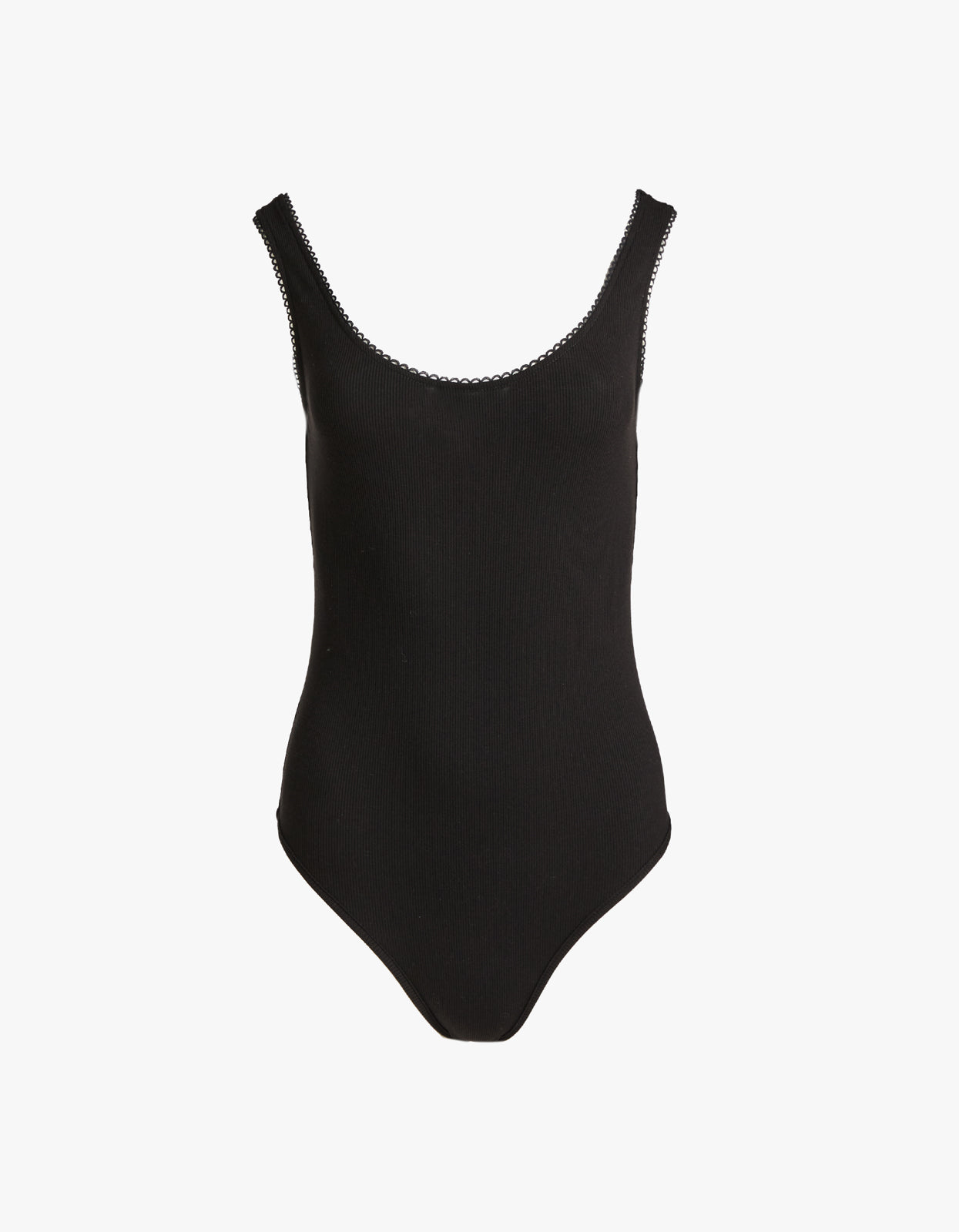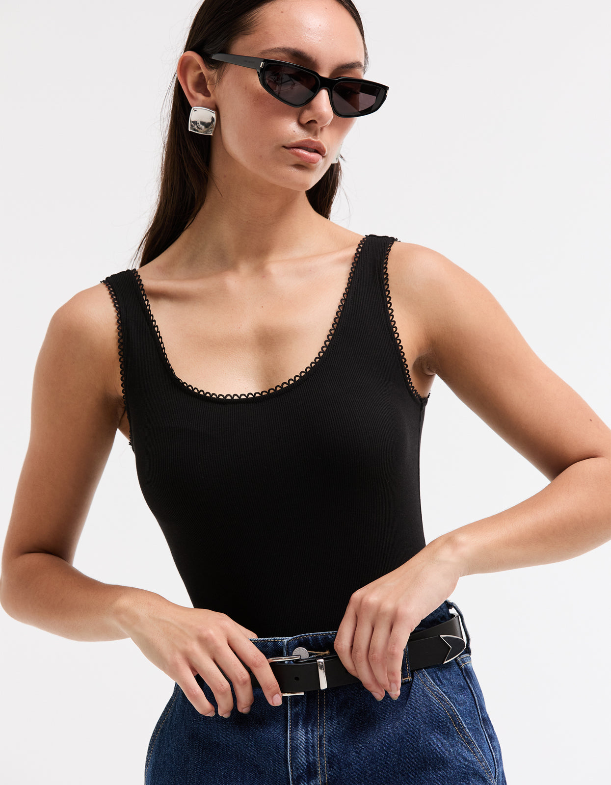 Featuring a flattering scoop neckline and scoop back, this sleek black bodysuit is designed with a slip-on style for easy wear. The sleeveless design makes it perfect for layering or wearing solo, while the playful ric rac trim detailing adds a touch of charm to this minimalist piece.