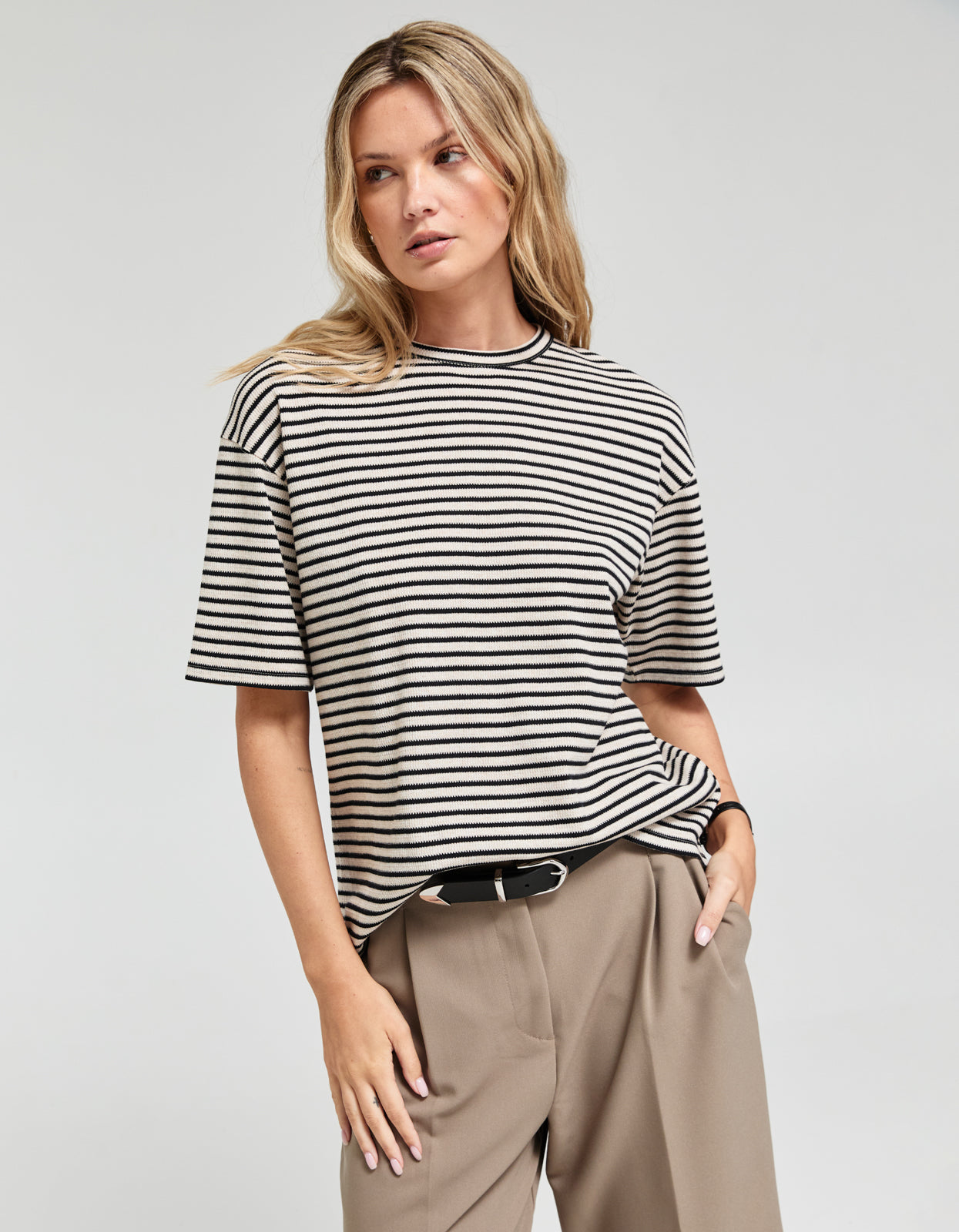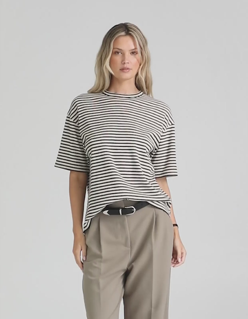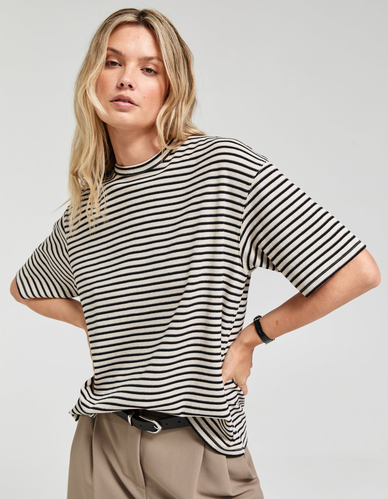 Crafted from a heavy-weight jersey, the short-sleeves and crew neckline offers a polished yet casual silhouette. With a straight hemline, striped detailing and regular fit, this tee effortlessly transitions from casual errands to layered office looks, making it a versatile staple for any wardrobe.