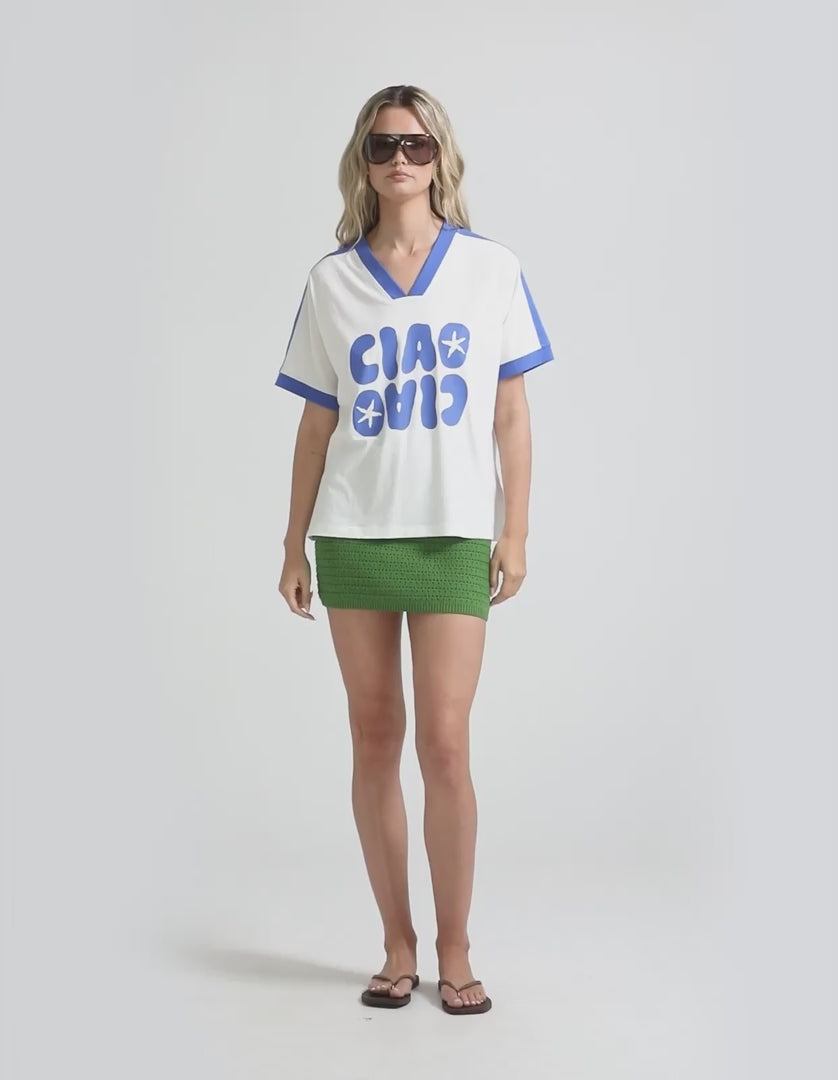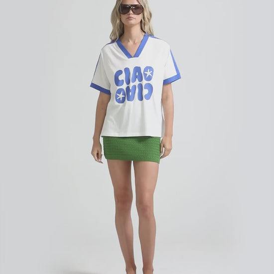 An easy throw-on with a playful twist, this retro-inspired tee brings the holiday mood wherever you go. Featuring a bold “CIAO CIAO” graphic across the front, contrast blue trims, and an oversized V-neck fit, it’s got that effortlessly cool energy we love.