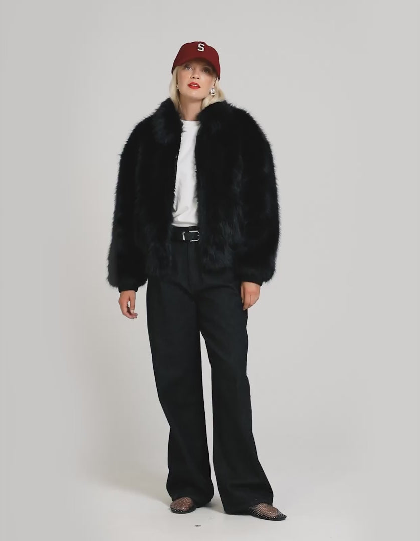 This stunning black faux-fur jacket is lined for added warmth and comfort, making it the perfect choice for a chilly evening. With its luxurious feel, you'll be sure to turn heads wherever you go.