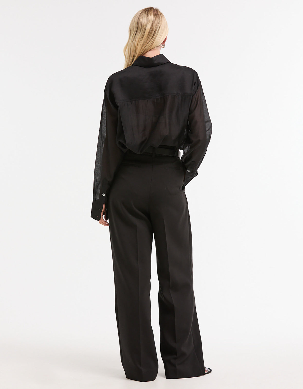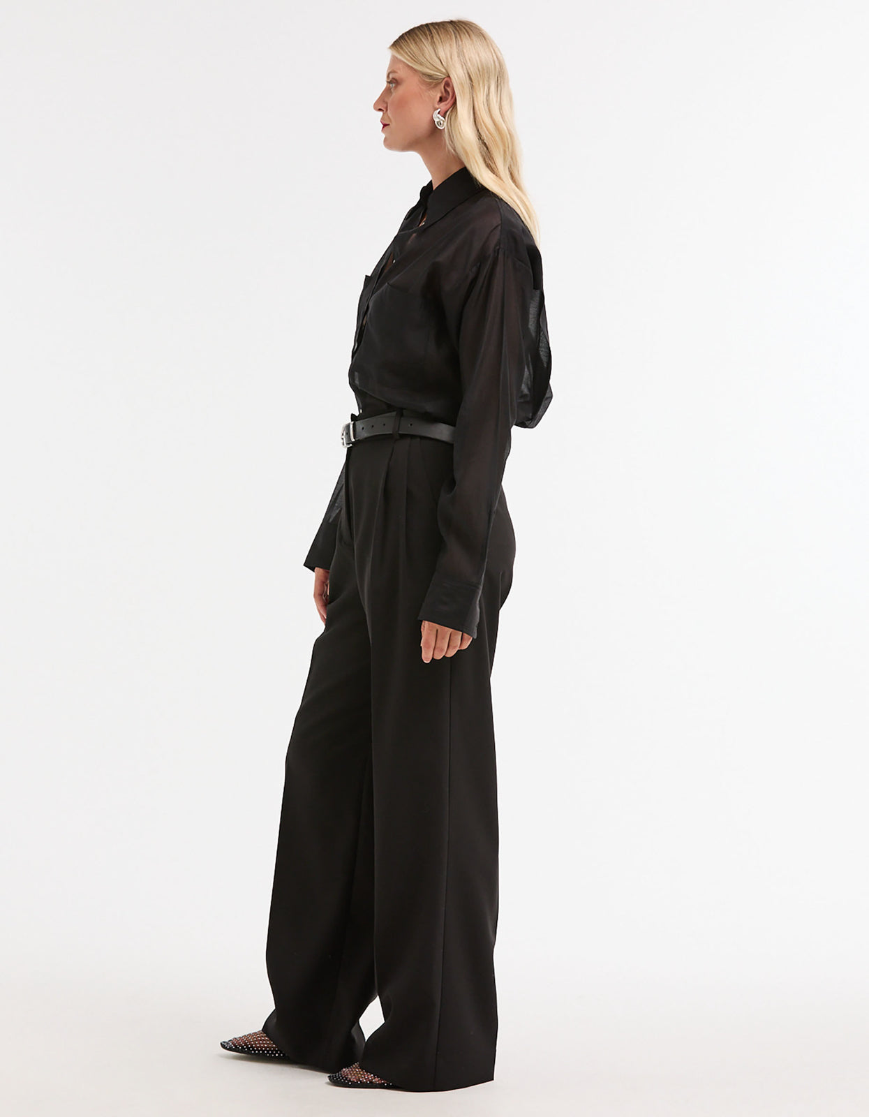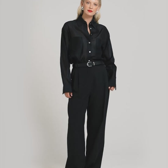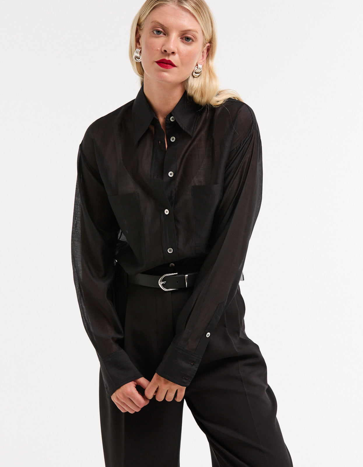 Crafted with a pointed collar, front chest pockets, and a button-up closure featuring elegant shell buttons, the Payson Shirt offers effortless style and sophistication. Made from sheer black fabric, this shirt boasts a curved hemline that enhances its chic appeal. The back yoke design ensures a tailored fit, providing a polished and refined look perfect for any occasion.