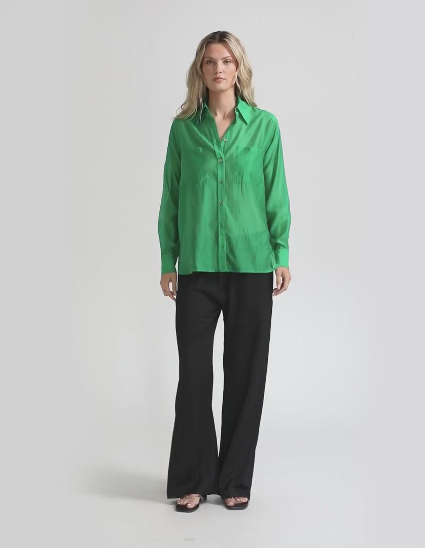 Cut in our bestselling Payson Shirt, this version in crisp green delivers understated elegance through its oversized cut and refined details. Featuring a pointed collar, button-down front, and full-length sleeves with tailored cuffs, this versatile piece transitions seamlessly across your wardrobe. Wear it loose over denim for casual ease, half-tucked with tailoring for polished sophistication, or layered open as a lightweight layer.