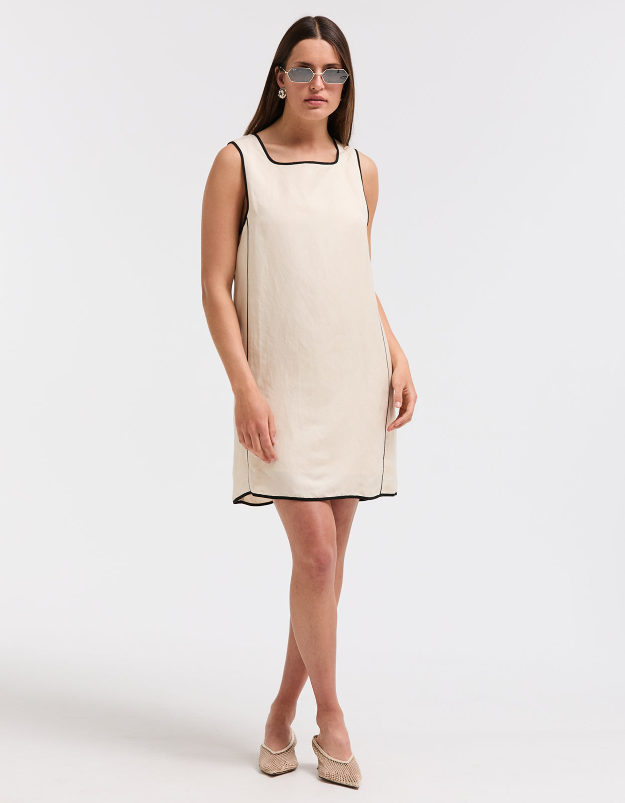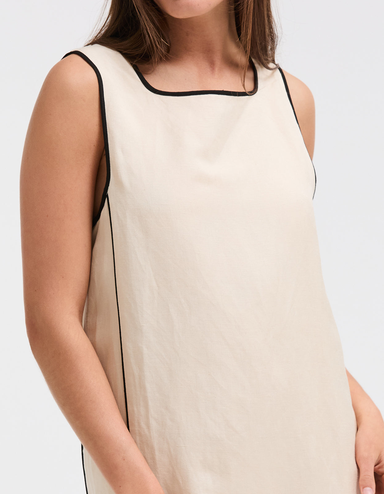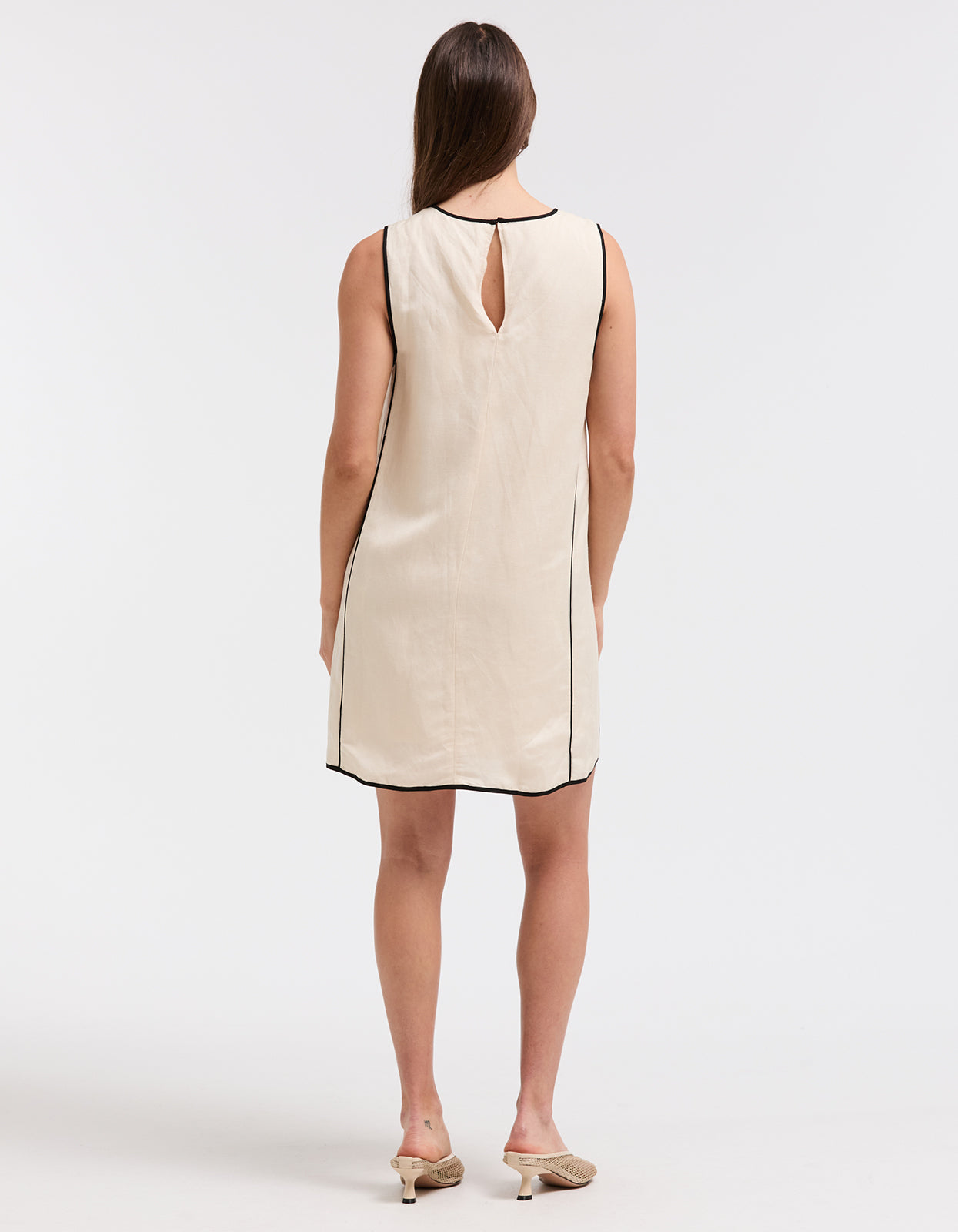 This linen blend shift is very of the moment for 2024 spring fashion. Featuring contrast detailing and a mini length, this dress exudes sophistication and charm. Perfect for any occasion, this dress is a must-have for any fashion-forward individual looking to make a statement.