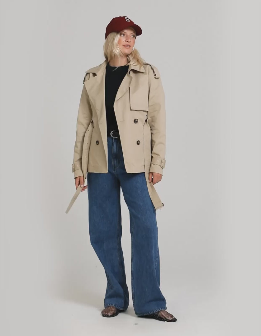 Elevate your wardrobe with the Smith Short Trench in Beige from Superette.