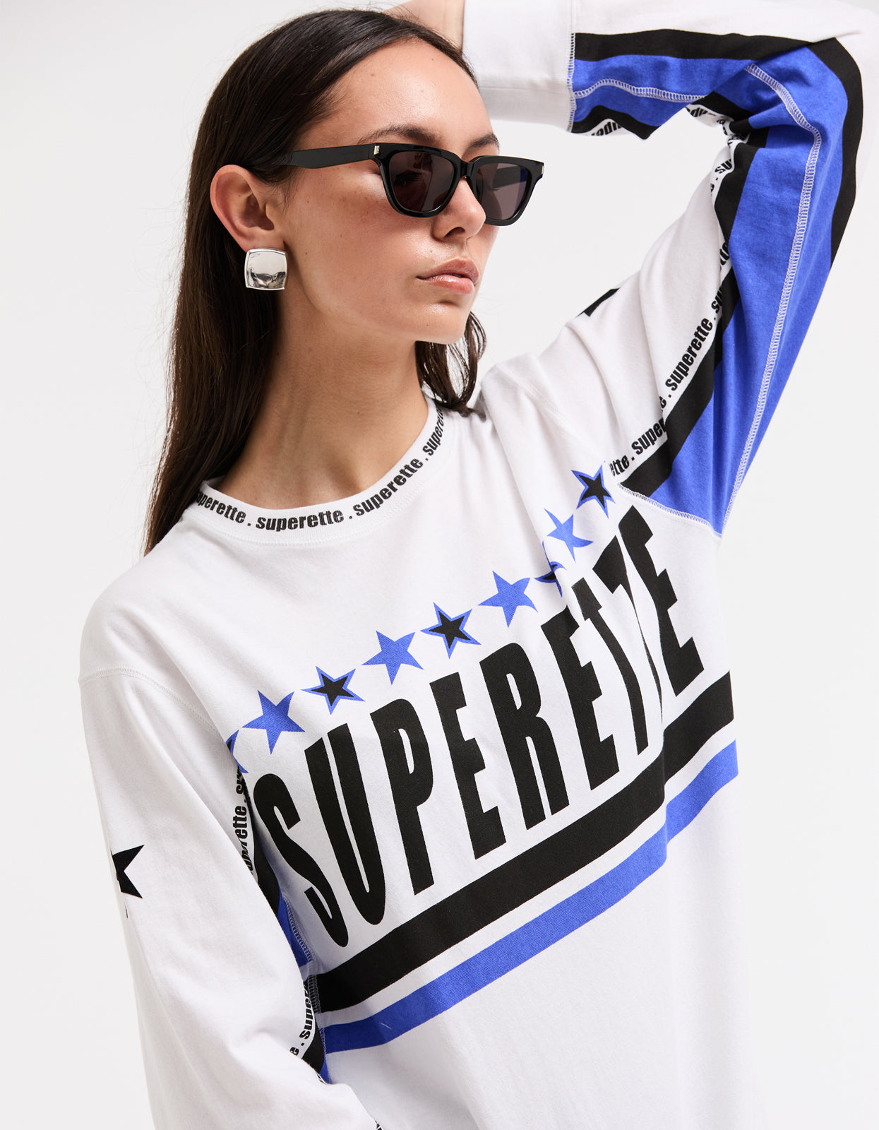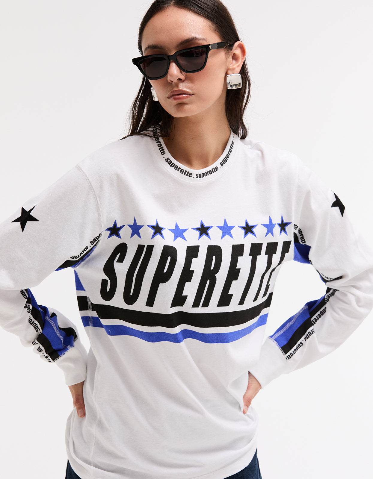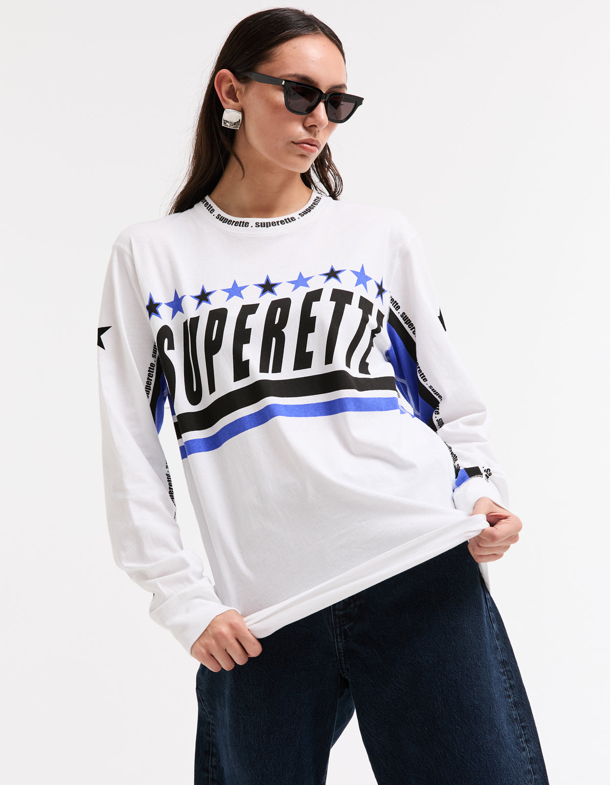 Infused with the spirit of motocross, this white tee combines sleek design with striking graphic prints on both the front and back. The black and blue accents evoke a sense of dynamic motion, while the long sleeves with cuff detailing offer a refined, tailored silhouette. Finished with subtle Superette branding along the collar and a sophisticated screen-printed graphic throughout, this tee embodies a perfect balance of performance-inspired edge and modern style.