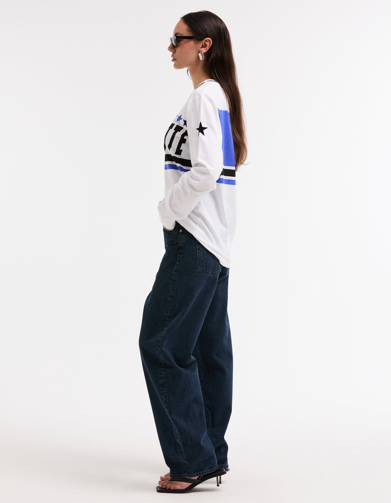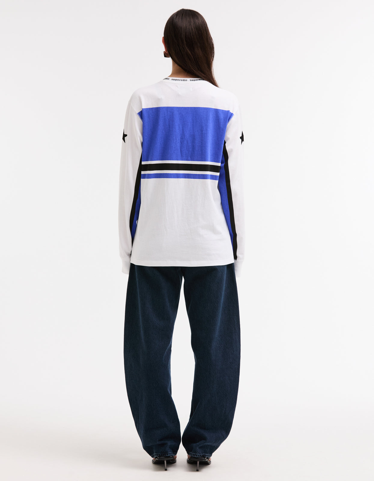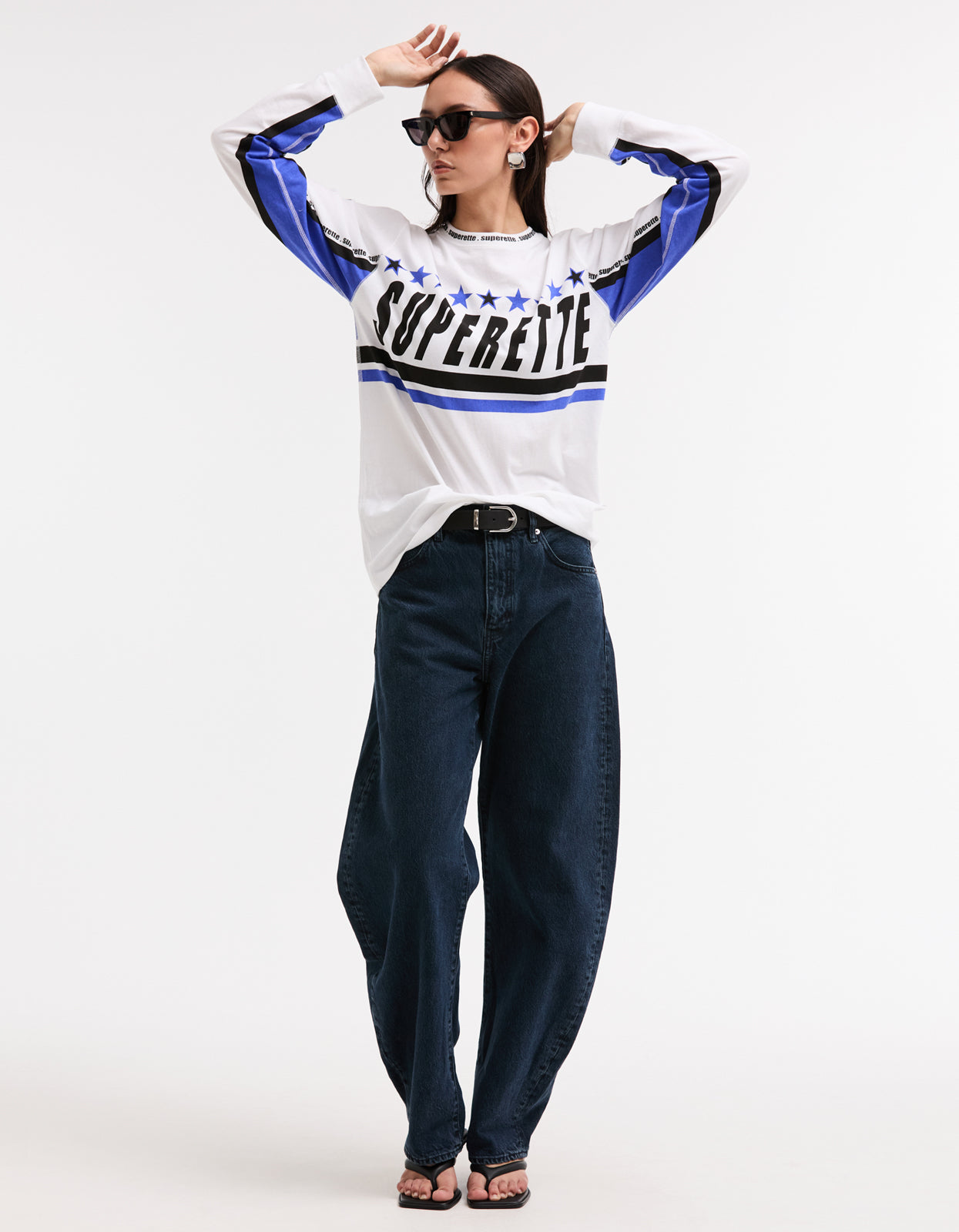 Infused with the spirit of motocross, this white tee combines sleek design with striking graphic prints on both the front and back. The black and blue accents evoke a sense of dynamic motion, while the long sleeves with cuff detailing offer a refined, tailored silhouette. Finished with subtle Superette branding along the collar and a sophisticated screen-printed graphic throughout, this tee embodies a perfect balance of performance-inspired edge and modern style.