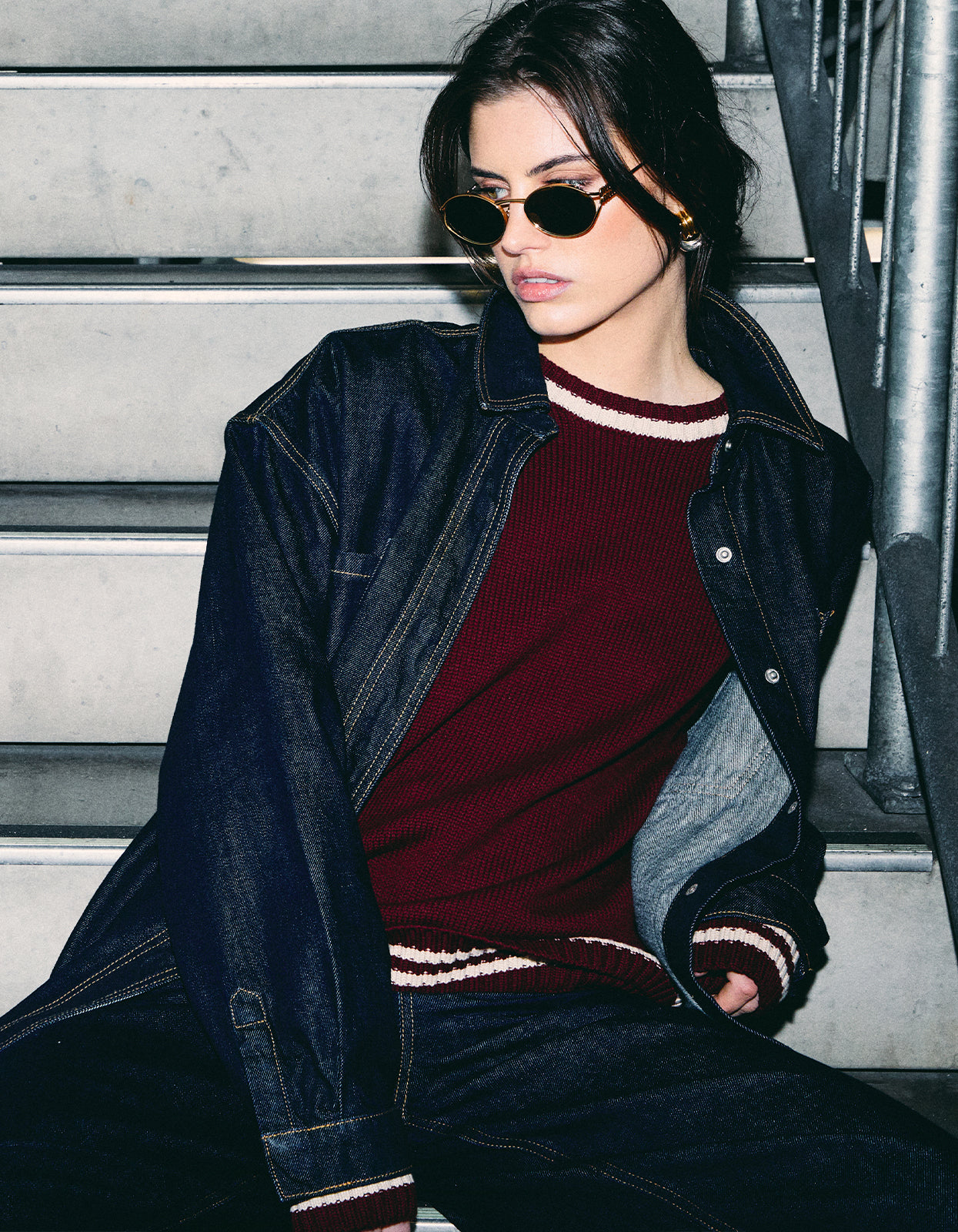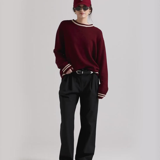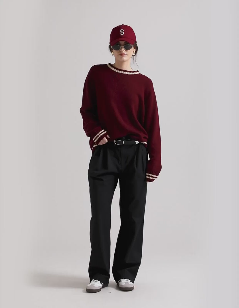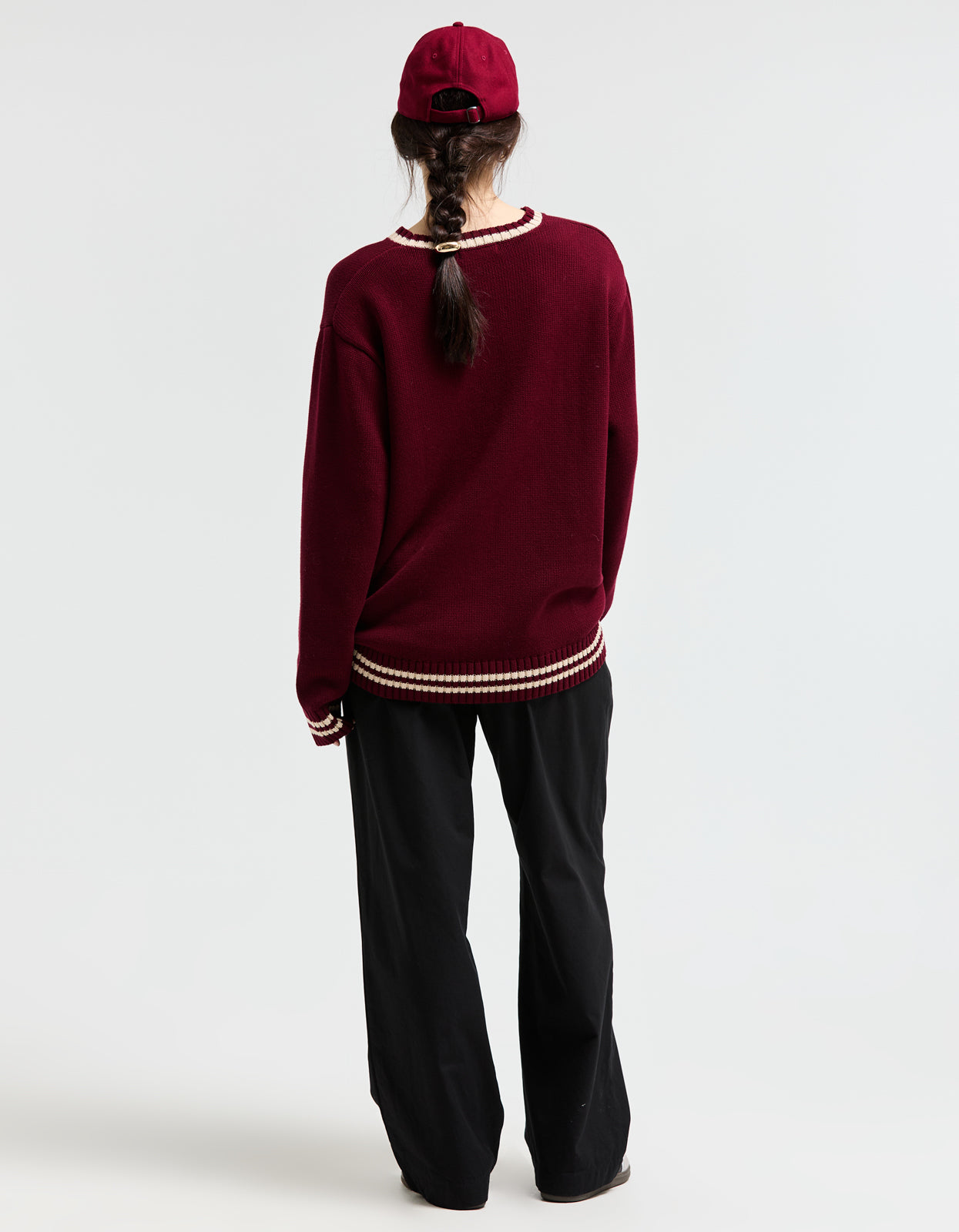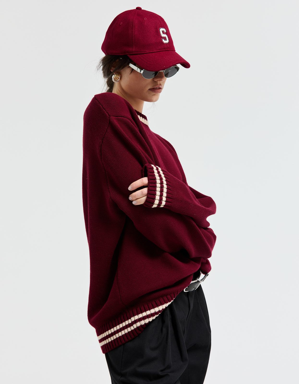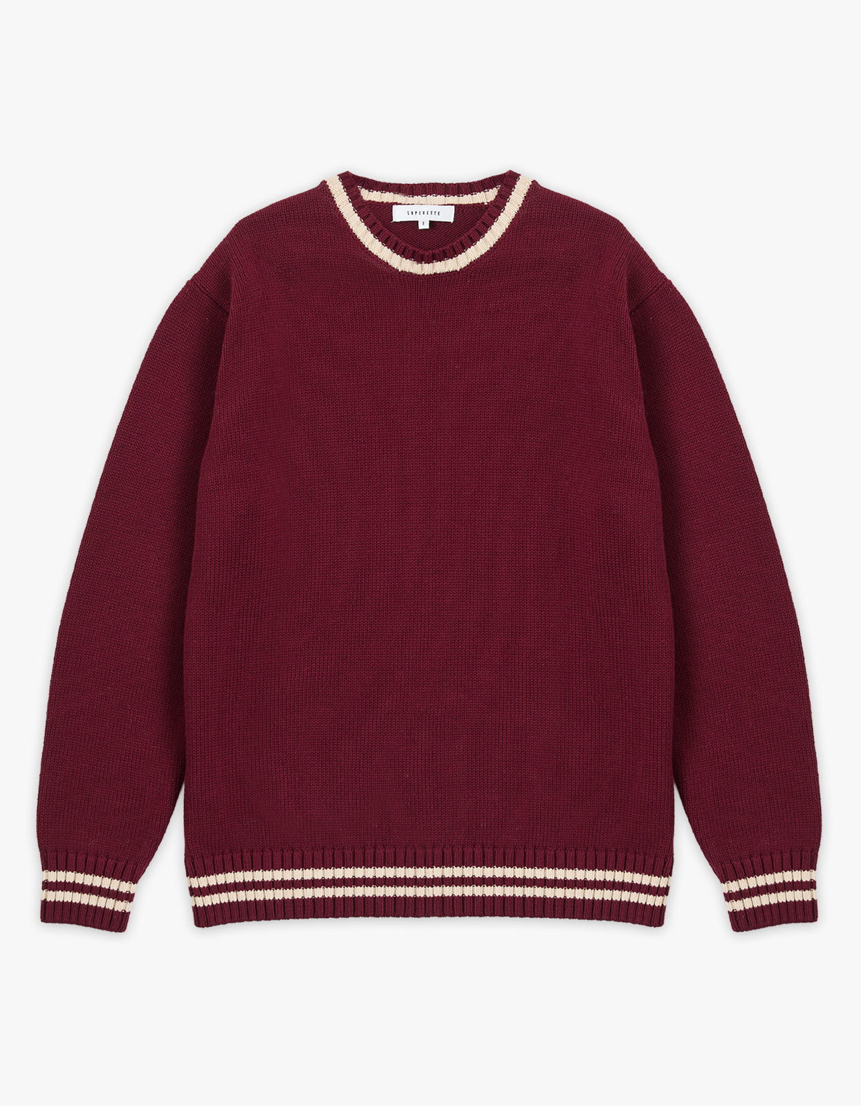 Crafted in a rich, textural knit with subtle contrast stripes at the neckline, cuffs, and hem, this piece balances cosy comfort with considered detail. Whether layered over denim or styled with tailored trousers, it’s the kind of wardrobe staple that travels well and looks even better with time