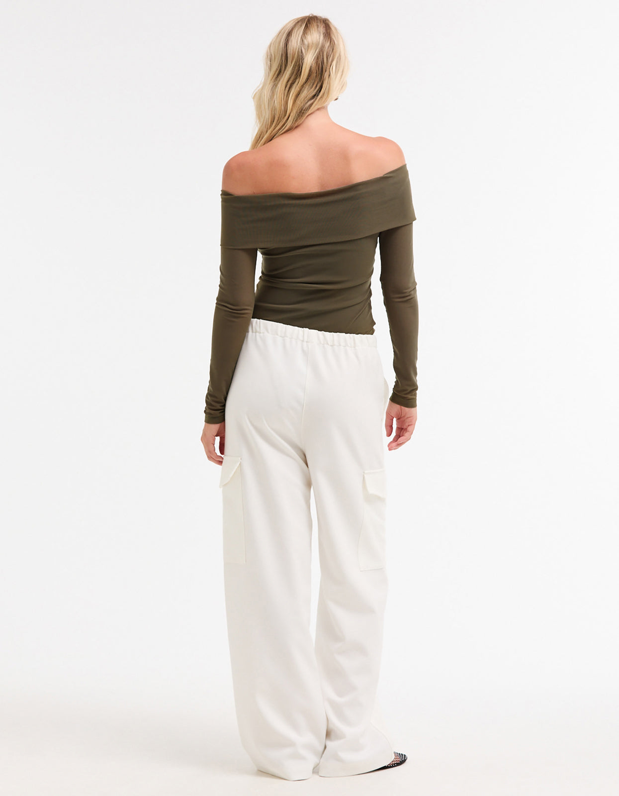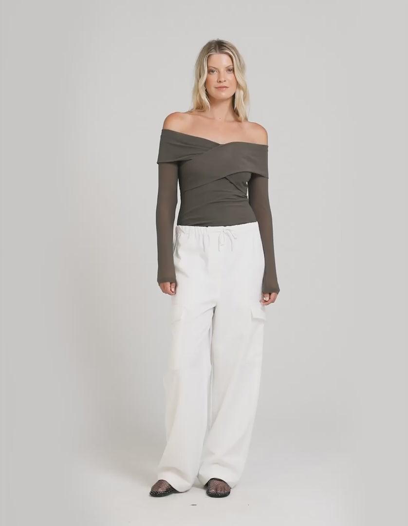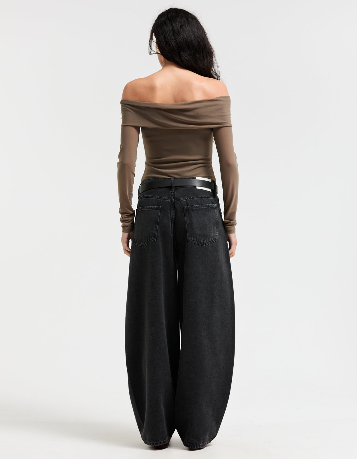 Designed with soft mesh fabric, this bodysuit highlights a graceful off-the-shoulder neckline and long sleeves. The snap crotch ensures both comfort and ease, making it the ultimate stylish yet practical piece.