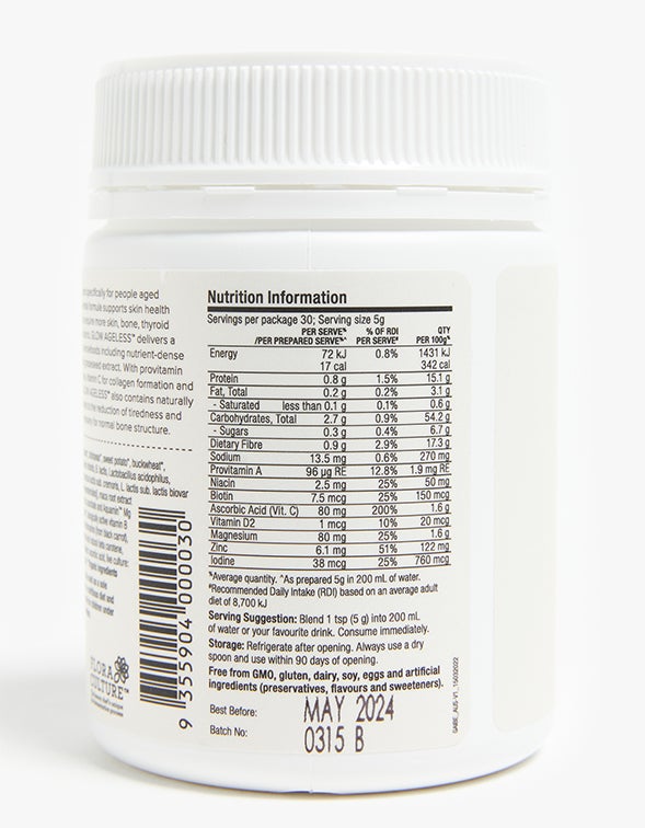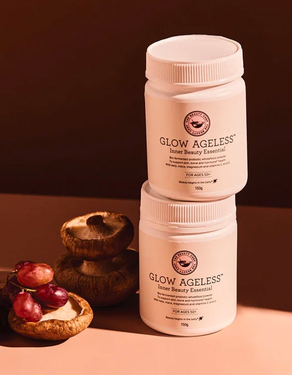 Treat yourself to the max with the Glow Ageless Inner Beauty Essential. A blend of age-supporting ingredients to promote glowing skin, healthy hair and nails, gut health and energy. As we age, our bodies require more skin, bone, thyroid and antioxidant support to maintain and improve general wellbeing. A combination of prebiotics, probiotics and postbiotics, as well as iodine, magnesium and vitamins C and D - Will ensure you glow quite literally from the inside out with all the desired and required nutrients.