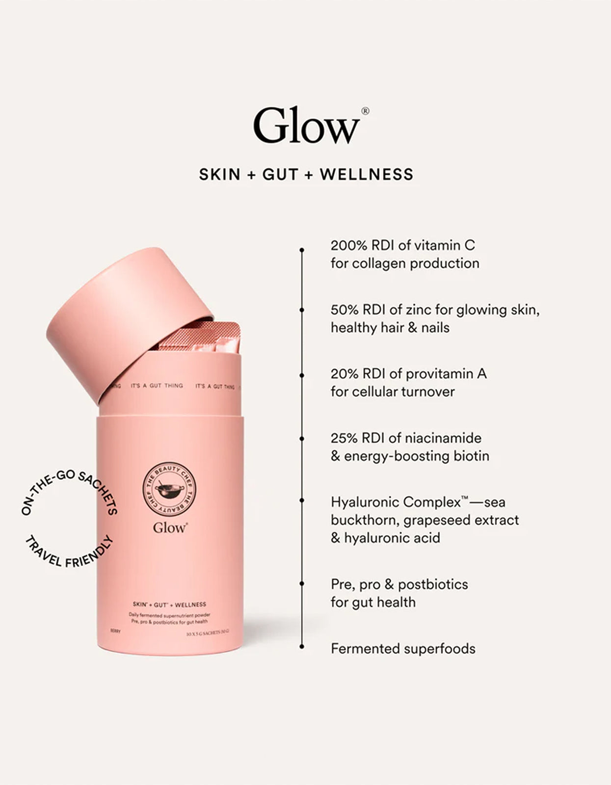 Deliver a daily dose of fermented superfoods, probiotics, and nutrients for radiant, hydrated skin—anytime, anywhere- with Glow Sachets by The Beauty Chef.