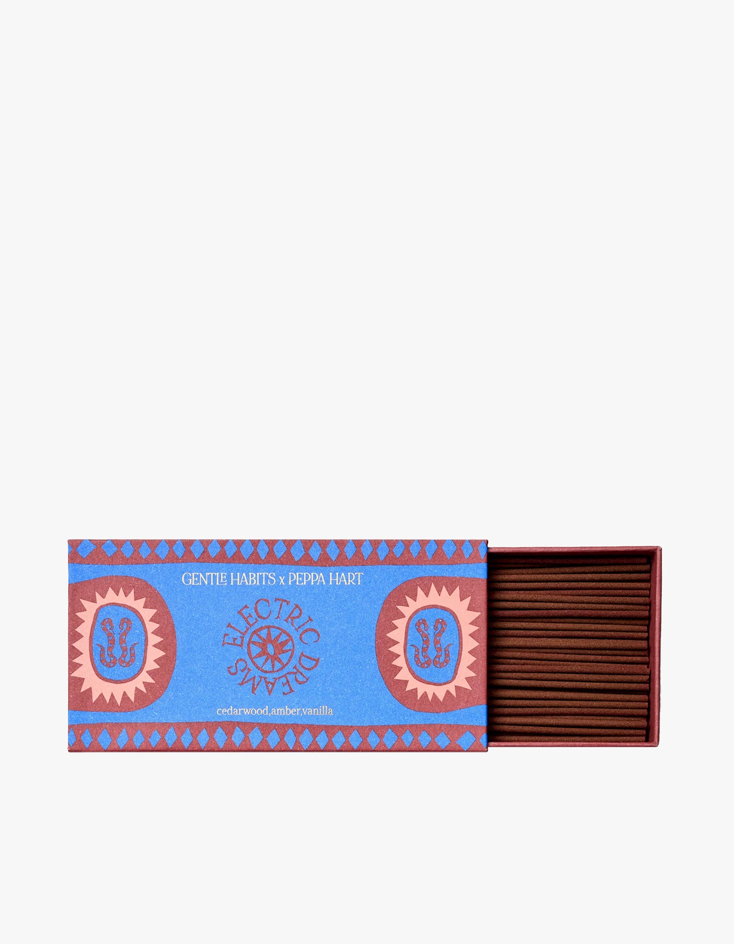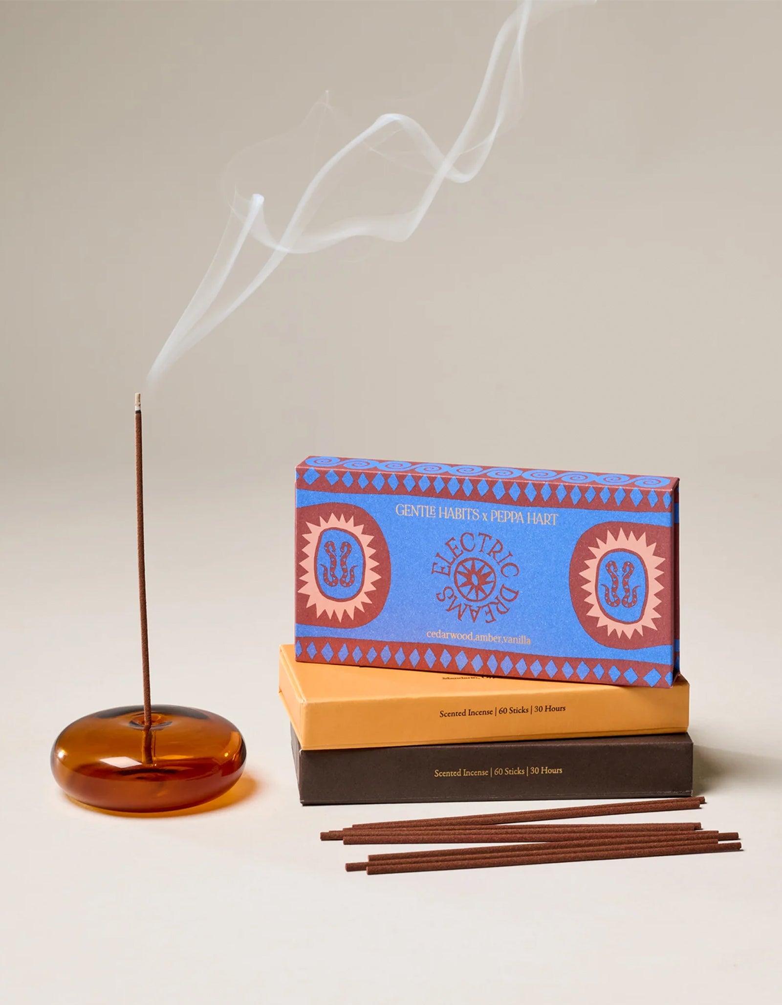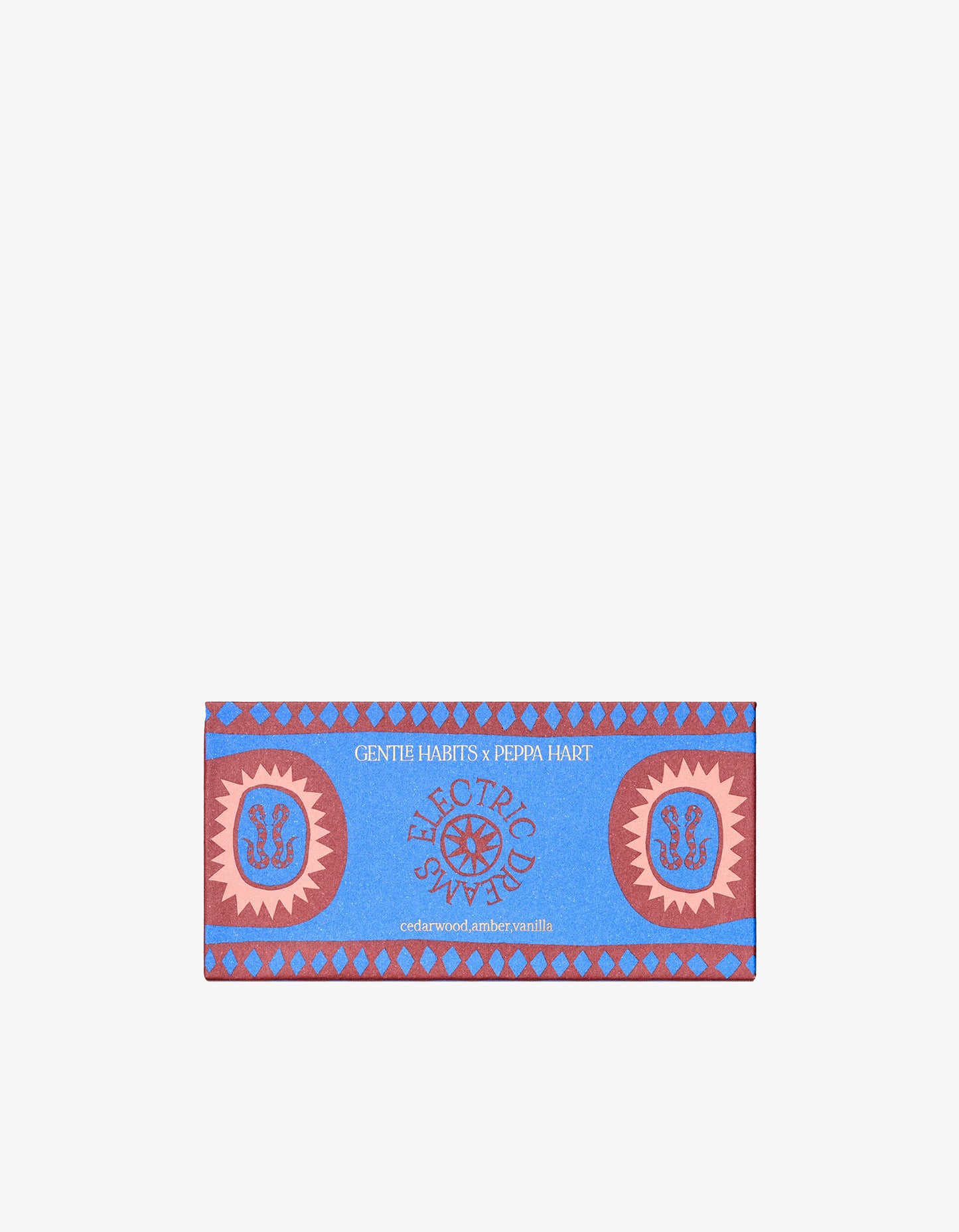 PEPPA HART ELECTRIC DREAMS: Amber, Cedarwood & VanillaOnce upon a time, there were two Sophies: Sophie Marshall, the visionary founder of This is Incense by Gentle Habits, and Sophie Bell, the creative force behind Peppa Hart, a bespoke design agency. Both embarked on journeys to pursue their unique Electric Dreams. Together, they unveil a special collaboration: This is Incense x Peppa Hart. These incense sticks features warm and woody aromas with base notes of cedarwood, amber, and vanilla, complemented by heart notes of spicy vetiver and top notes of fresh bergamot. Illuminate your Electric Dreams incense to enter a creative space, reflecting on your journey and embracing your achievements.