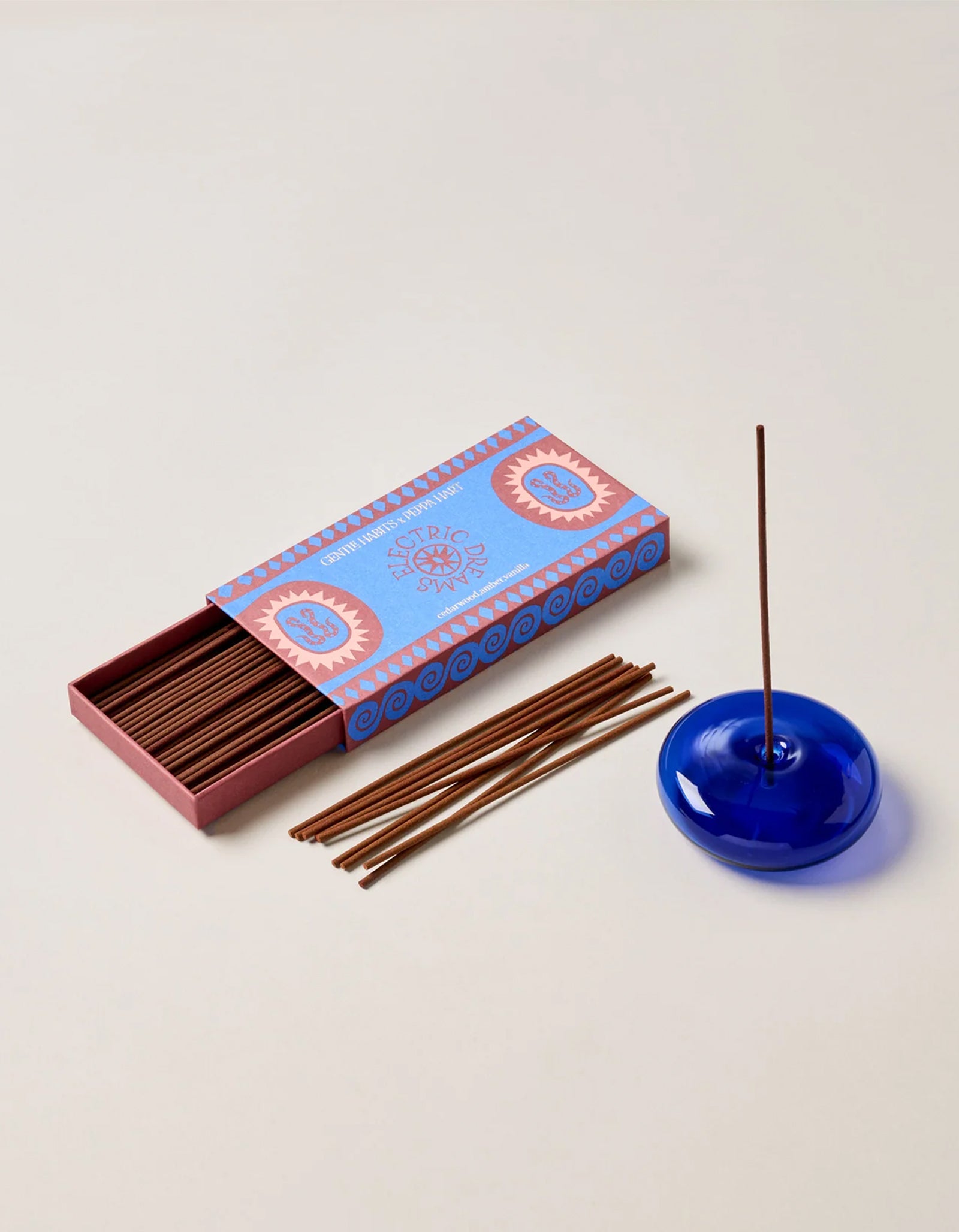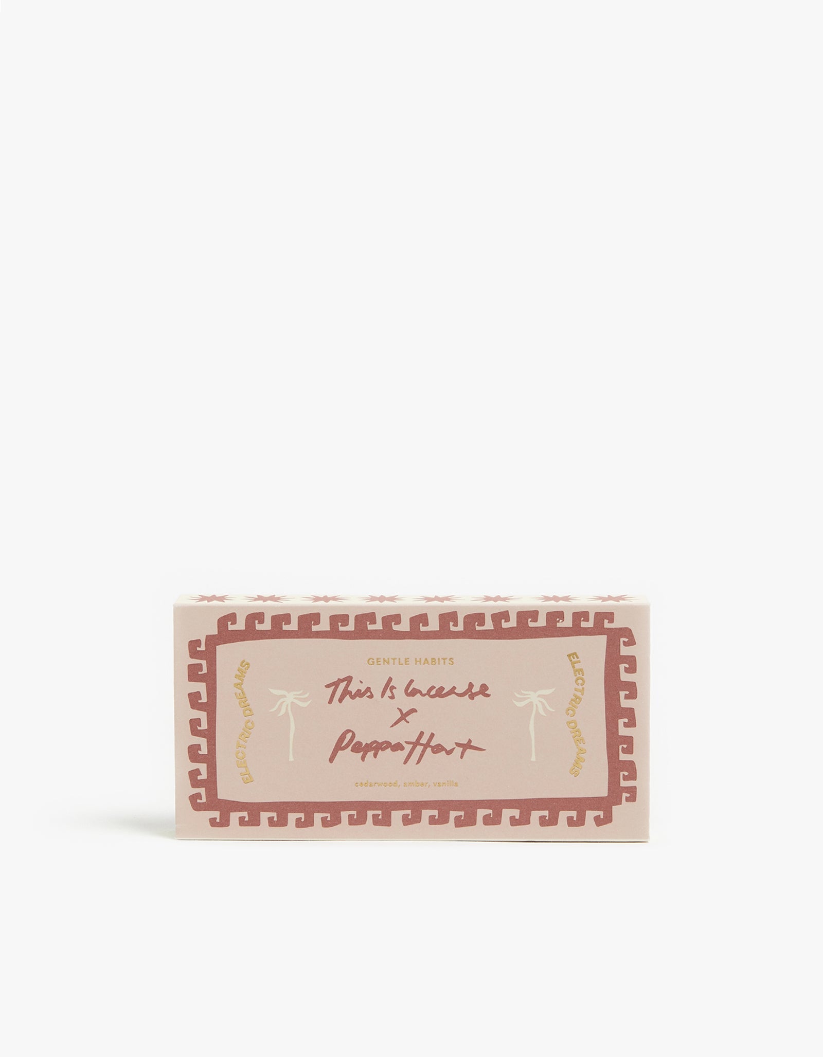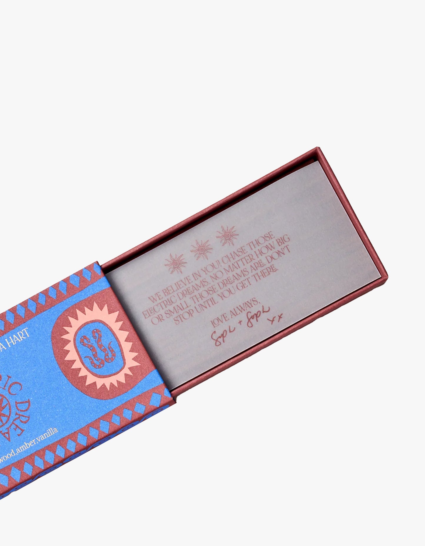 PEPPA HART ELECTRIC DREAMS: Amber, Cedarwood & VanillaOnce upon a time, there were two Sophies: Sophie Marshall, the visionary founder of This is Incense by Gentle Habits, and Sophie Bell, the creative force behind Peppa Hart, a bespoke design agency. Both embarked on journeys to pursue their unique Electric Dreams. Together, they unveil a special collaboration: This is Incense x Peppa Hart. These incense sticks features warm and woody aromas with base notes of cedarwood, amber, and vanilla, complemented by heart notes of spicy vetiver and top notes of fresh bergamot. Illuminate your Electric Dreams incense to enter a creative space, reflecting on your journey and embracing your achievements.