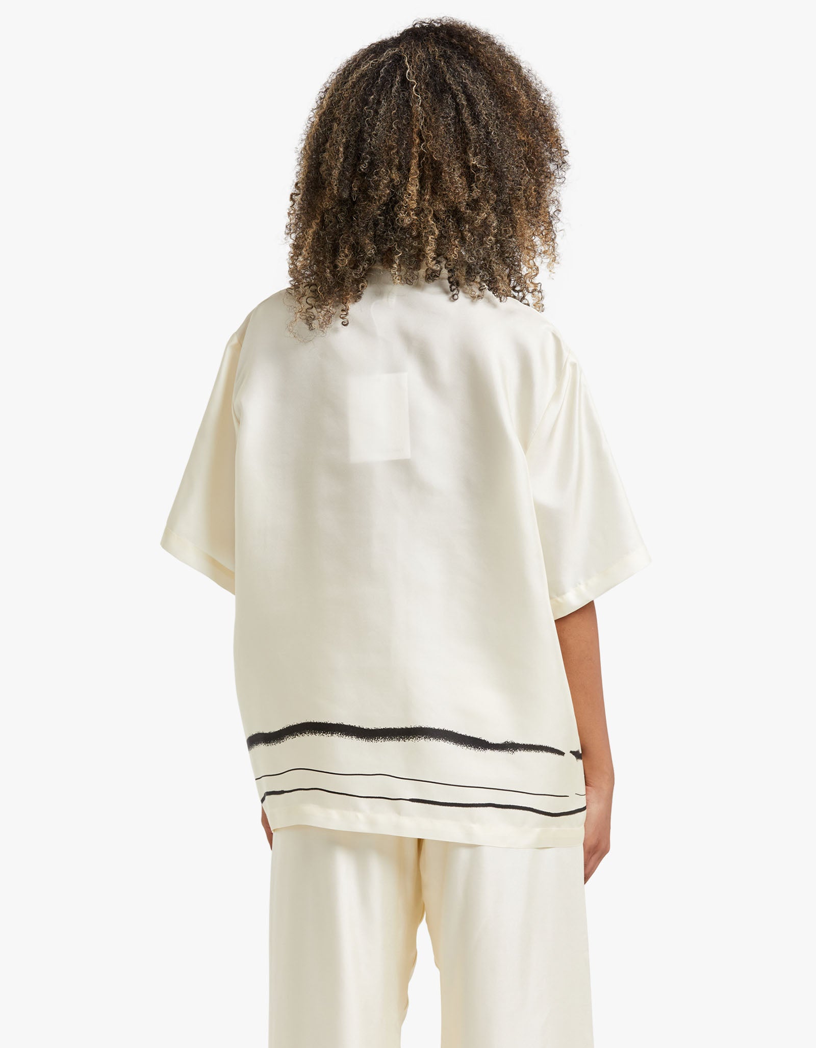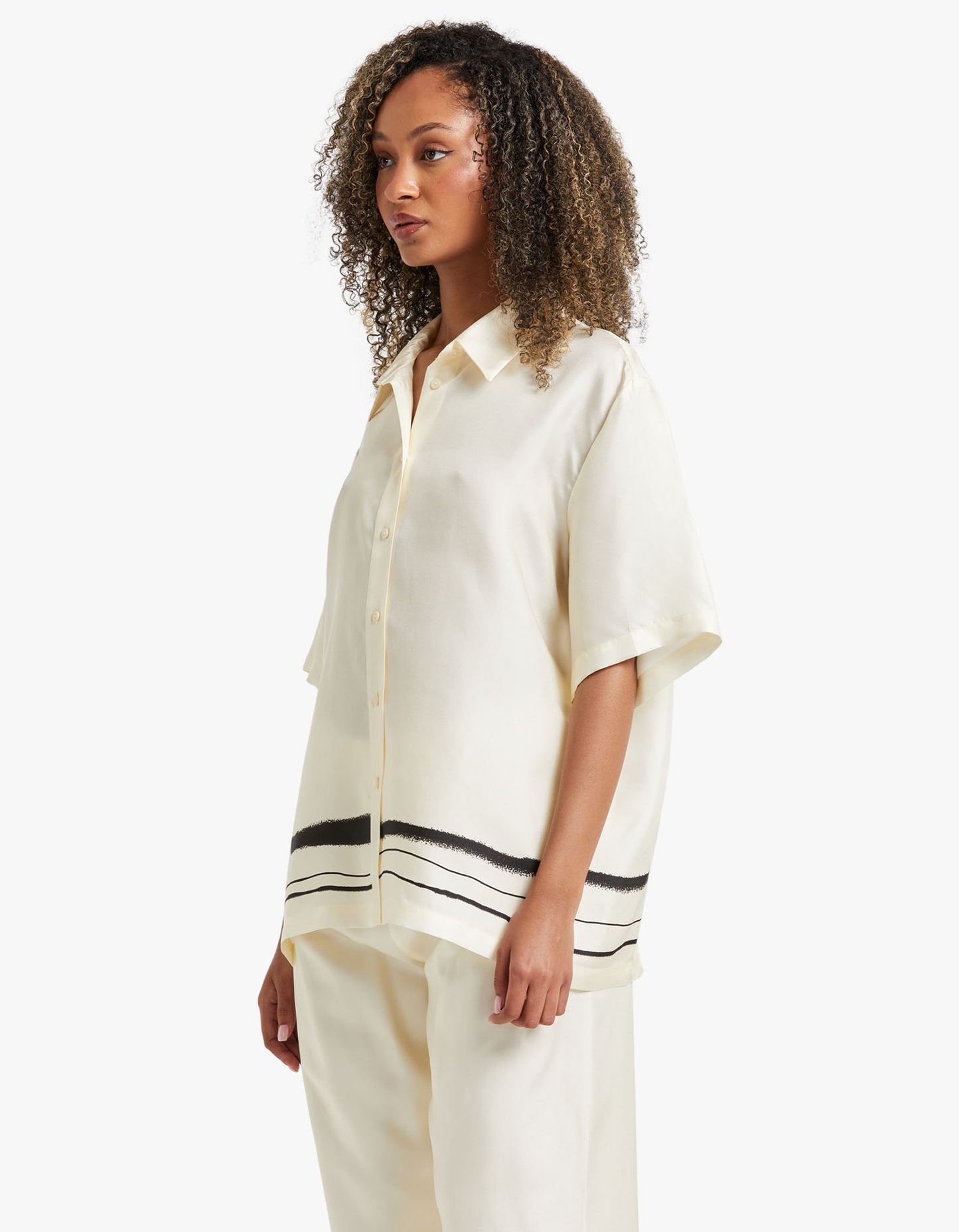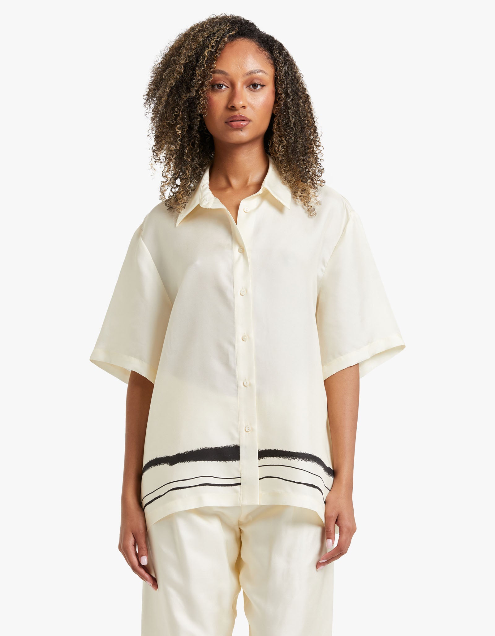 Achieve timeless elegance with the Viktoria and Woods Memoir Shirt. Its traditional collar and exposed button closure make it a classic, while the exclusive hand-painted stripe print along the hem adds a modern touch. Crafted from 100% silk, this shirt pairs beautifully with the Milestone Pant, creating a modern and sophisticated look.