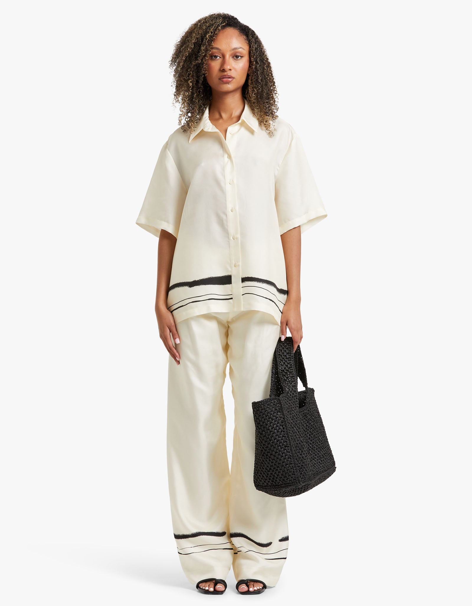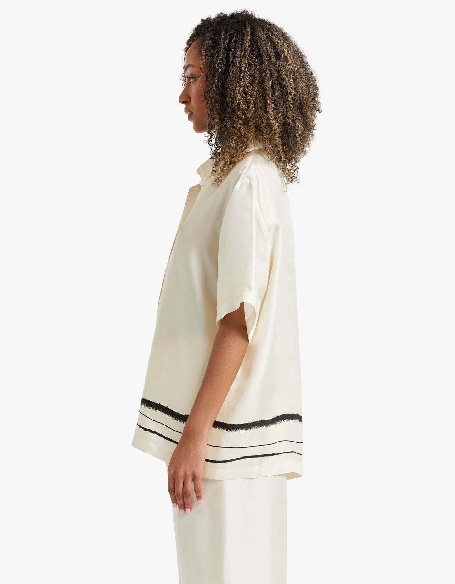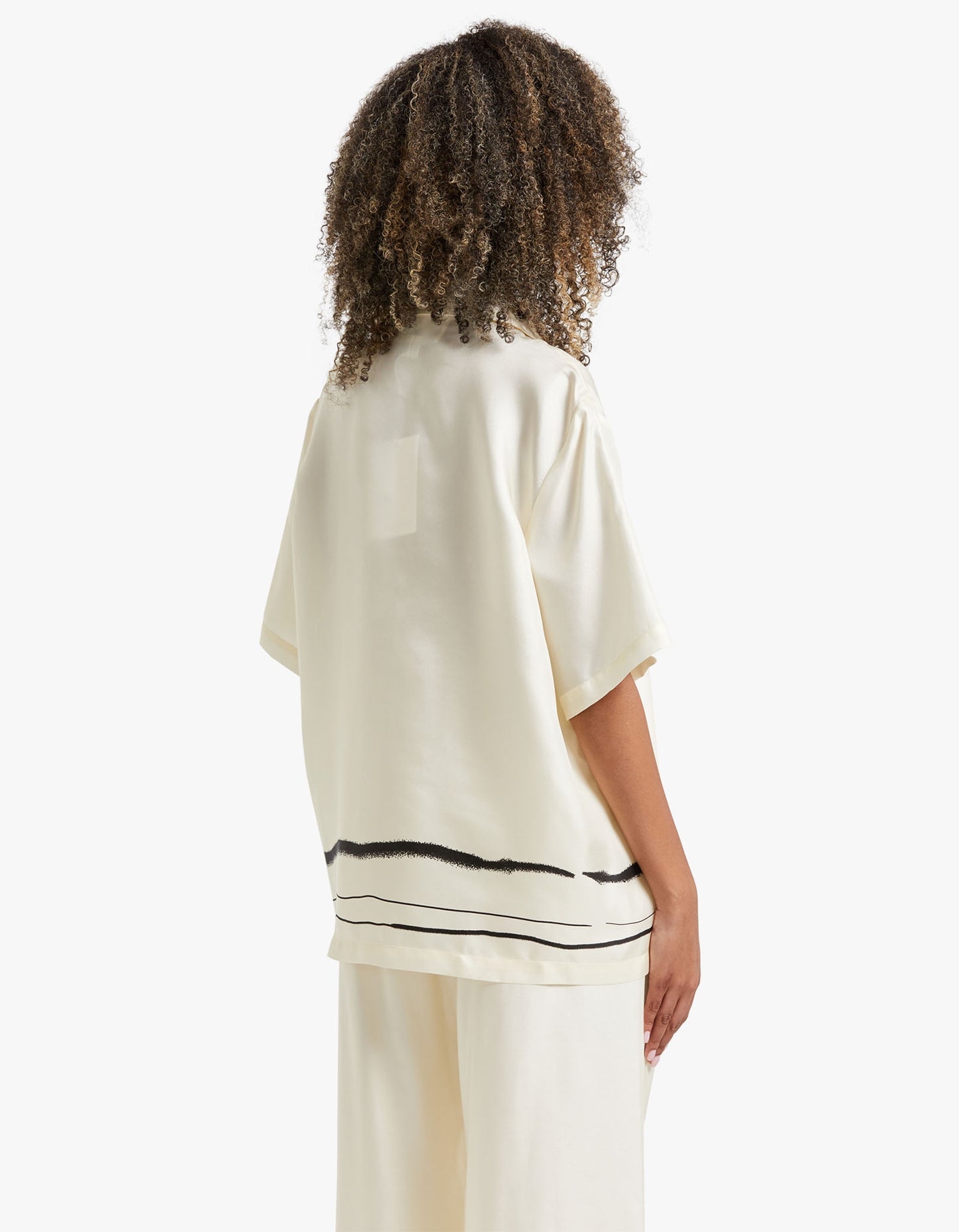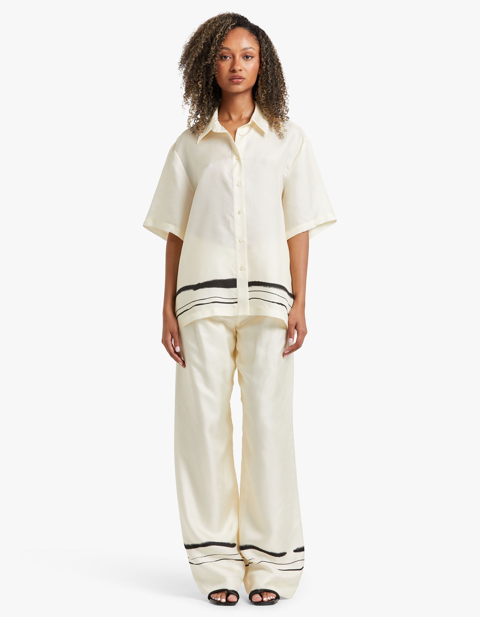 Achieve timeless elegance with the Viktoria and Woods Memoir Shirt. Its traditional collar and exposed button closure make it a classic, while the exclusive hand-painted stripe print along the hem adds a modern touch. Crafted from 100% silk, this shirt pairs beautifully with the Milestone Pant, creating a modern and sophisticated look.