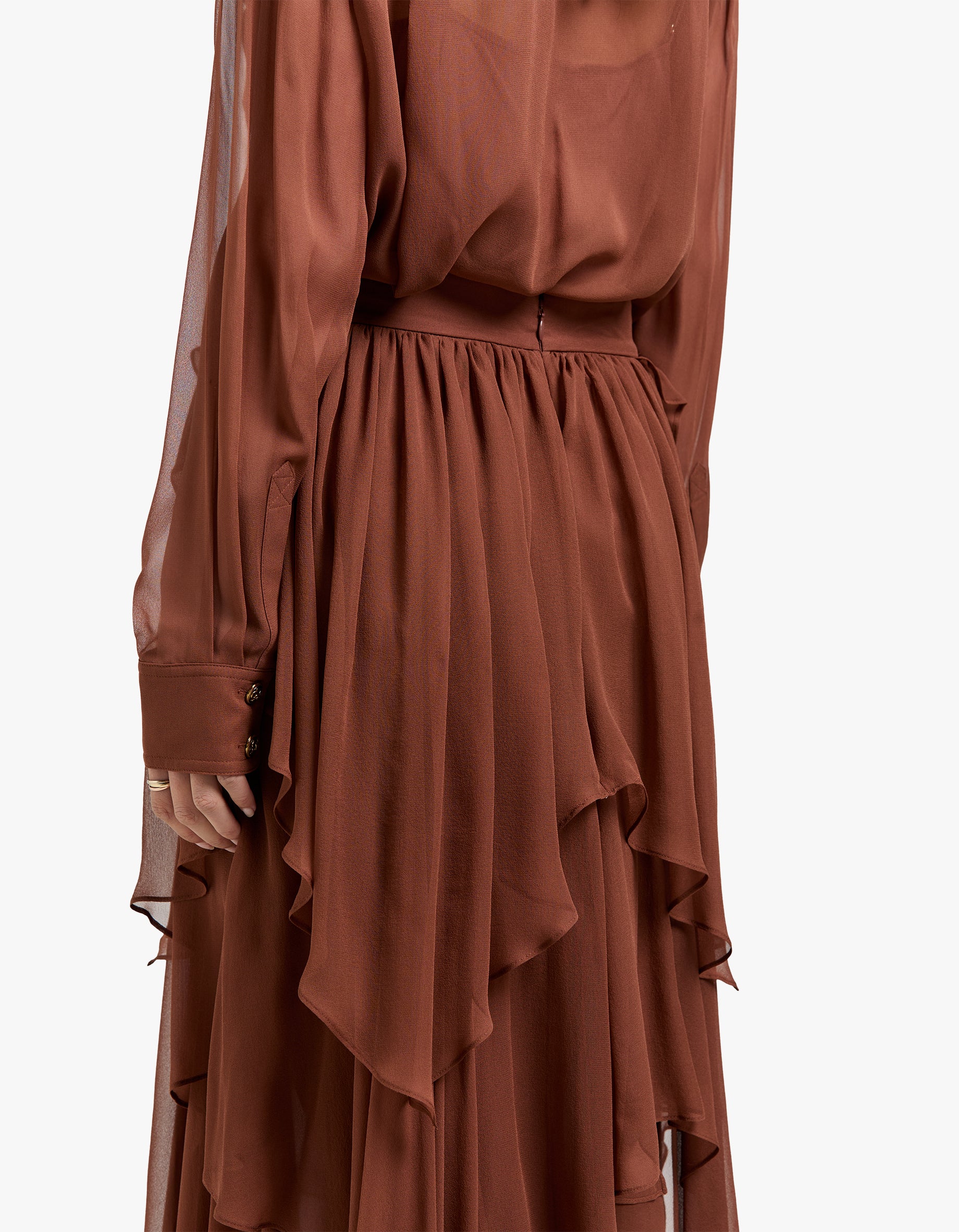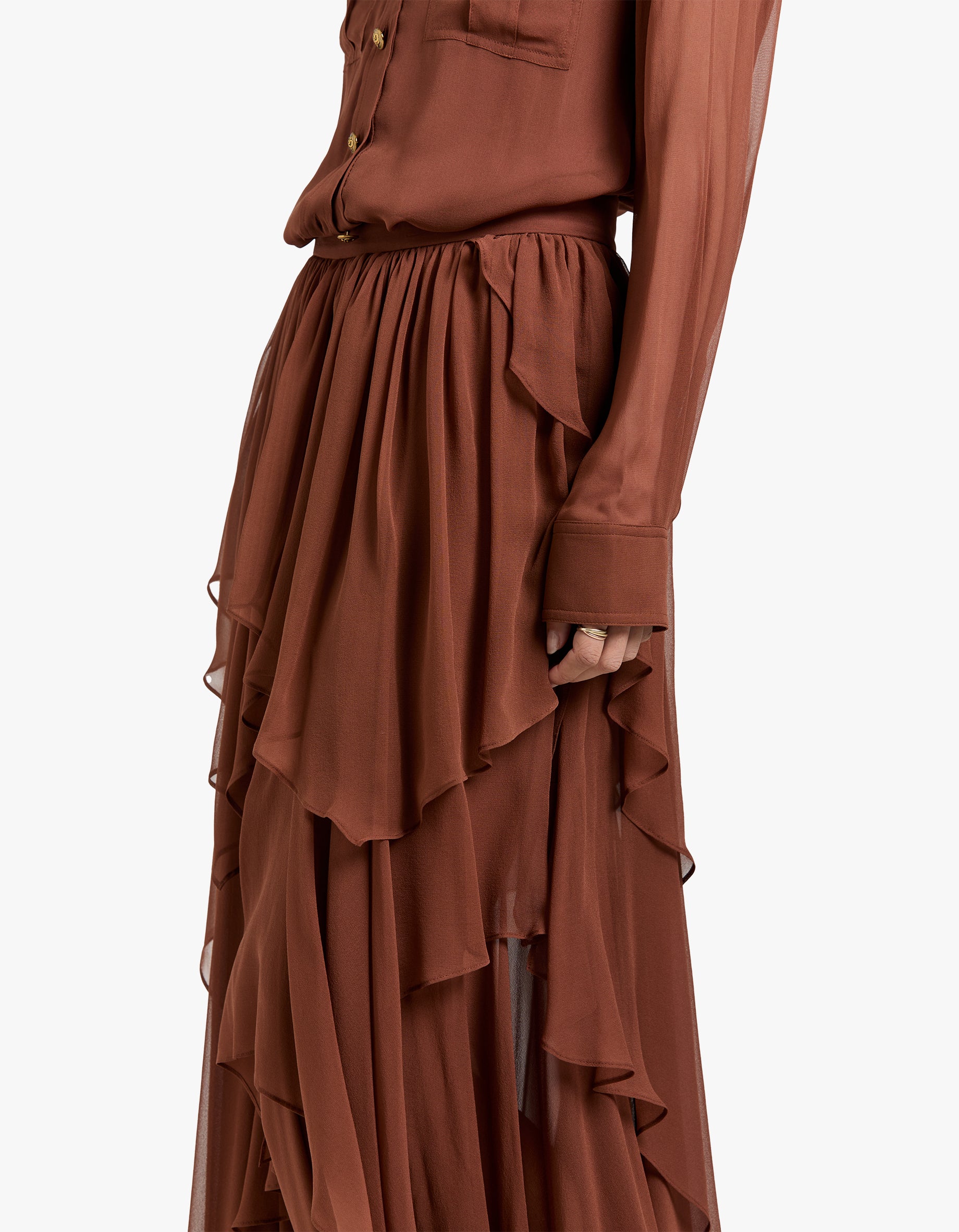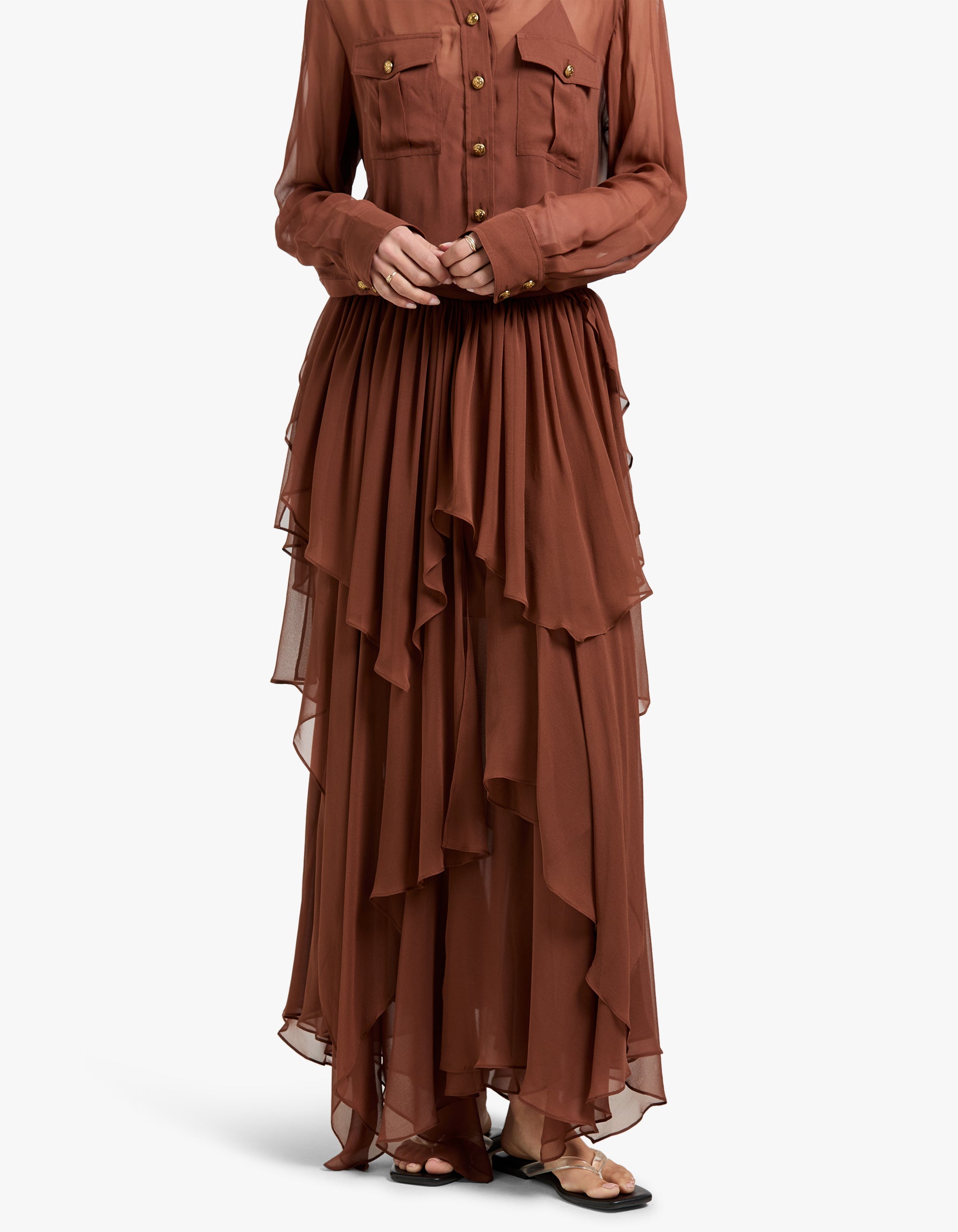Crafted from lightweight sheer chiffon, it features cascading asymmetric ruffles and a layered silhouette that drapes beautifully with every step. The high-rise waistband keeps things flattering, while the warm tan tone adds a grounded elegance to this ethereal style. Pair it with a fitted top or the matching blouse for an elevated take on everyday romanticism.