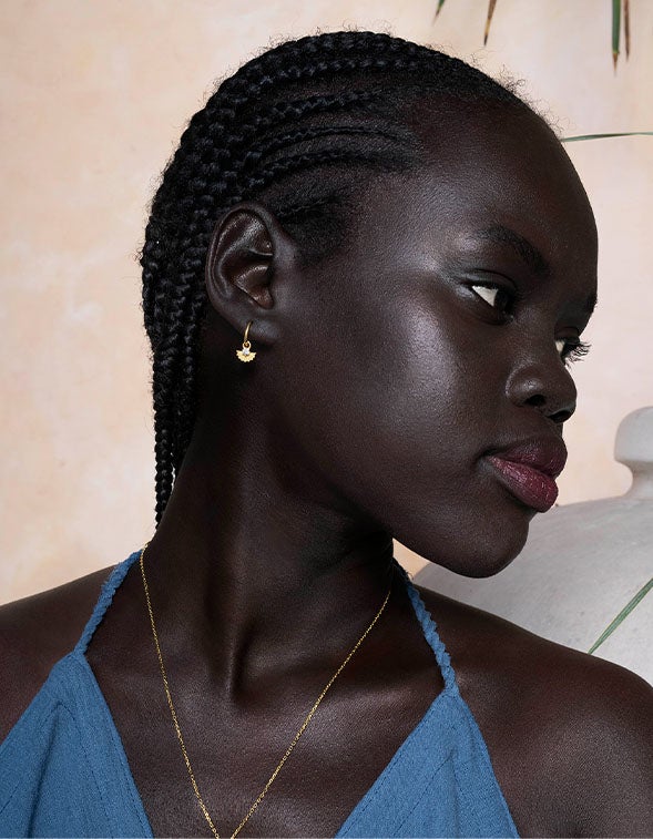 These earrings feature a delicate stone at the center of the pendant symbolizing the rising sun, while their texture reflects the transition from night sky hues to the soft colors of dawn.